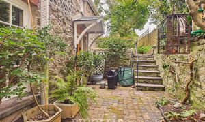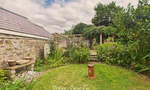 - Large stone storage shed at the rear of the garden, ideal for gardening or outdoor equipment.
