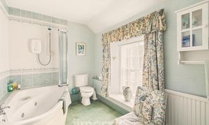 Sash window to side, wash hand basin, low level w.c, corner bath/jacuzzi with central taps and electric shower and bi fold shower screen over, tie splash back, radiator, wall lights.