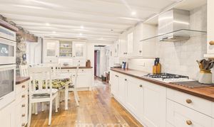 Sash window to side, pvc window to rear, wooden stable door to side leading out to courtyard, solid wood floor, a range of shaker style wall and base cabinets with solid wood work surface over, display dresser to match also, tile splash back, cupboard lighting, double sink with mixer tap over, integral 4 ring gas hob with extractor hood over, integral eye level oven and grill, radiator, spotlights, ceiling beams, feature stone wall.