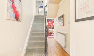 Solid wood flooring, radiator, stairs to first floor landing, under stairs storage cupboard, wall mounted shelf, doors leading off to reception rooms and dining room.
