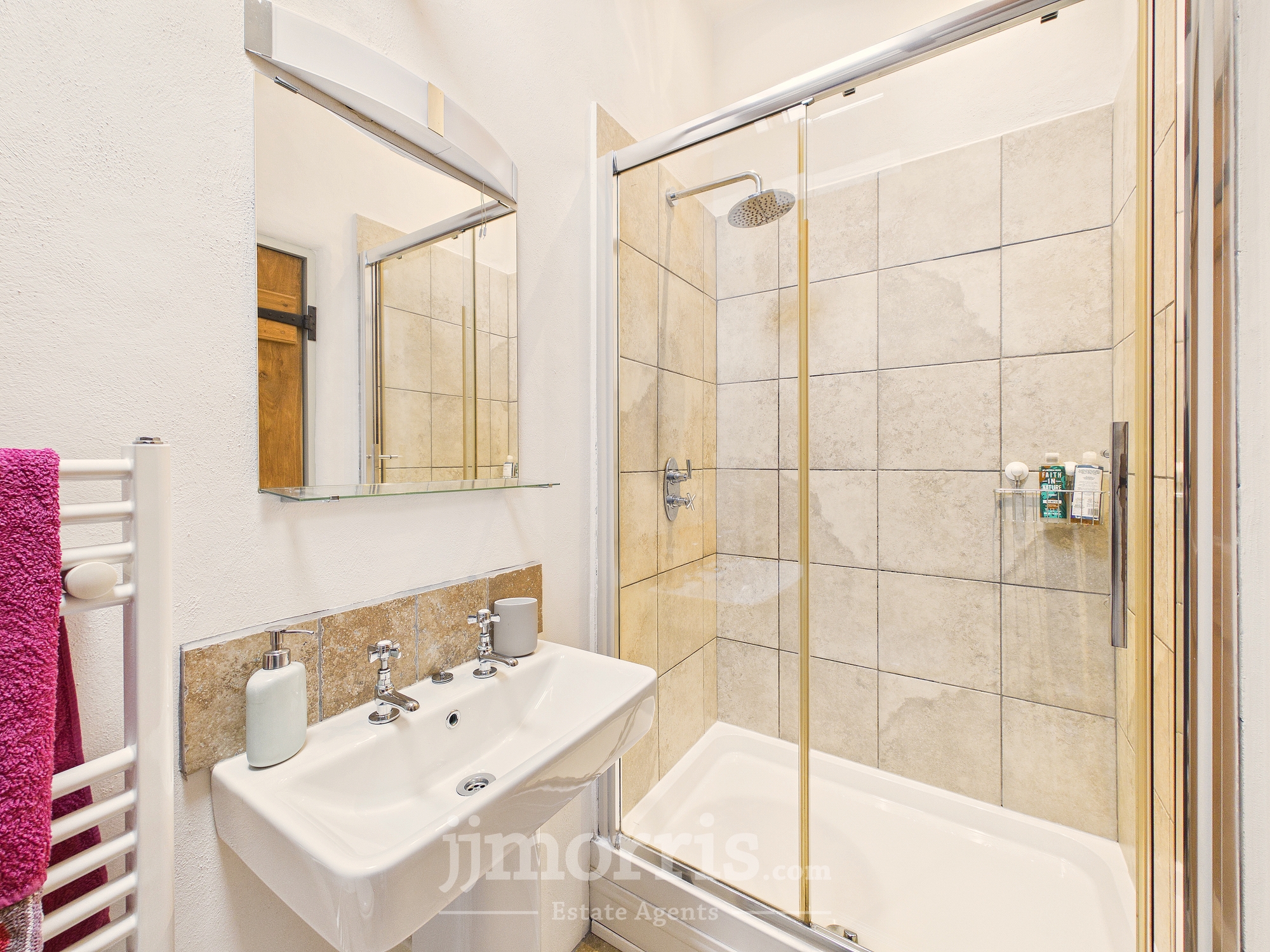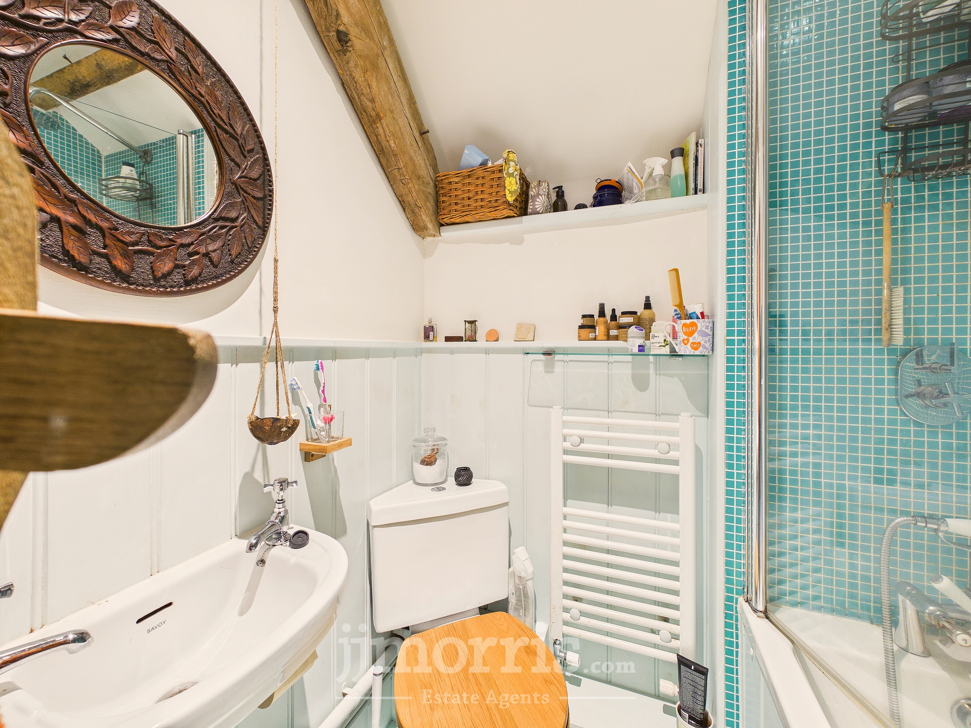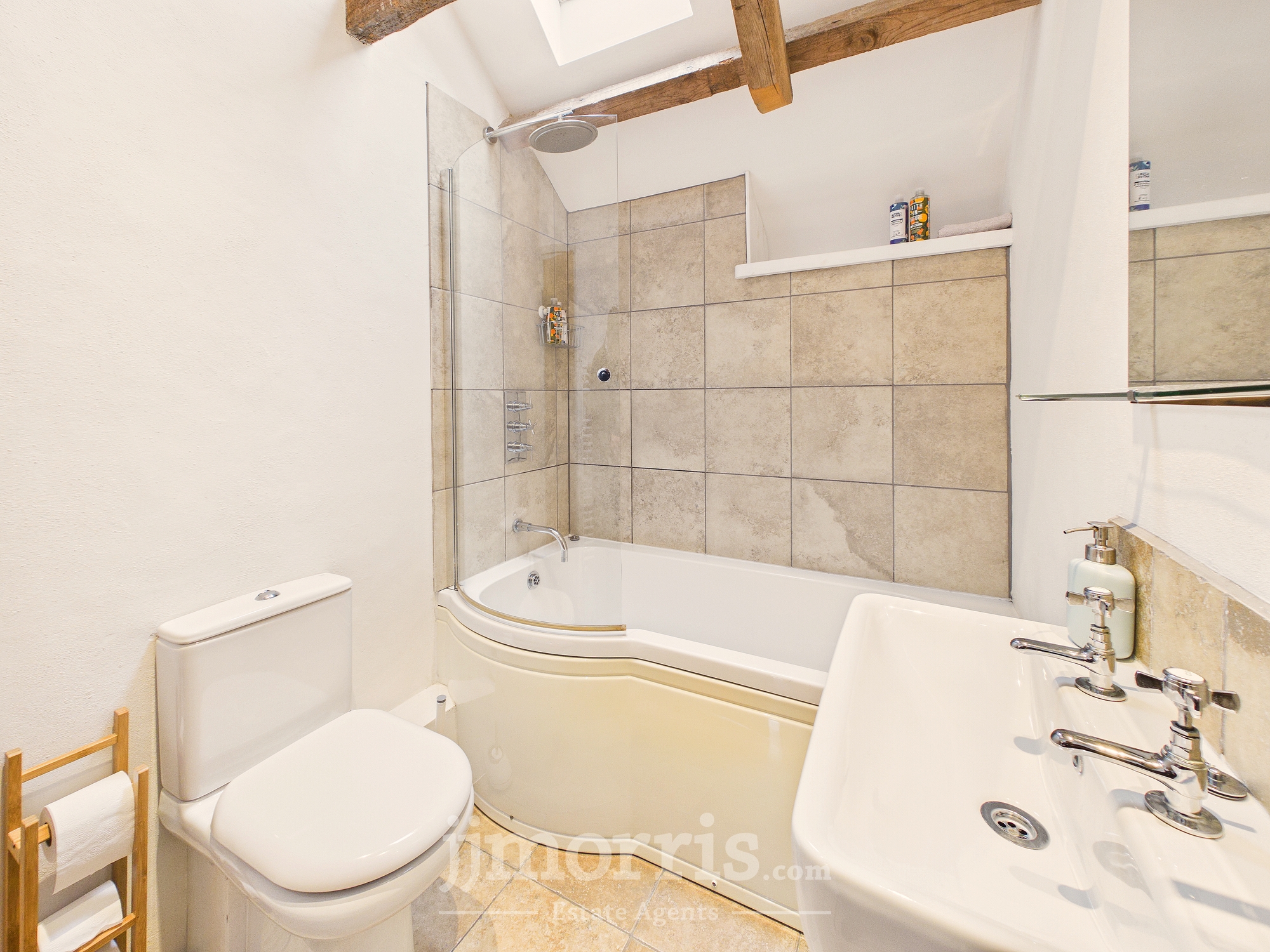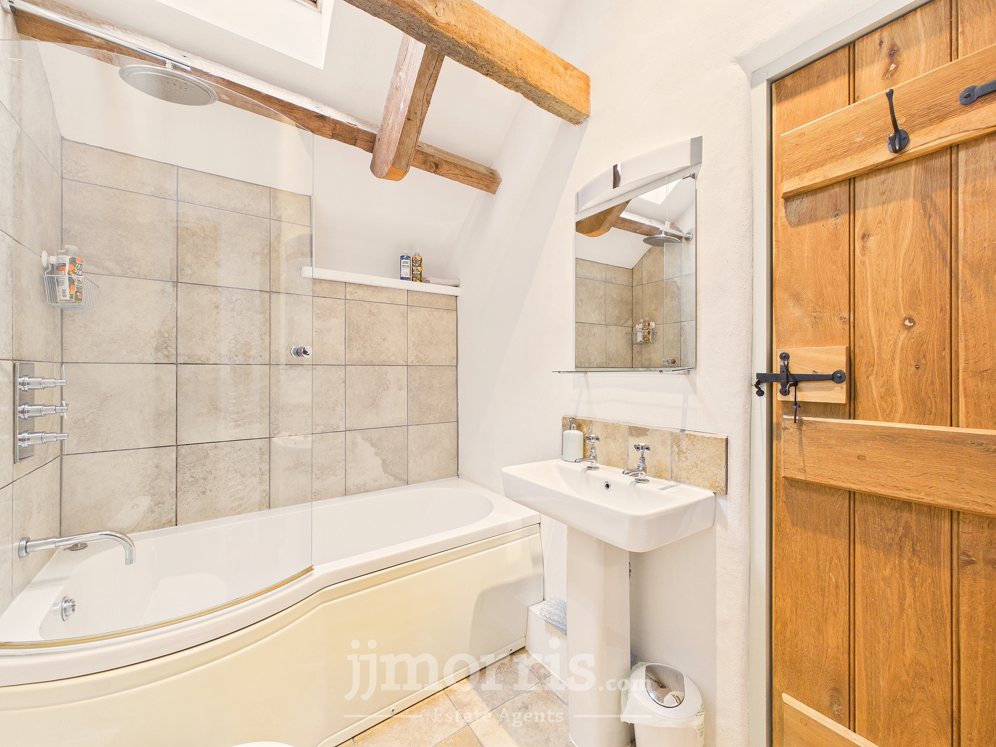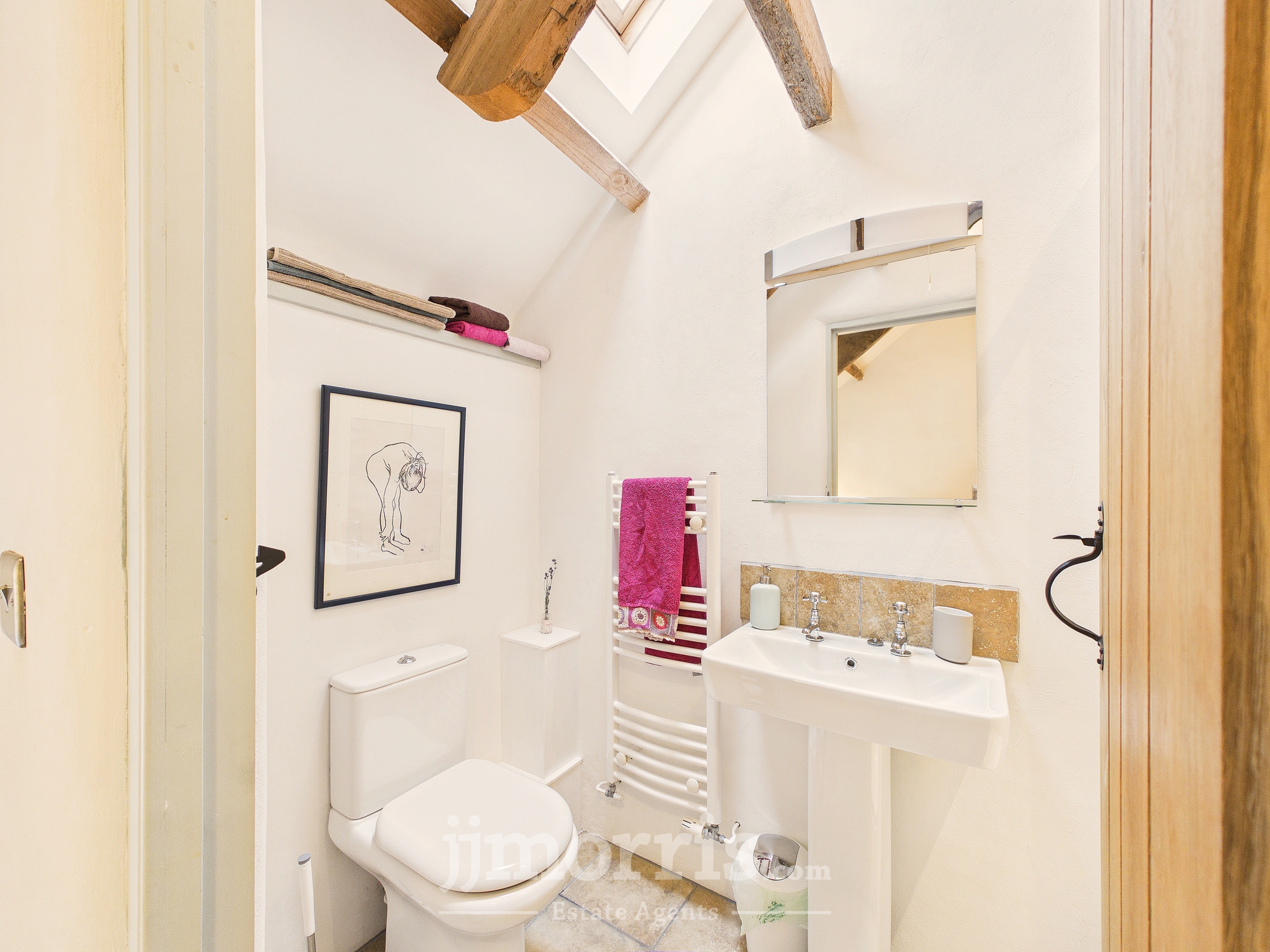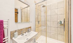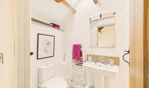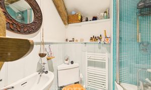 Double enclosure with tiled surround and rainfall showerhead, pedestal hand wash basin, heated towel rail, low flush WC, tiled floor, exposed beams, Velux window, extractor fan. Mirror and shaver socket/light.