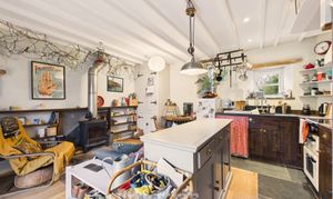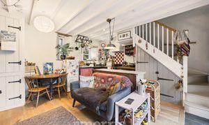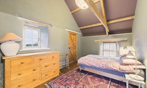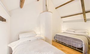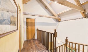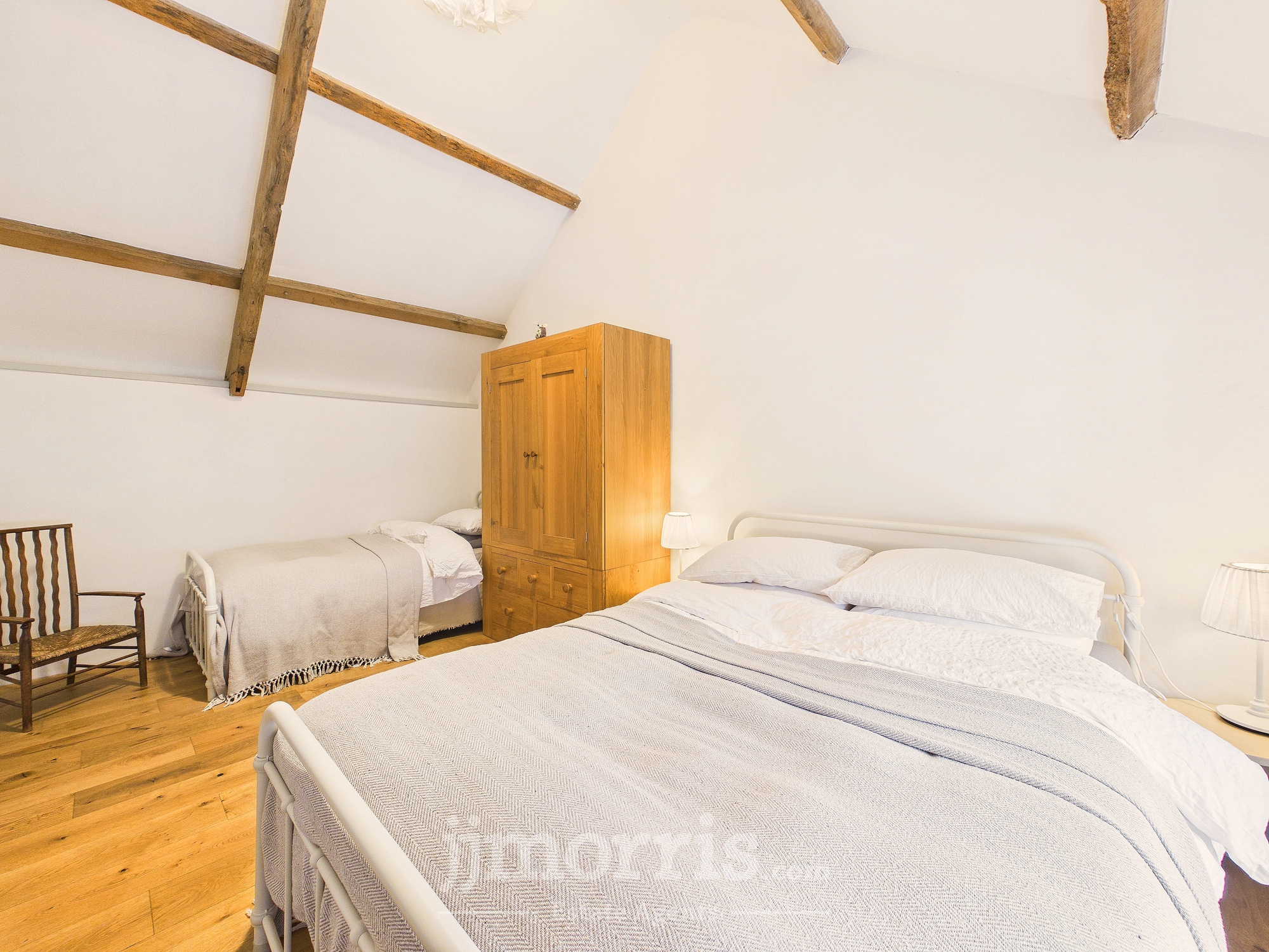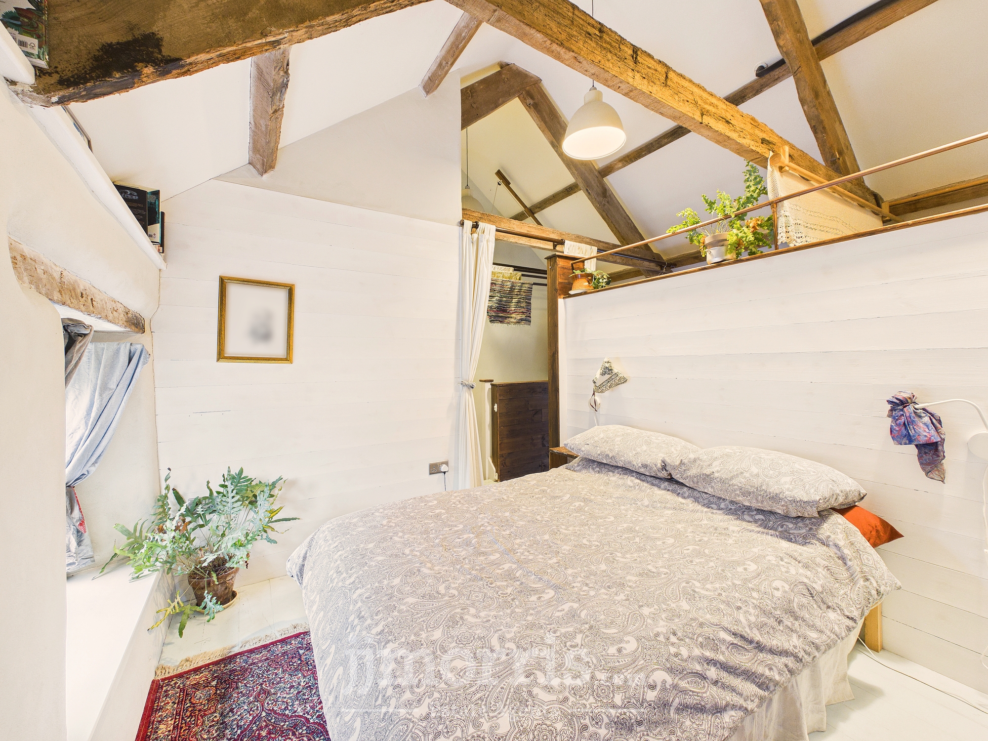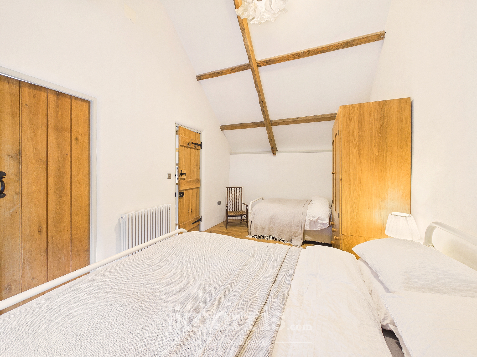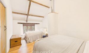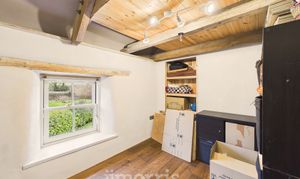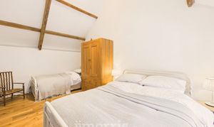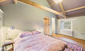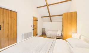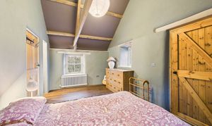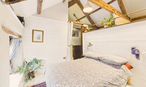 Clothes dryer pulley hanging over stairwell. Two sleeping areas with wooden panelled divide and exposed beams. Bedroom 1 double Double glazed window to front, radiator, exposed beams. Bedroom 2 Double. Wooden double glazed window to front. Radiator, Stable door with window opening to outdoor barn steps.