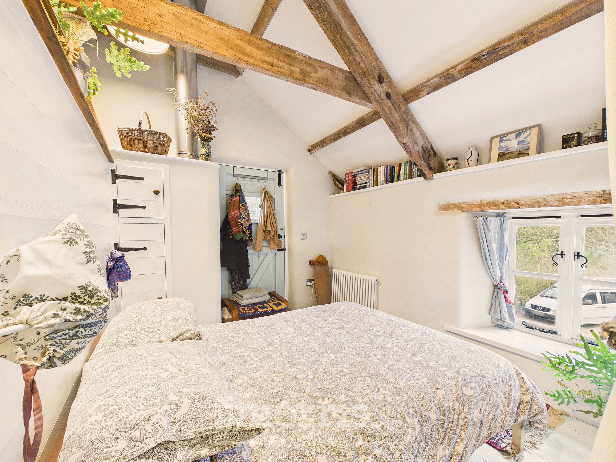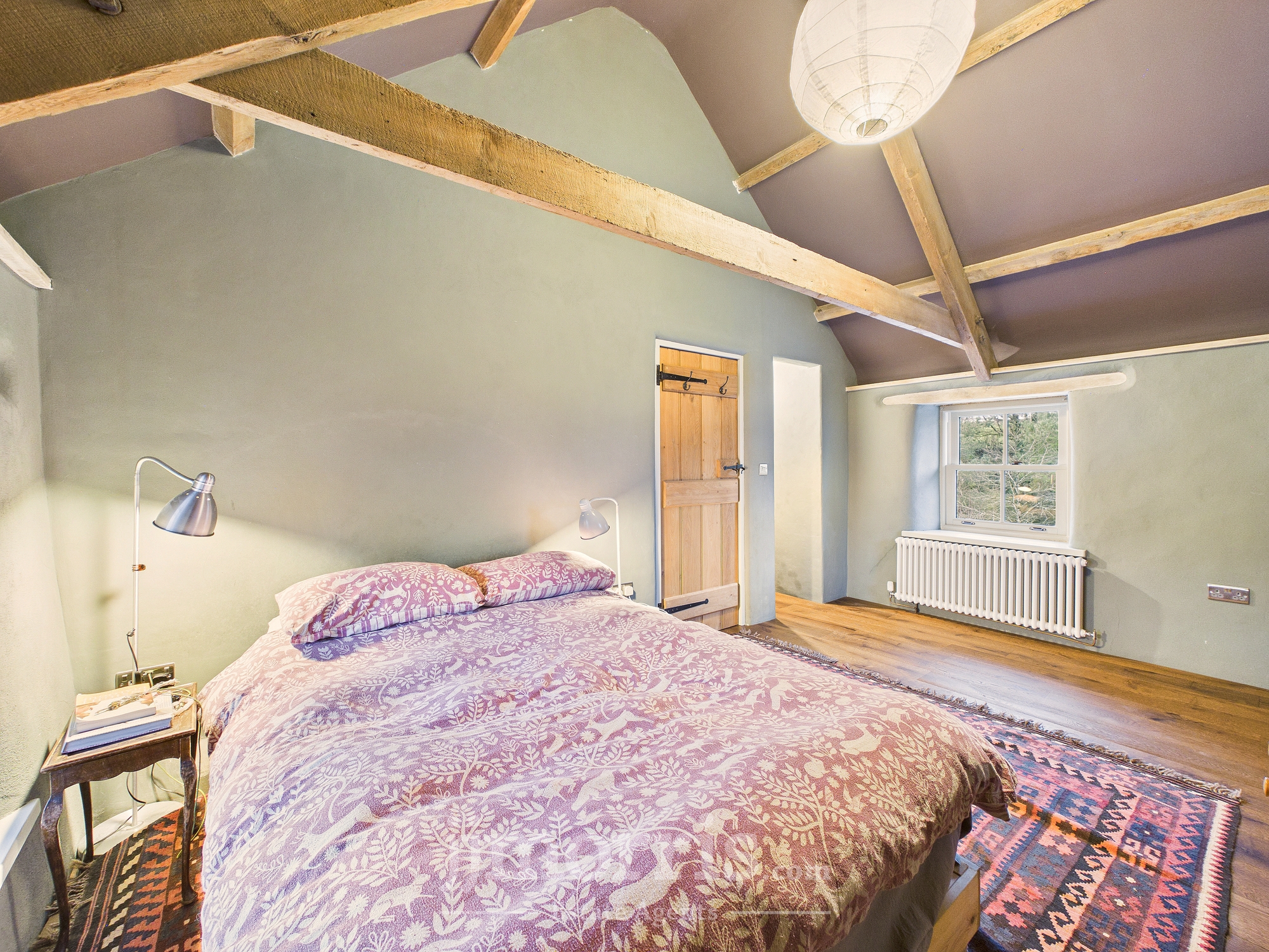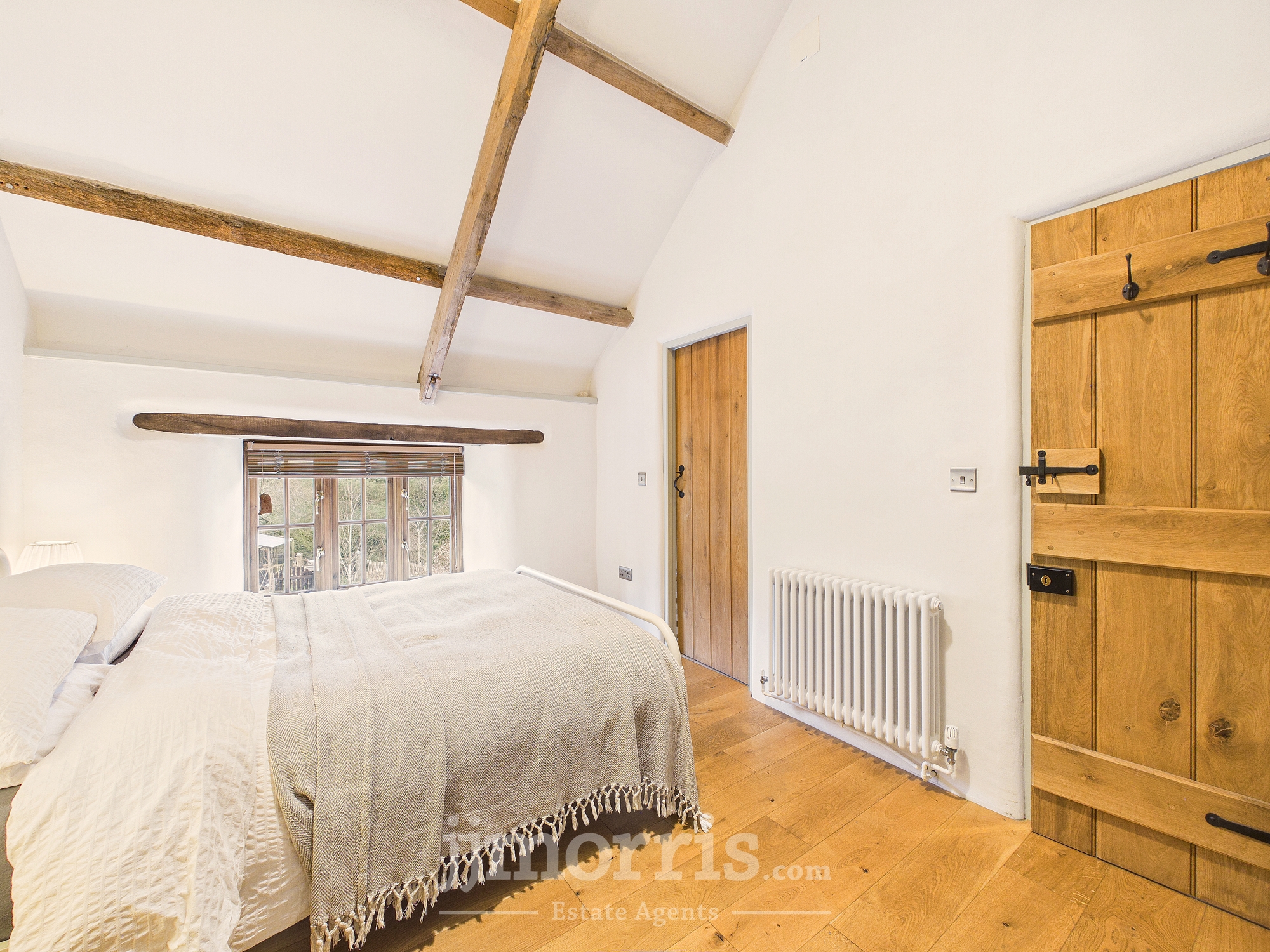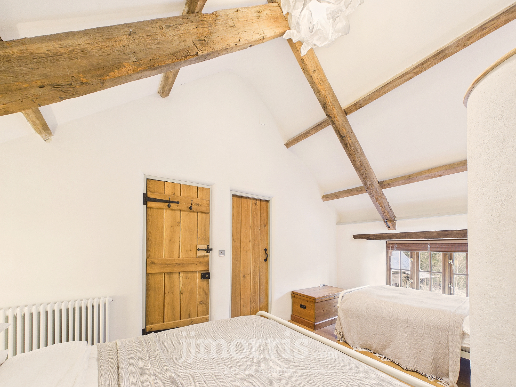 Double glazed window, radiator, exposed beams.