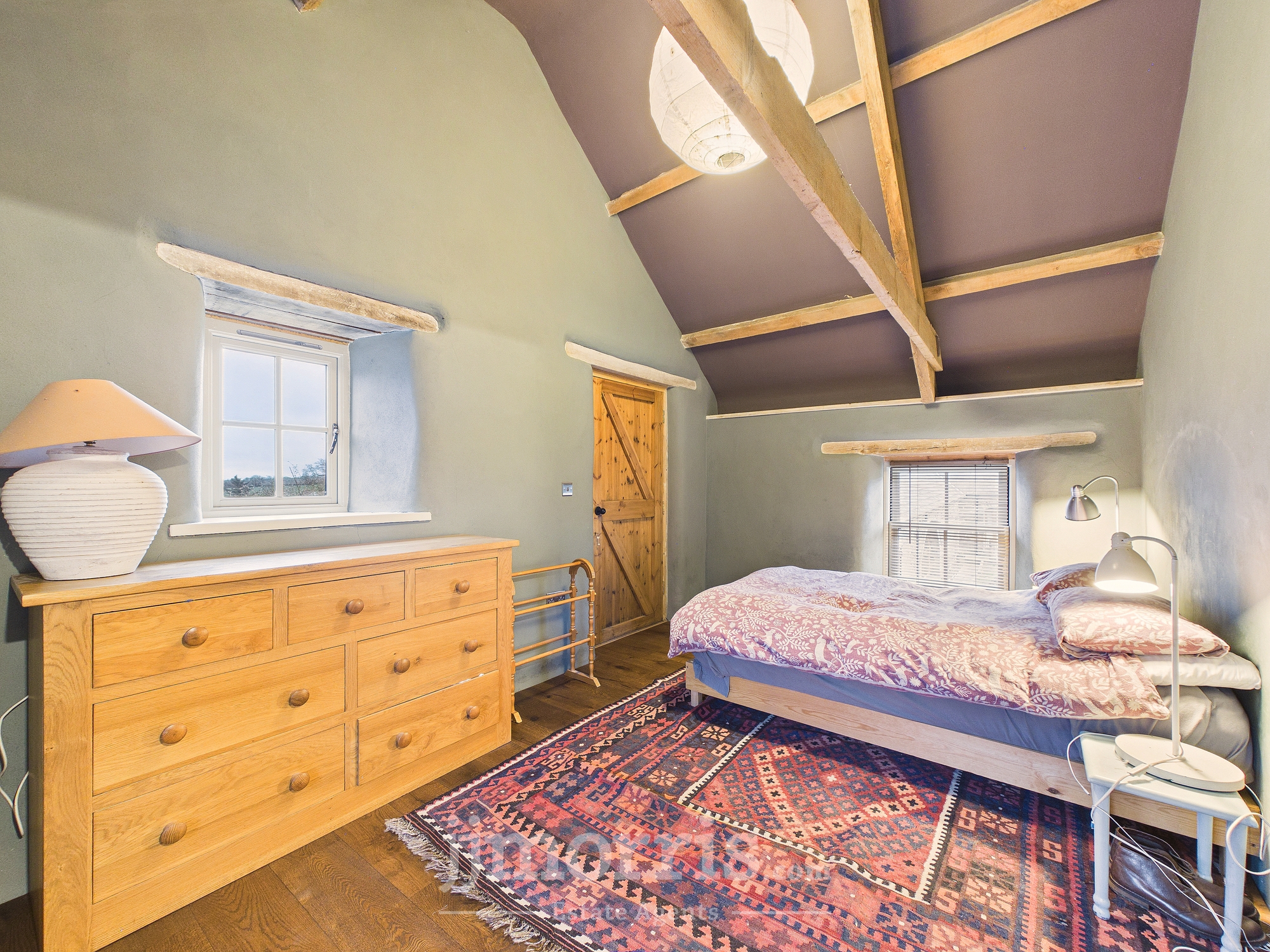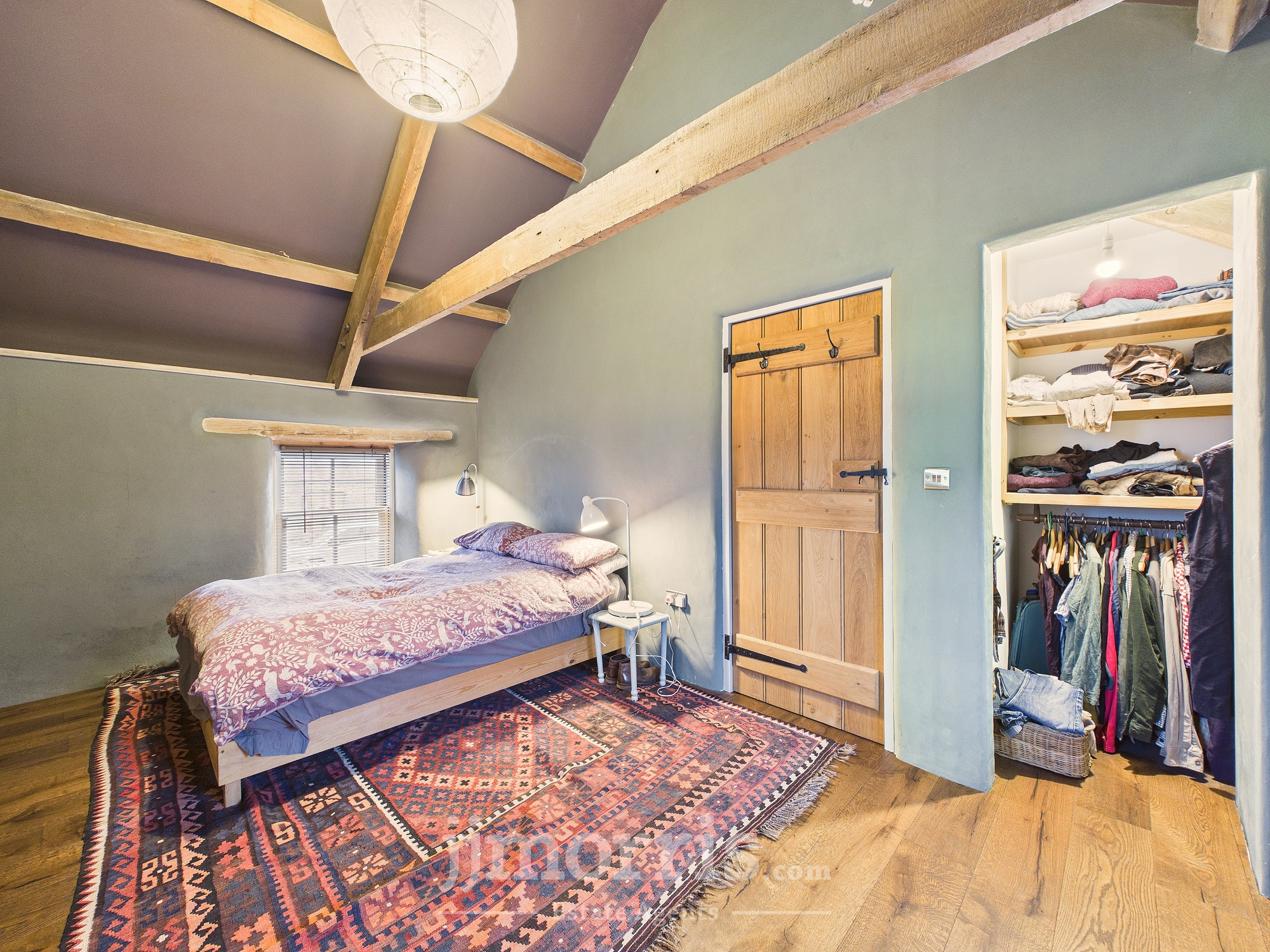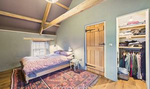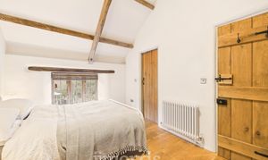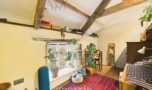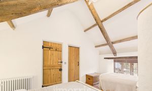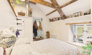 Exposed beams, engineered oak flooring, wooden sash windows to the front and rear and side, radiator, walk-in wardrobe. Exterior door.