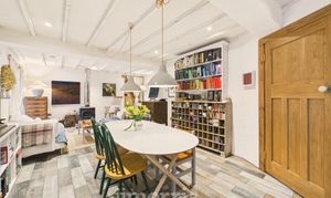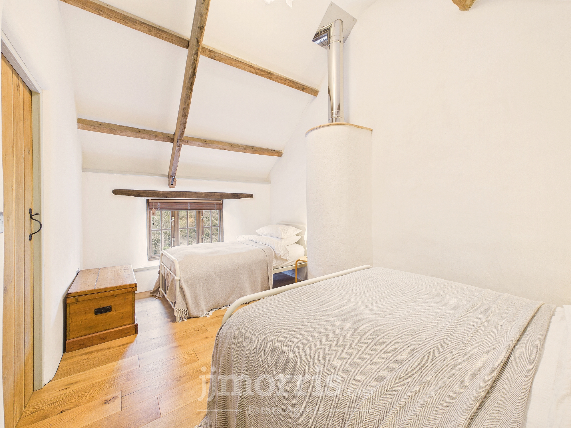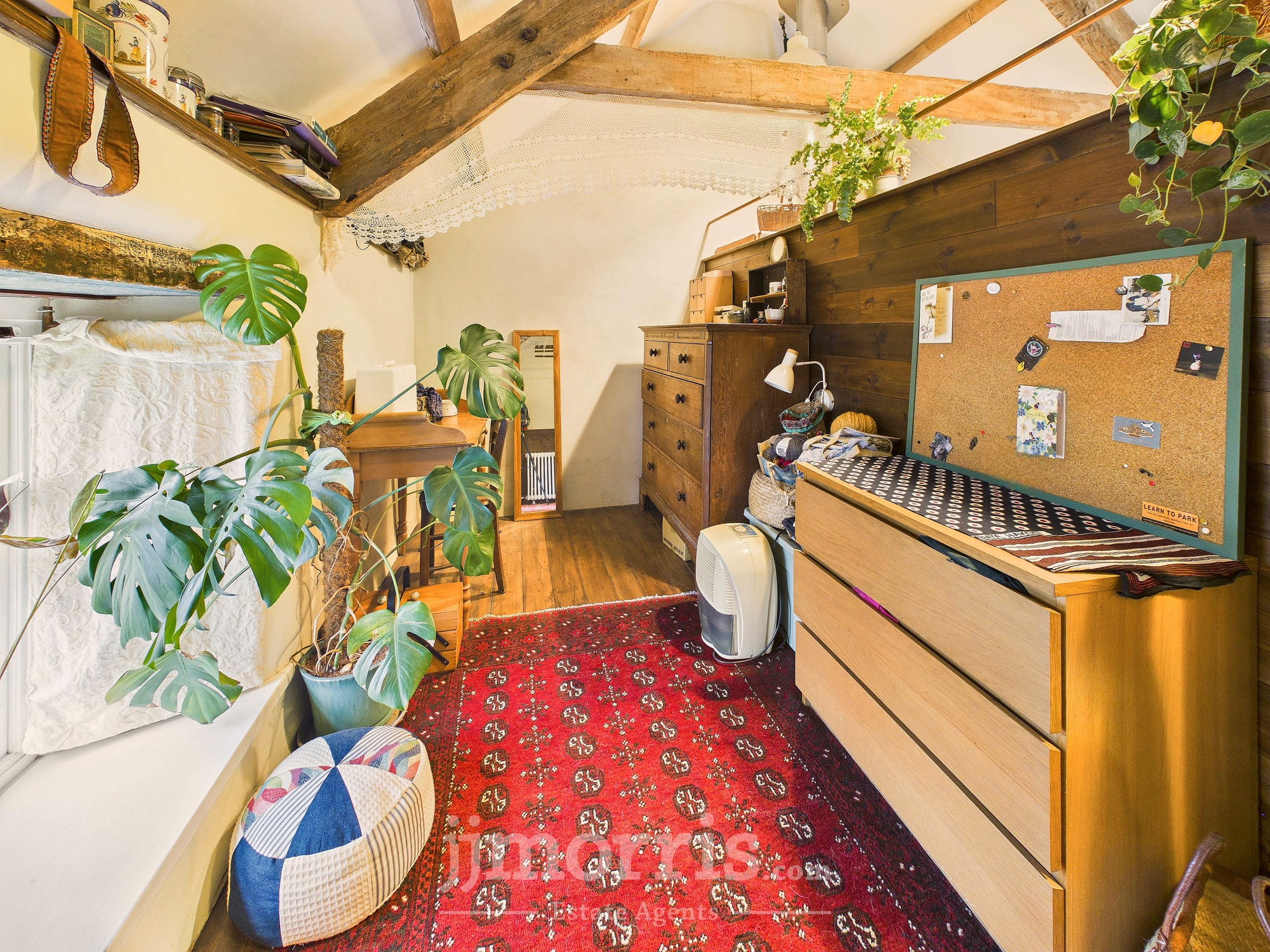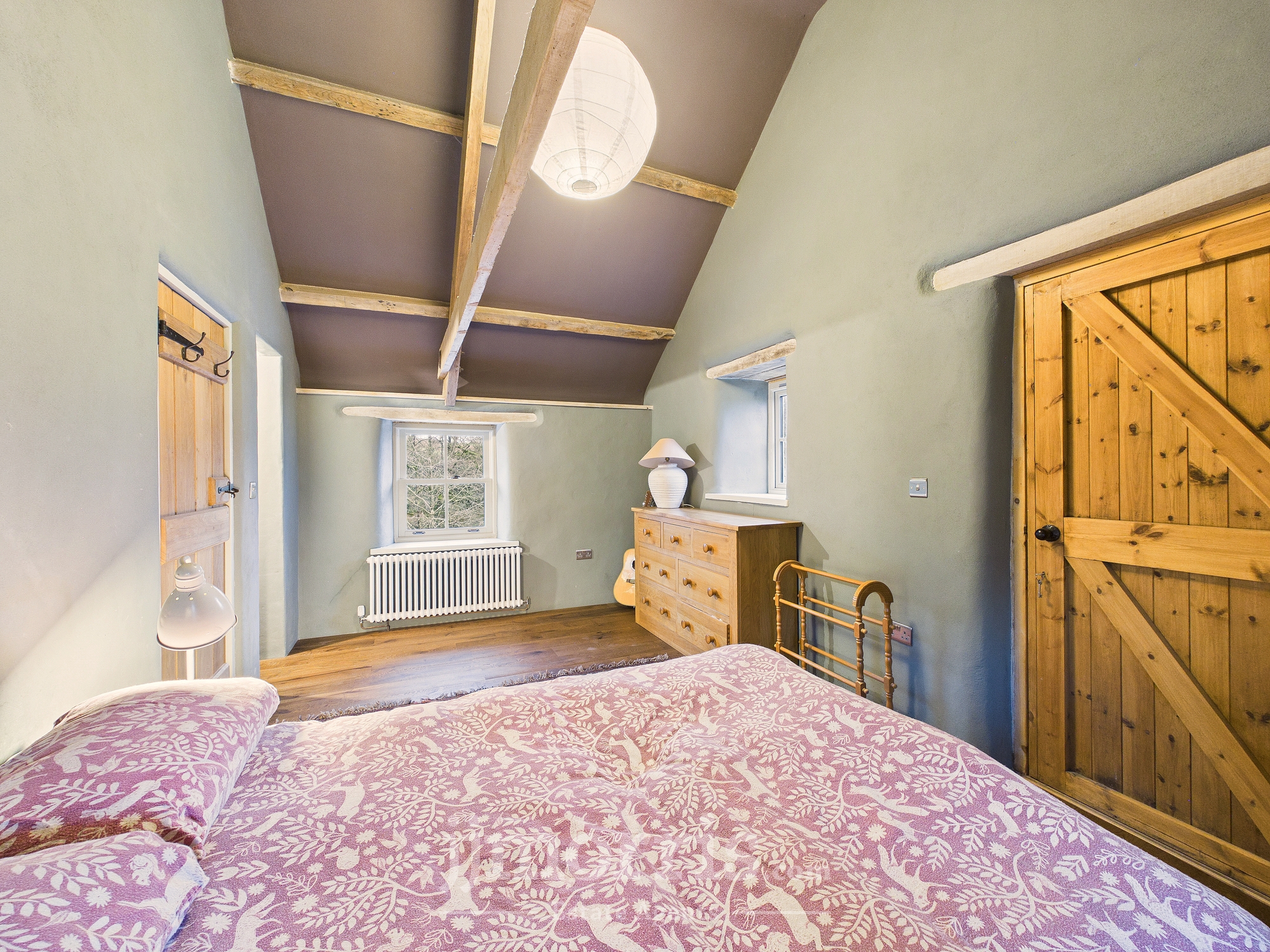 Exposed beams, engineered oak flooring, wooden sash windows to the front and rear and side, radiator, walk-in wardrobe. Exterior door.