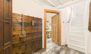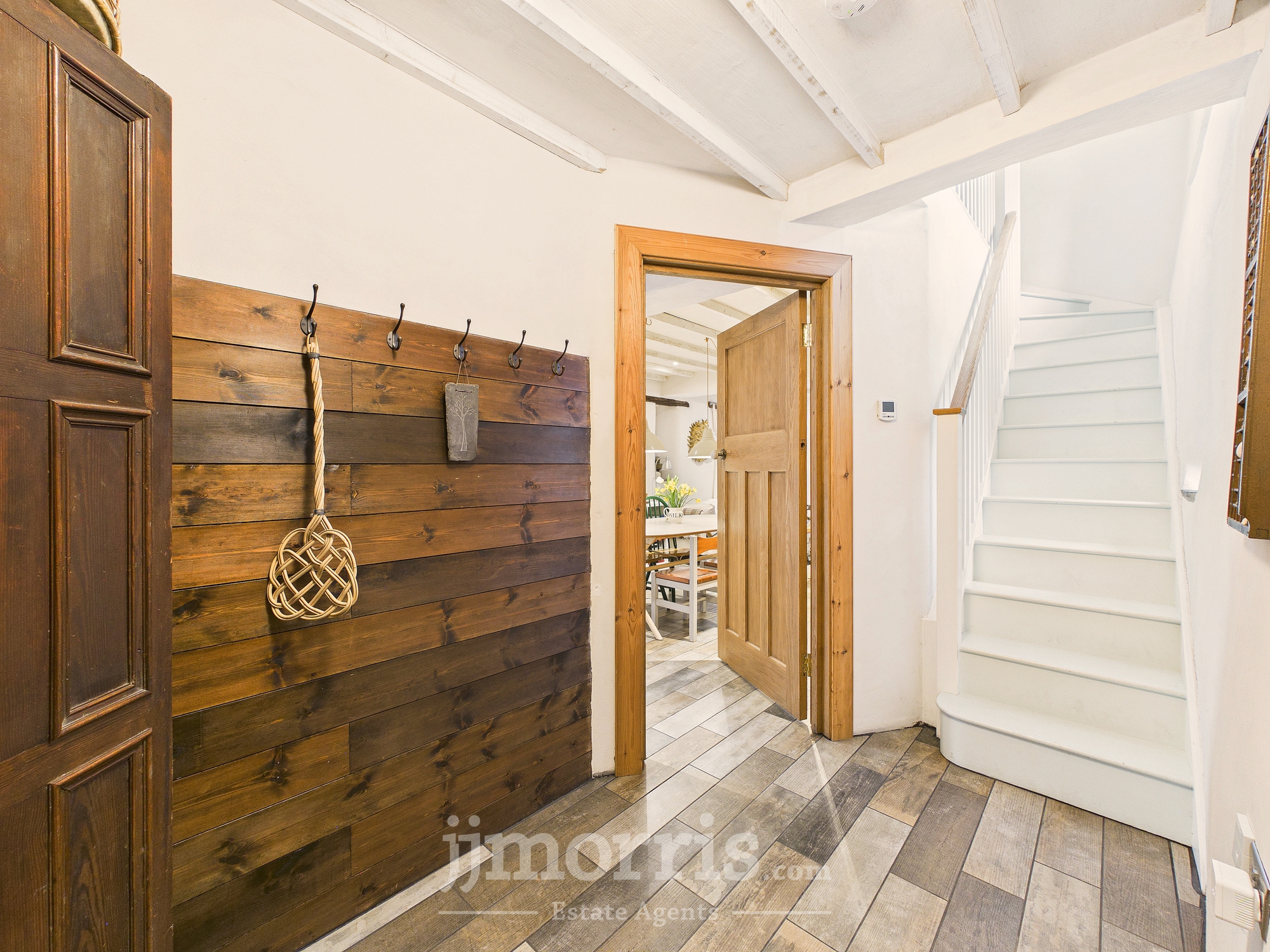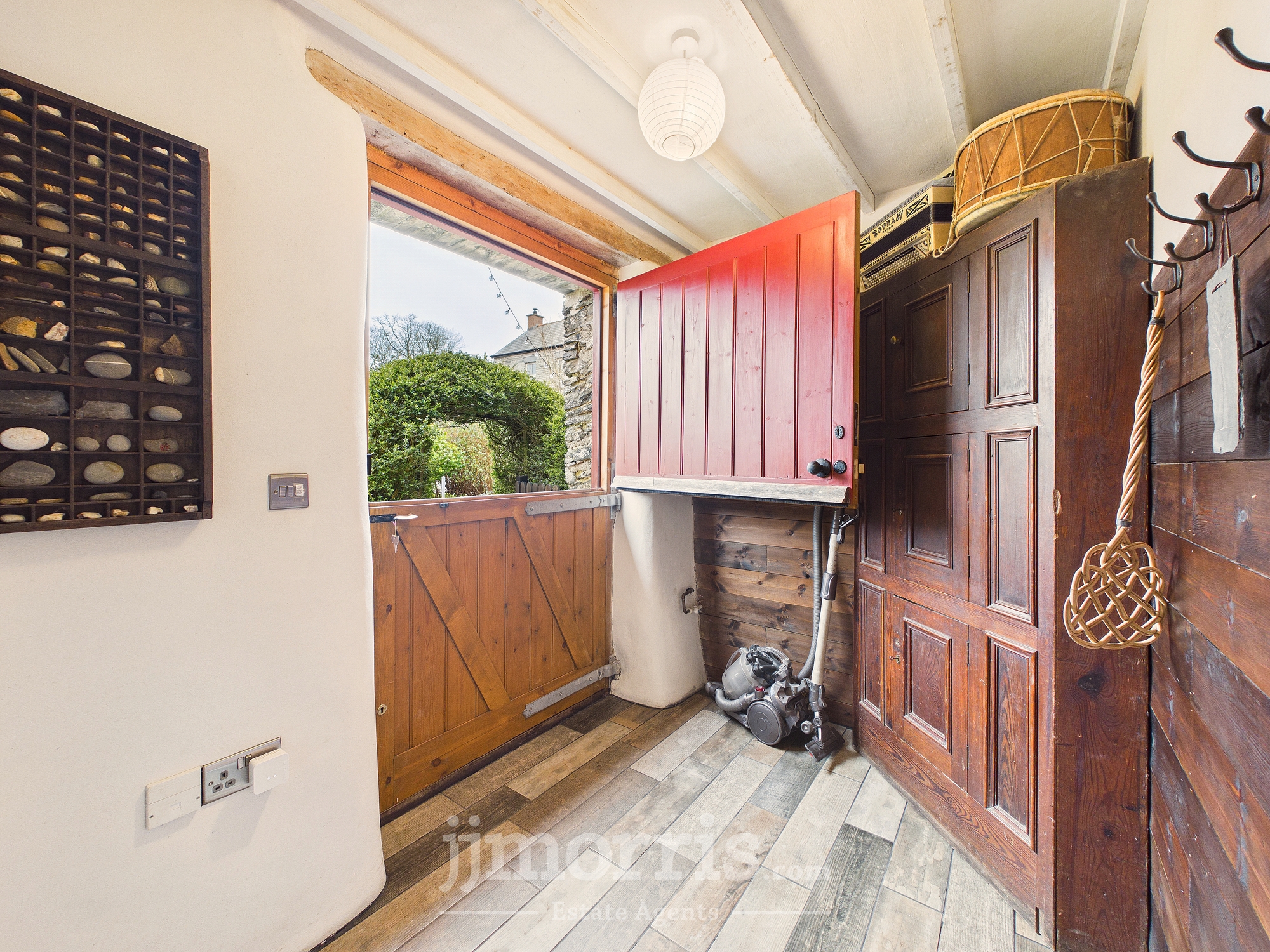 Stable door to the front, wood panelled walls, tiled flooring, stairs rising off to the first floor. Clothes dryer pulley hanging over stairwell.