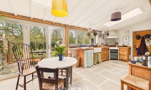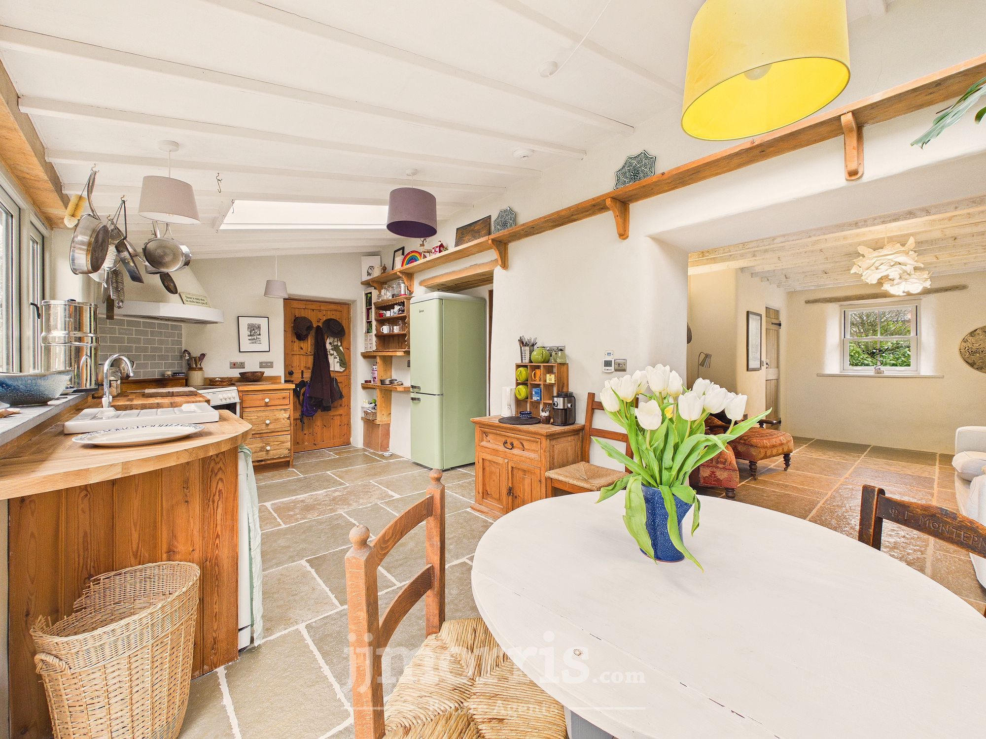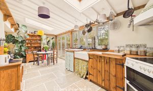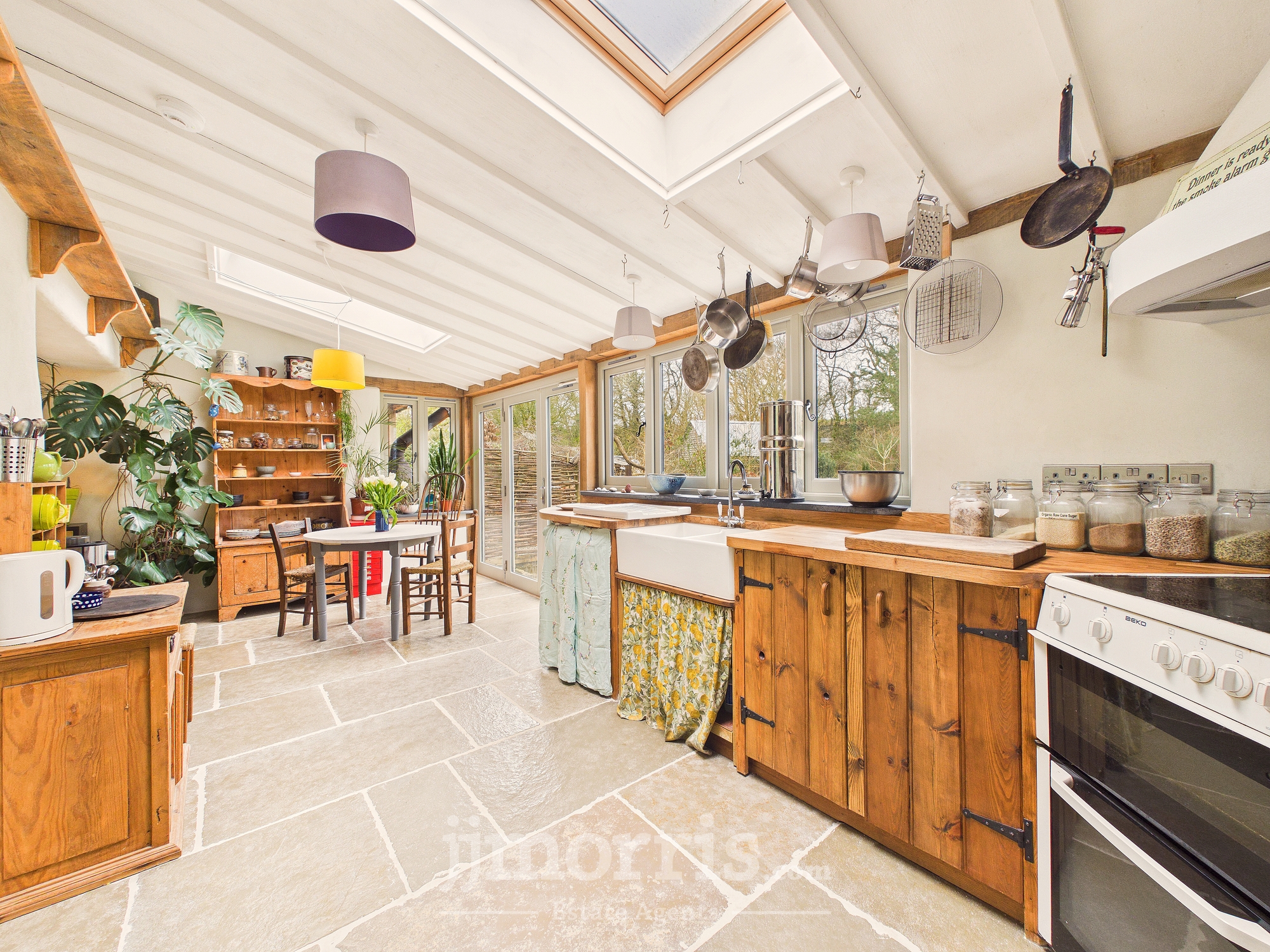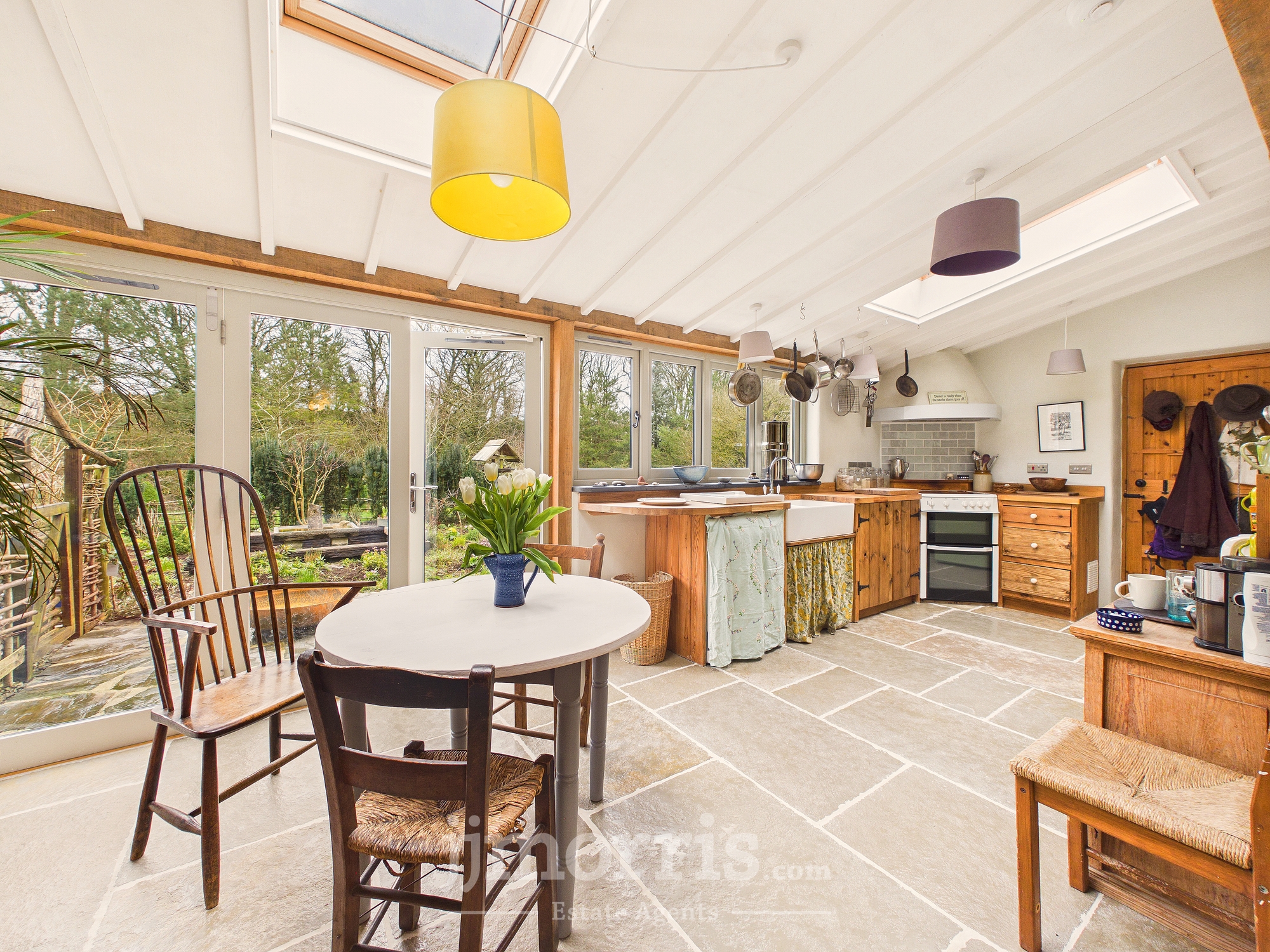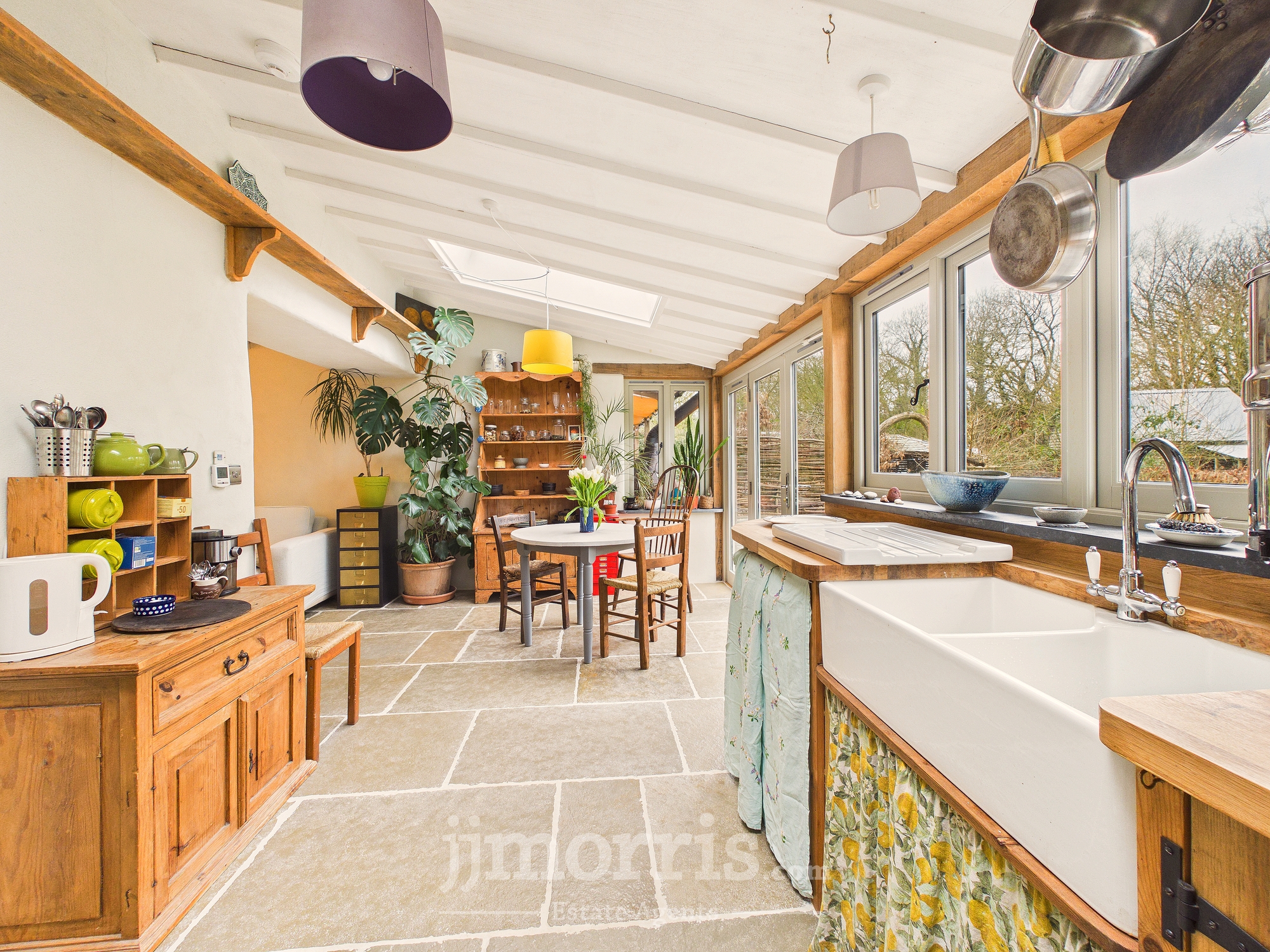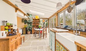 Having a range of handmade wooden base cabinets with oak worktop. Twin Belfast sink with mixer tap and drainer, electric oven with tiled splashback and extractor fan, space for fridge/freezer, dishwasher. Flagstone flooring throughout. Double glazed windows to the rear and side with a wooden sash window to the fore, 2 Velux rooflights, bifold doors leading out to the stone patio and rear garden. Back stable door leads to covered porch area and vegetable garden. Door to:-