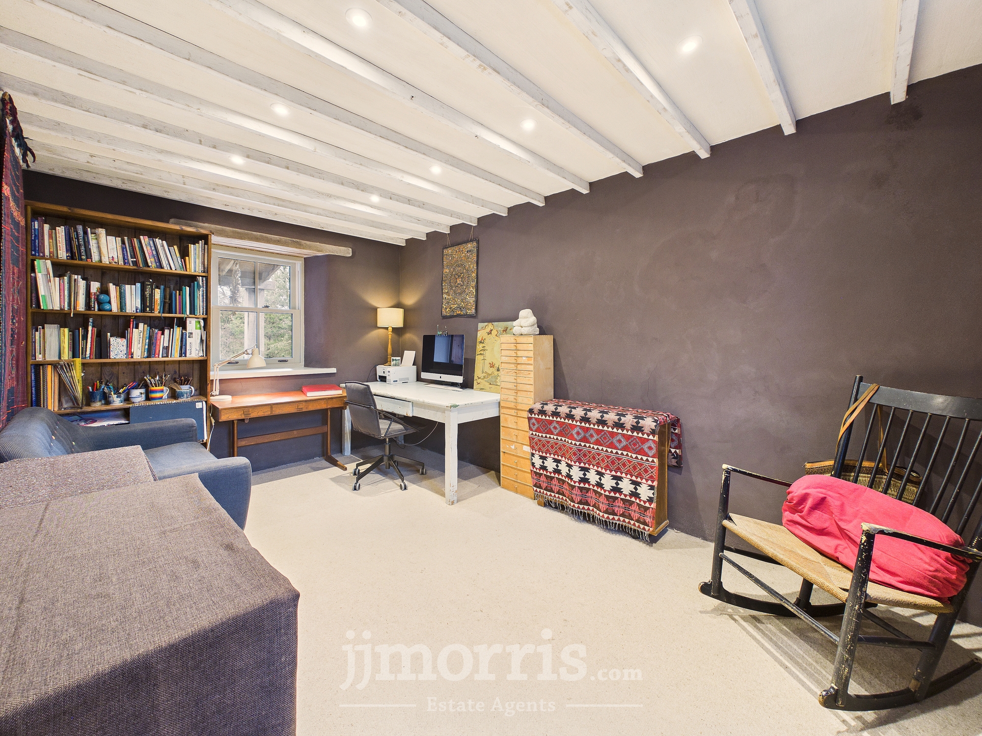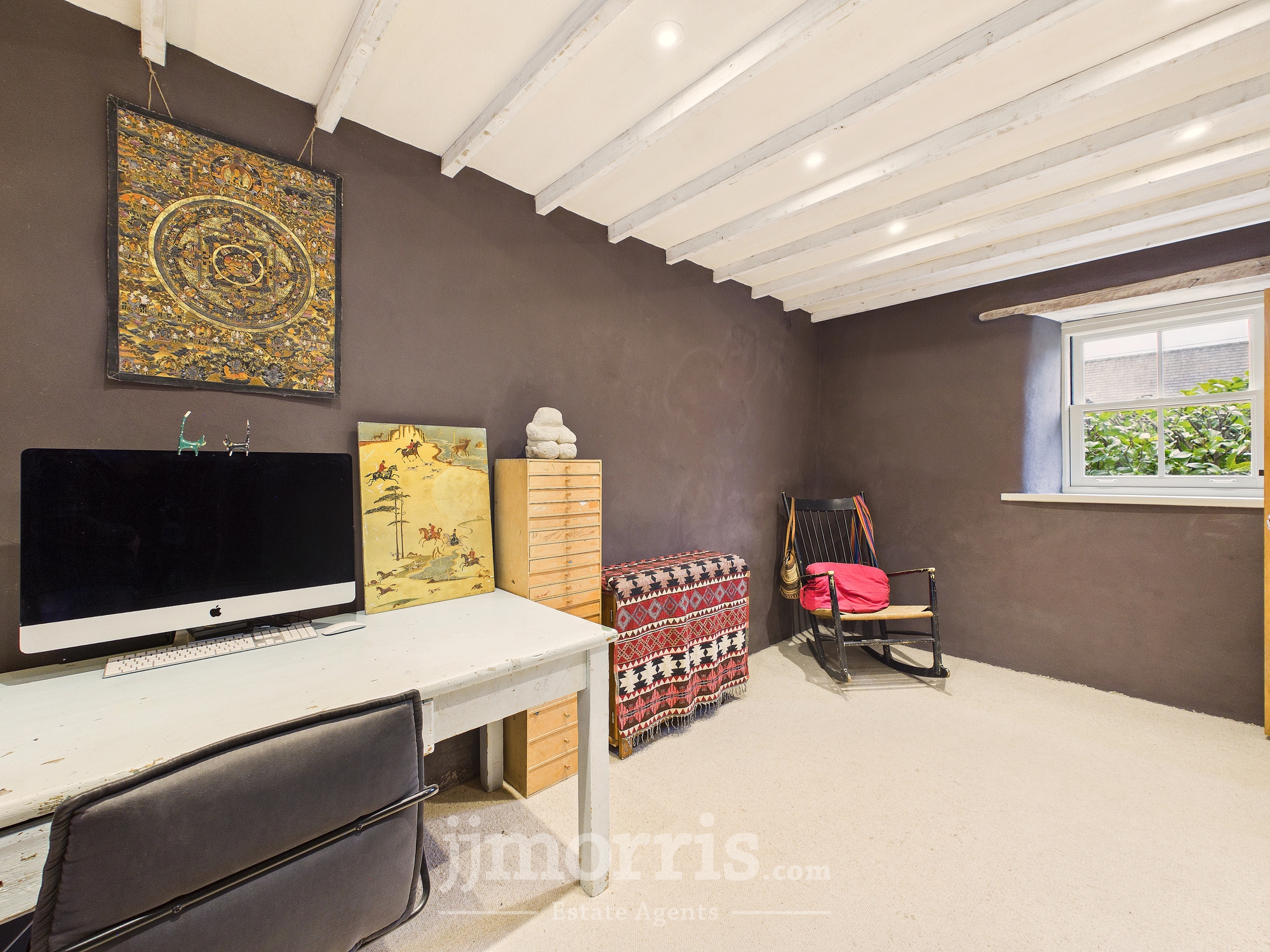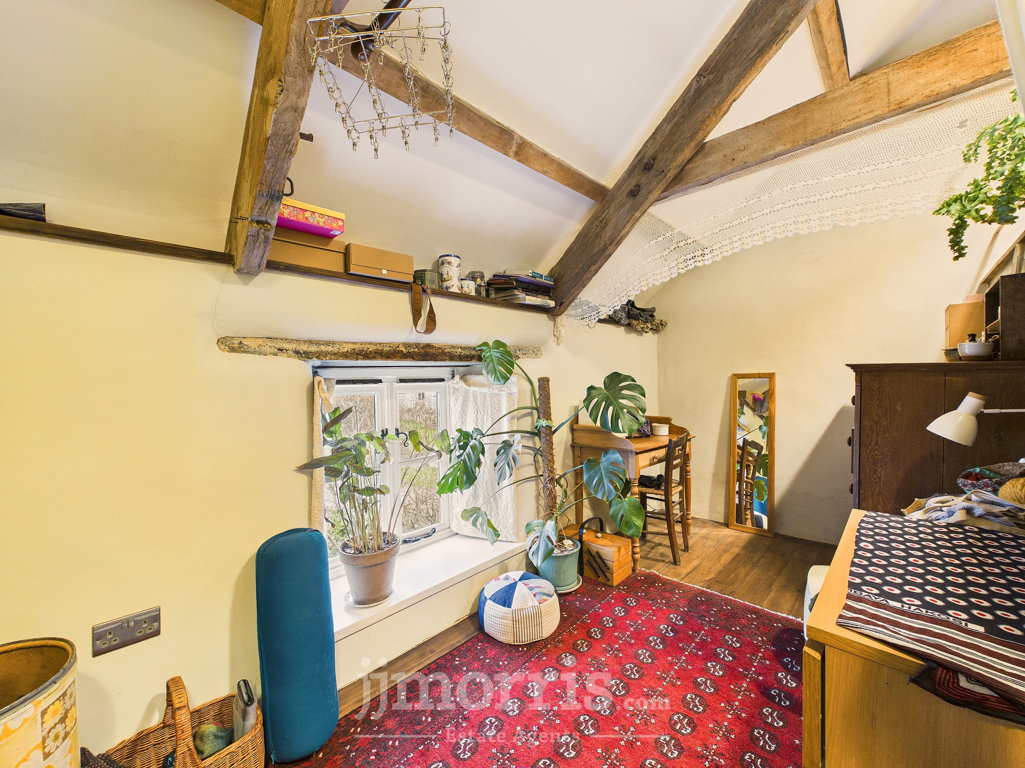 Dual aspect wooden sash windows, exposed beams. Carpeted.