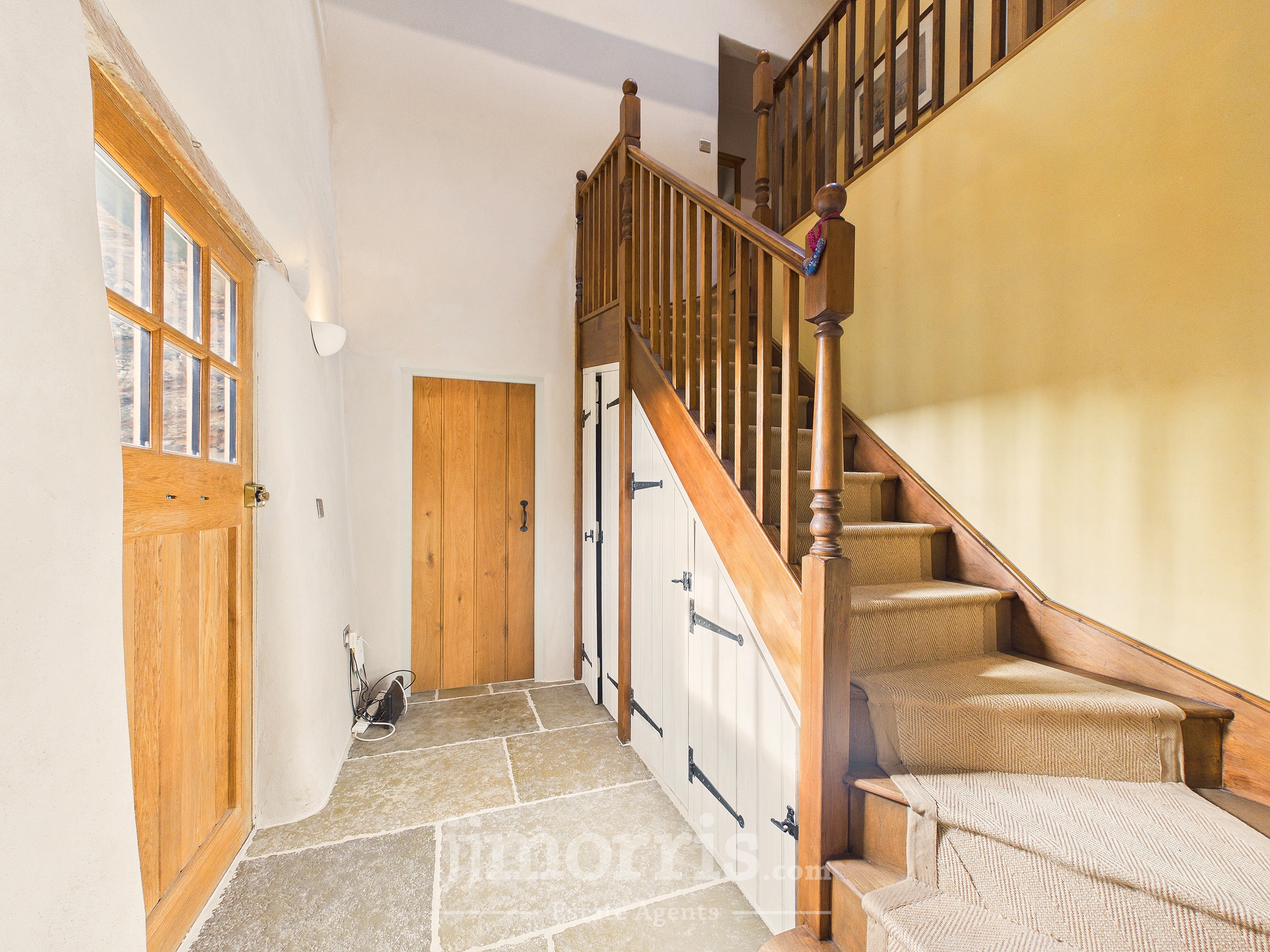 Hallway open to roof with flagstone flooring, generous understairs storage, stairs leading to first floor landing, uplighters. Solid oak panelled doors with latch opens to:-