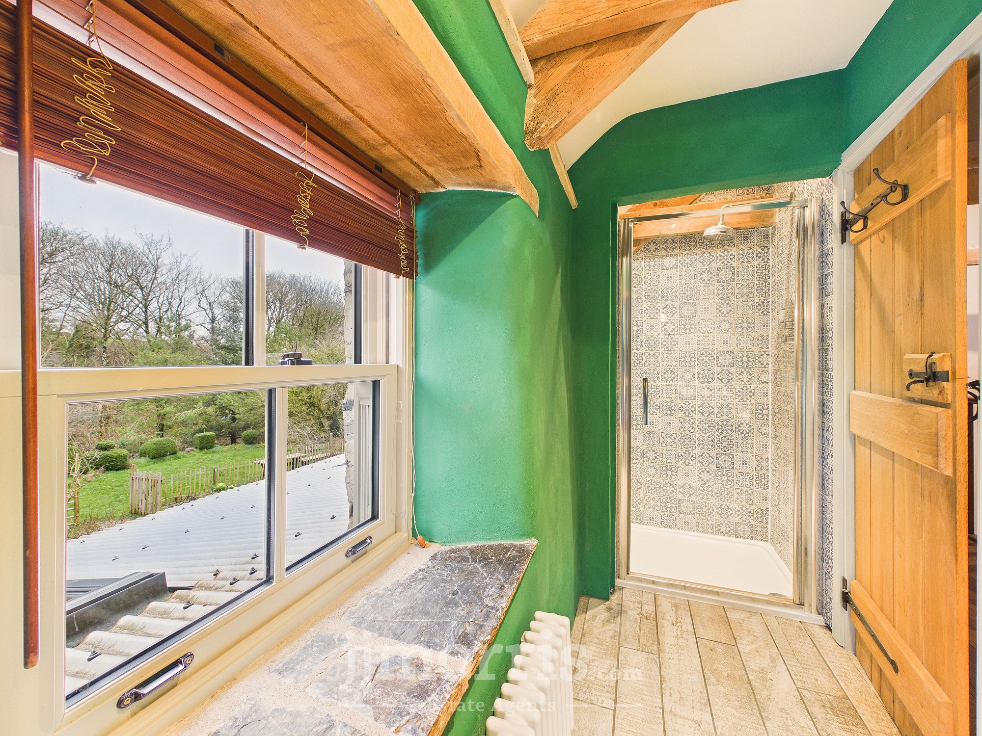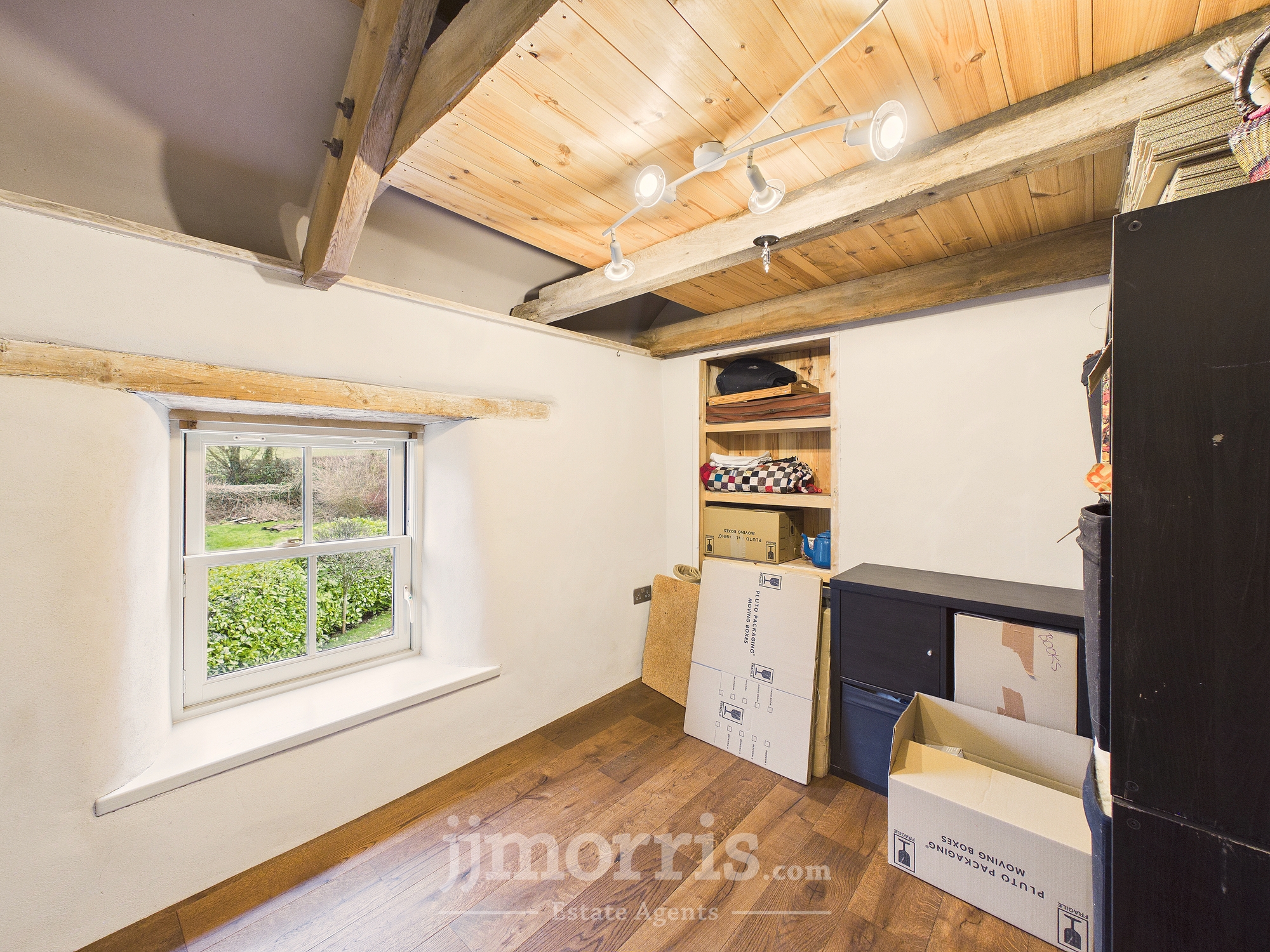 Double glazed casement window overlooking gardens. Exposed beams, engineered oak flooring, radiator. Door to:-