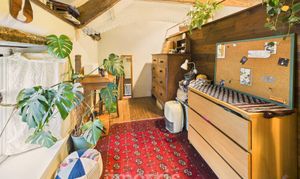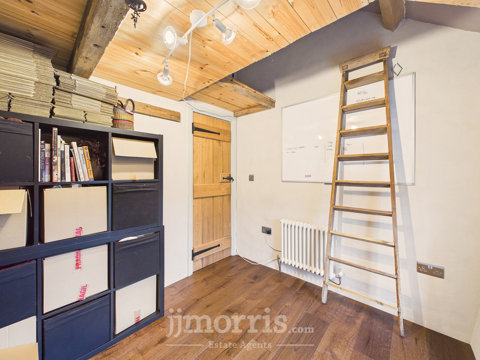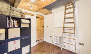 Wooden double glazed window to the front with attic space / crog loft storage / bed platform above. Built in shelves, radiator. Engineered oak flooring.