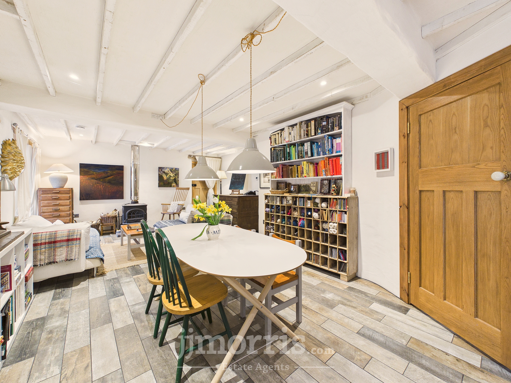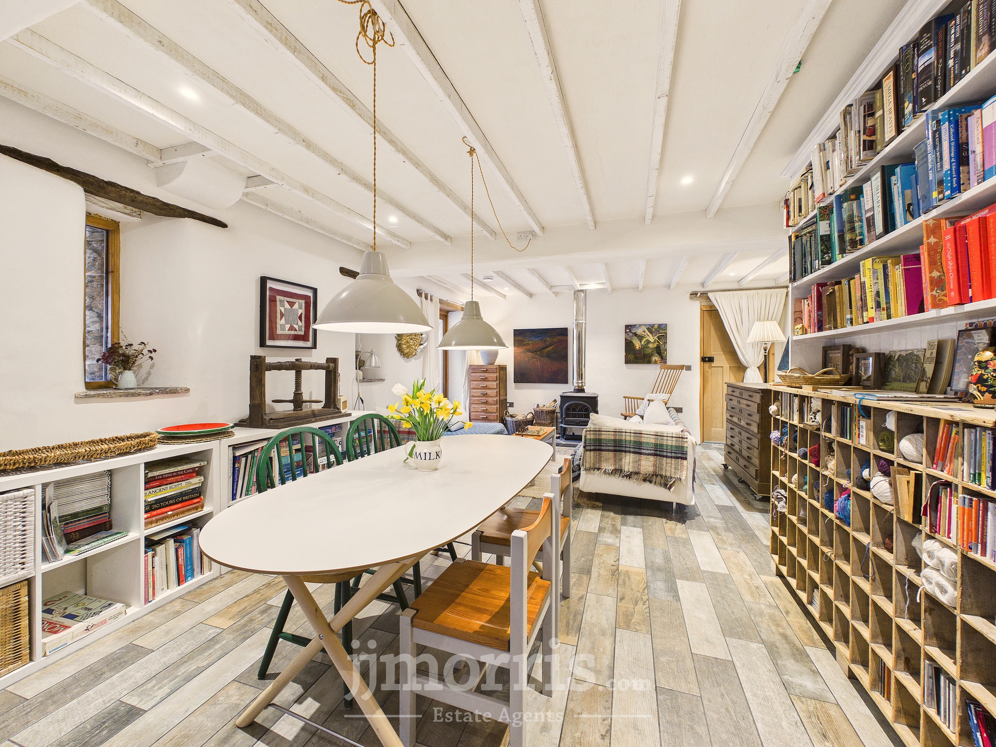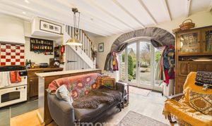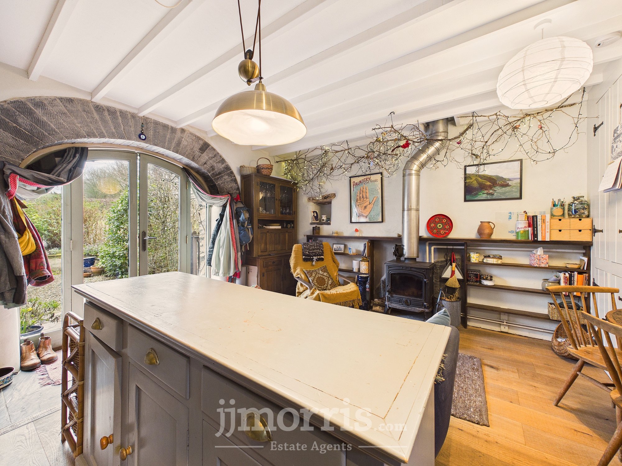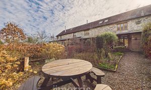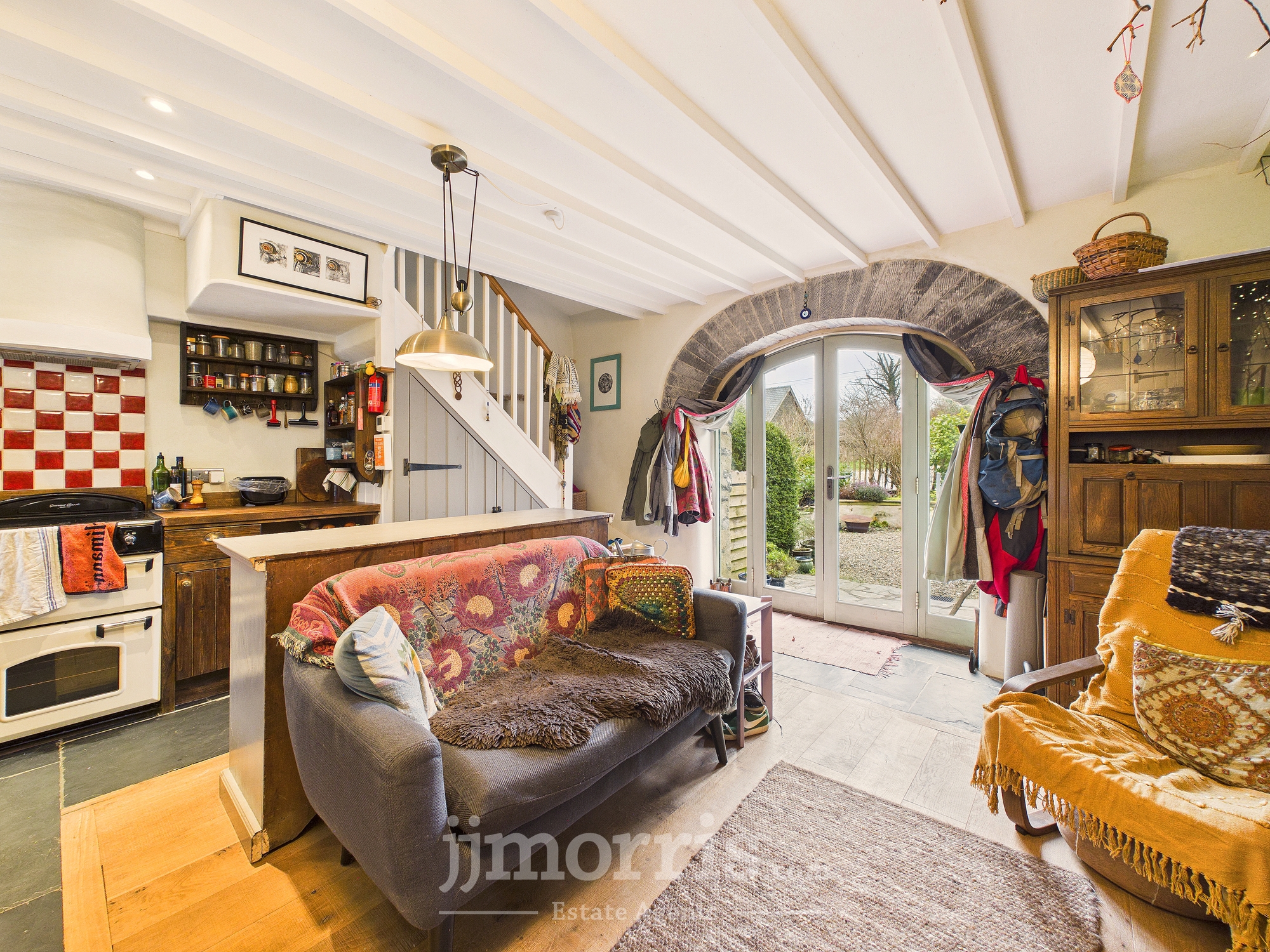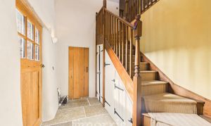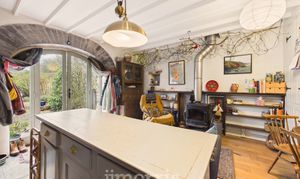 Old Carthouse with feature exposed stone arch, wood burning stove with back boiler and slate hearth, engineered oak flooring with underfloor heating, built-in understairs storage, with washing machine, exposed beams. Boiler cupboard with additional storage. Feature slit widow to rear and cart-lamp alcoves.