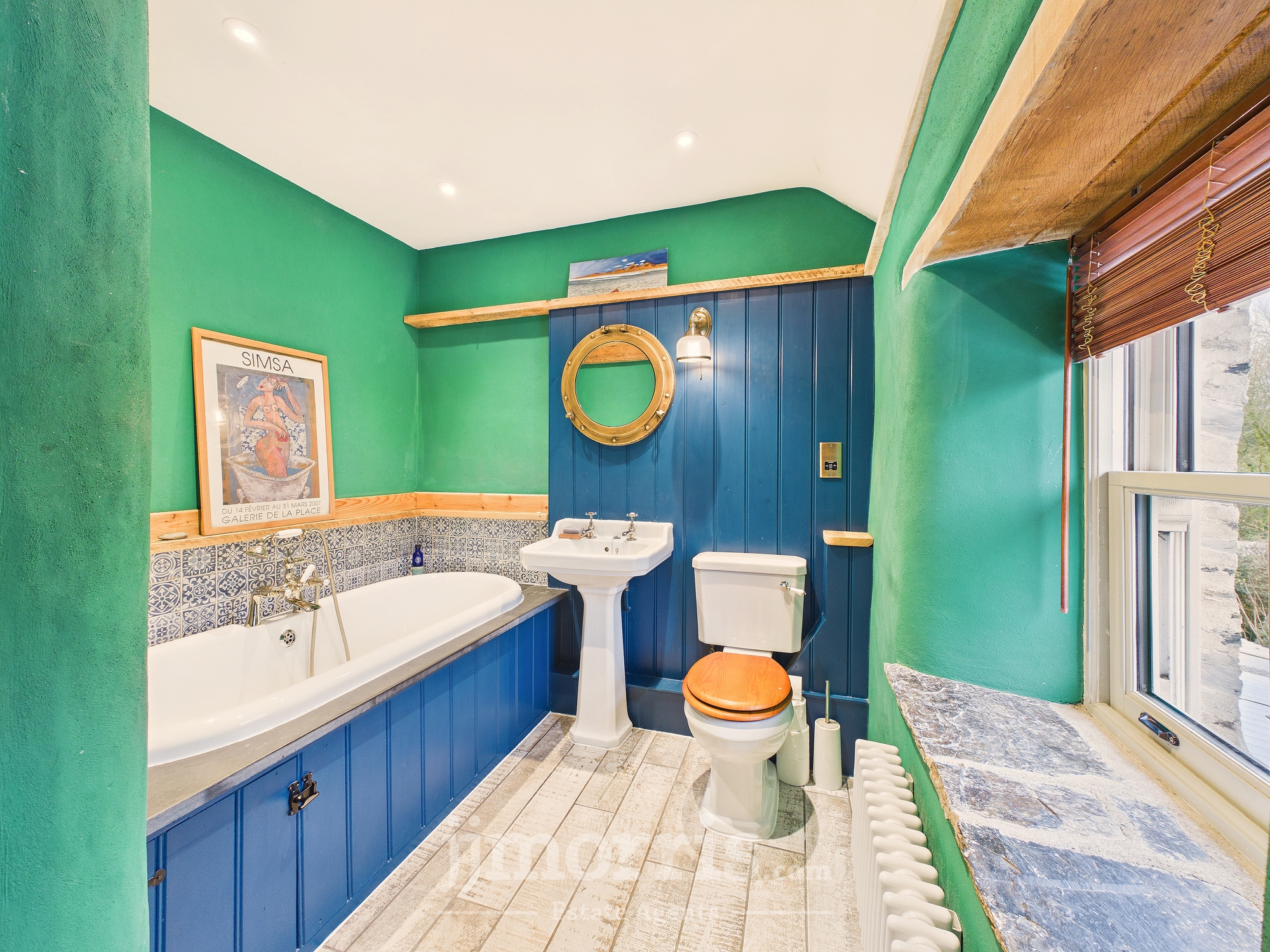A four piece suite comprising low flush WC, pedestal hand wash basin, sunken bath with slate surround and tiled splashback, recess shower cubicle with rainfall showerhead, wooden double glazed window to the rear, radiator, tiled flooring, electric shaver socket, recess spotlights. Extractor fan.