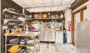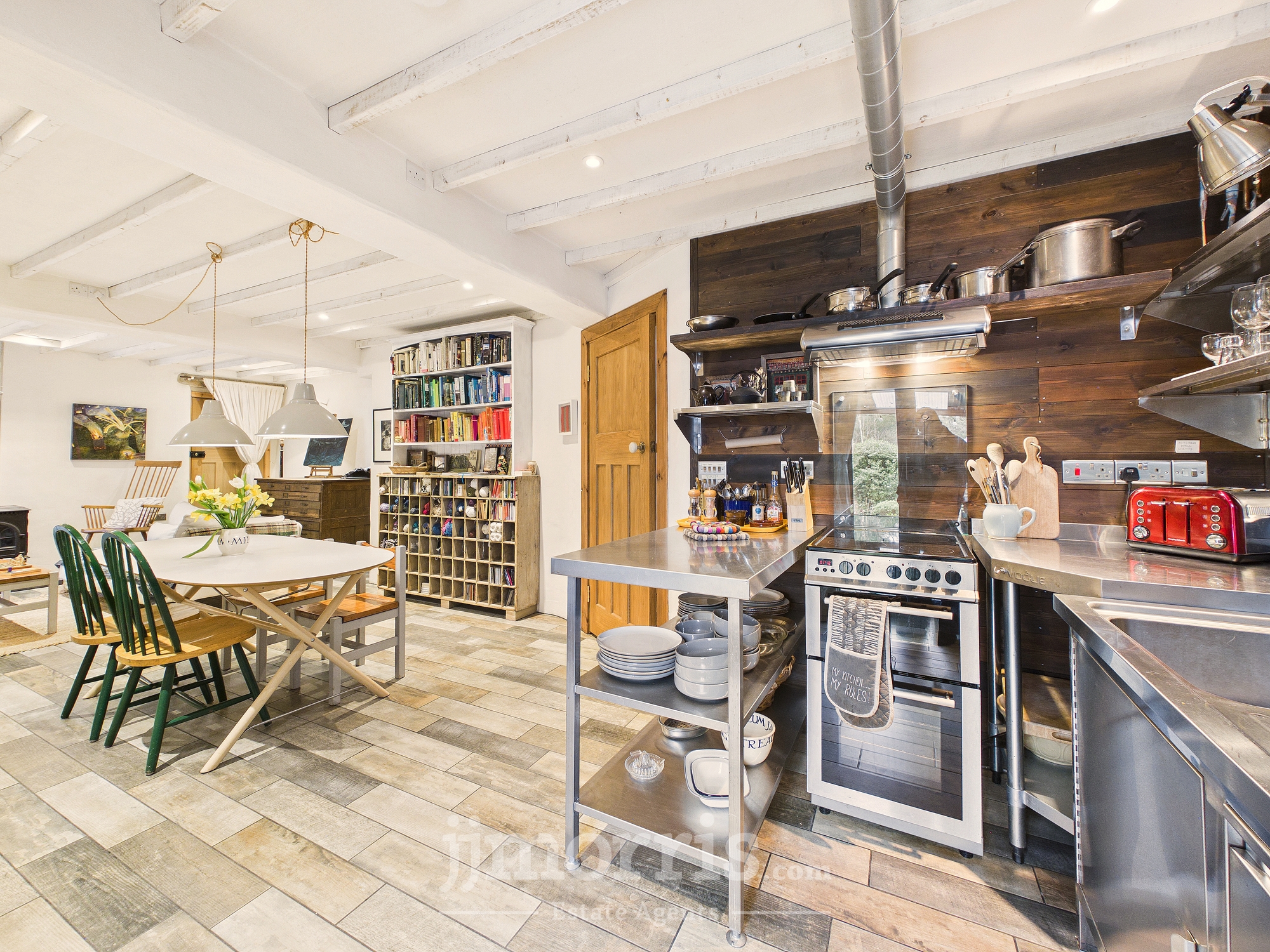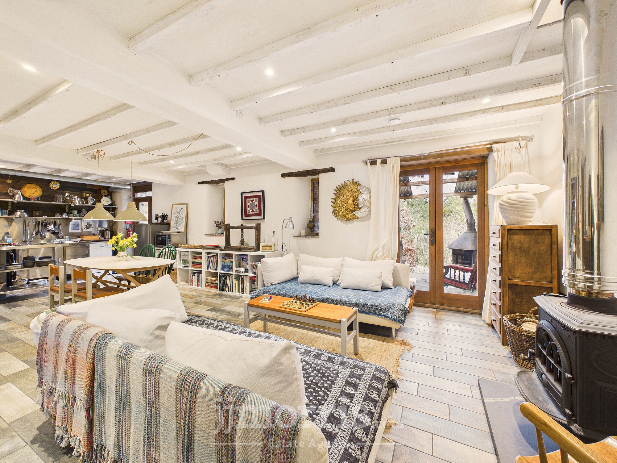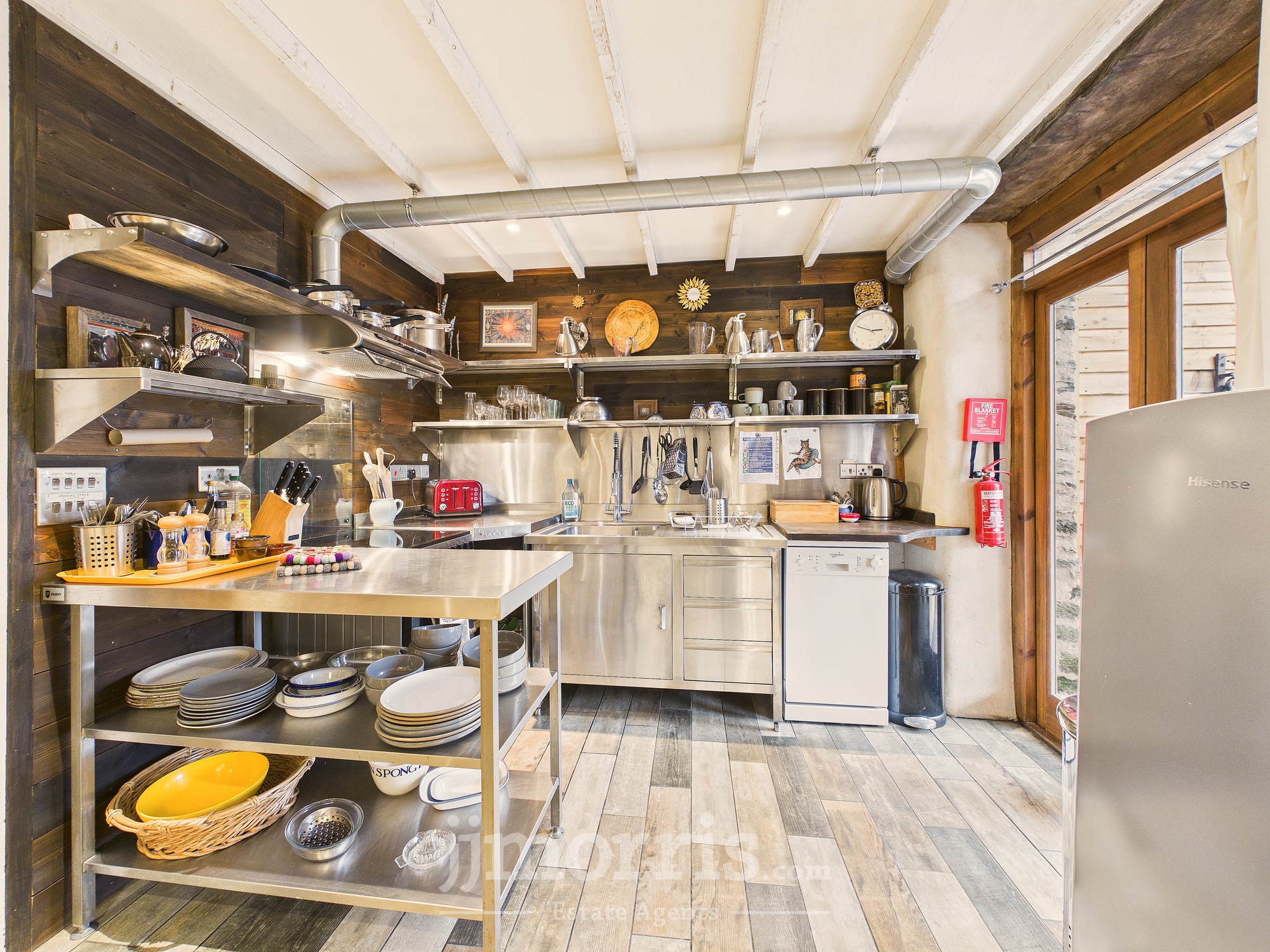Tiled flooring, fire doors, stainless steel commercial utility sink, mixer tap, unit with cabinets below. Space for mini dish washer. Stainless steel shelving and food preparation area, with spotlights and recess lighting, cooker with extractor, space for table, seating area, wood burning stove, 2 x double glazed doors to the veranda and back gardens. door to:-