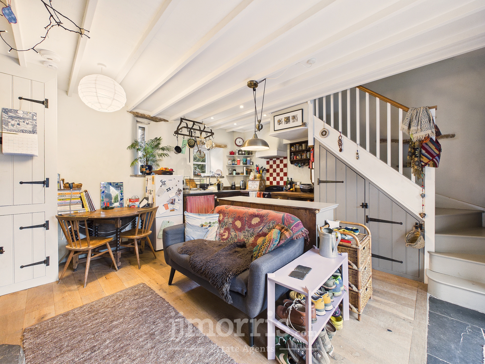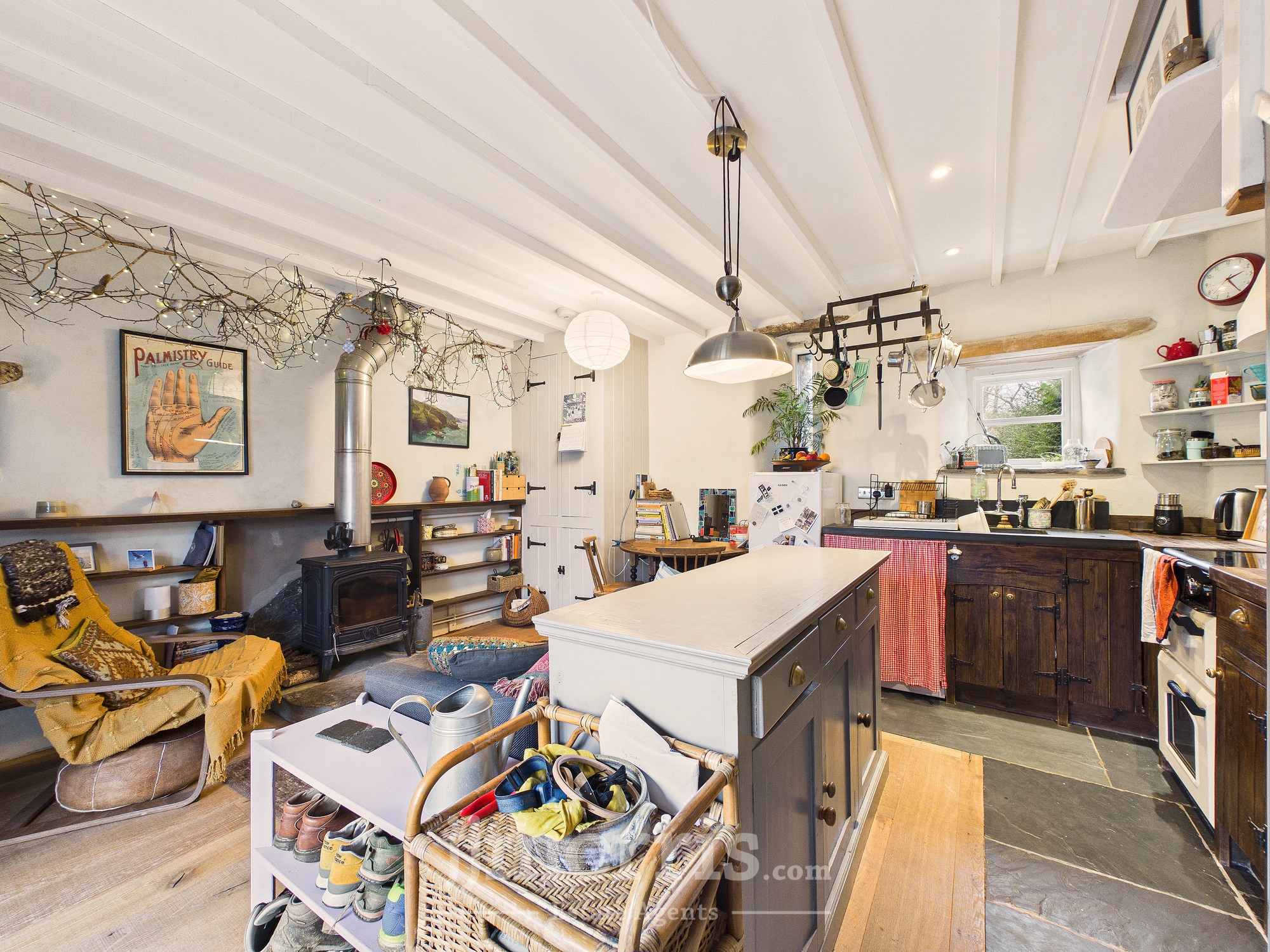 Having a range of hand made wooden base units with slate and oak worktops, a Belfast sink with ceramic drainer, mixer tap, electric cooker with tiled splashback and extractor fan over, double glazed wooden windows, space for table, understairs storage, stairs rising off to:-