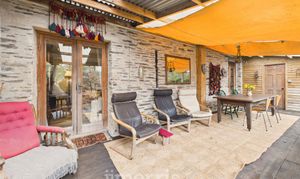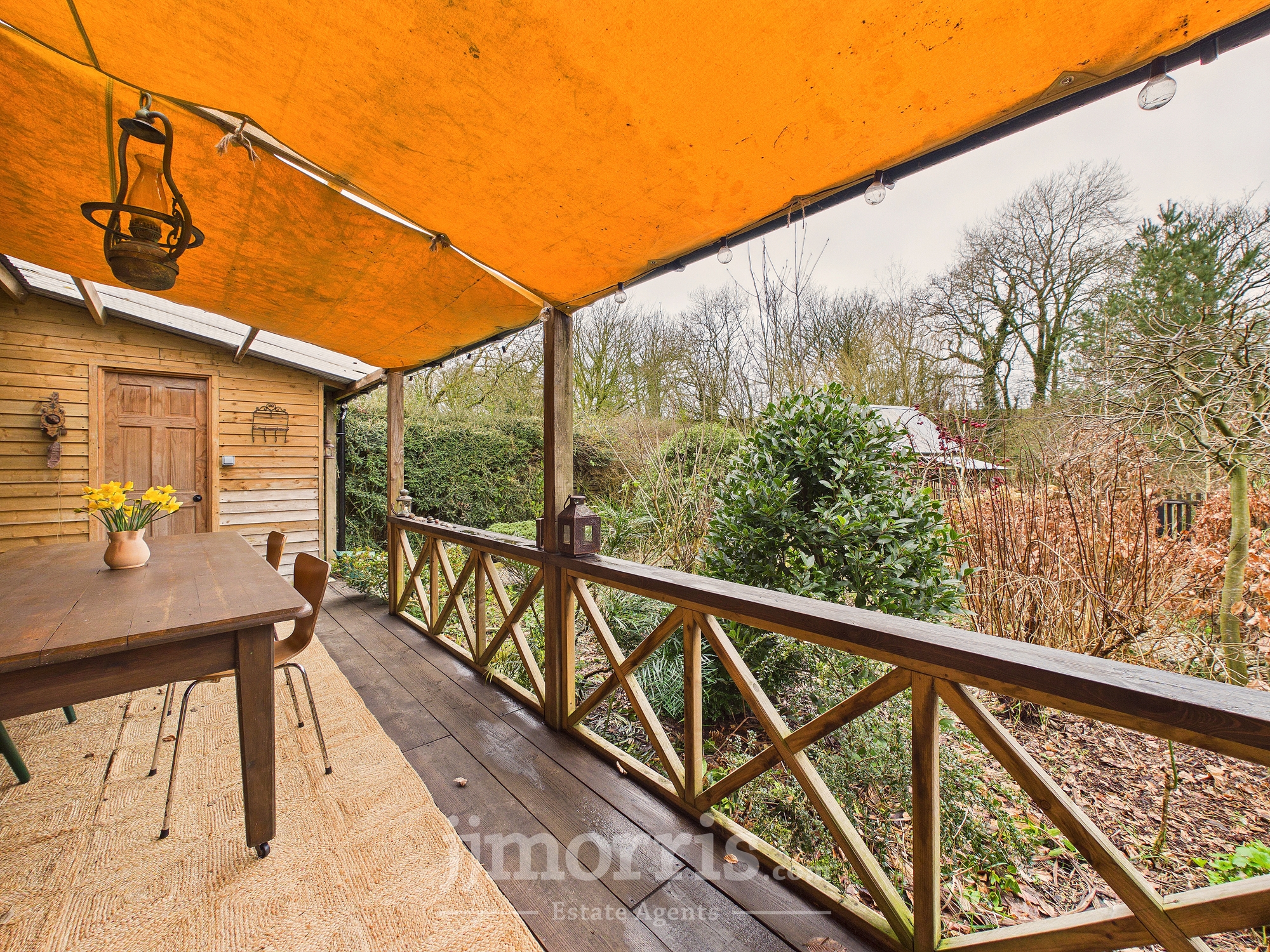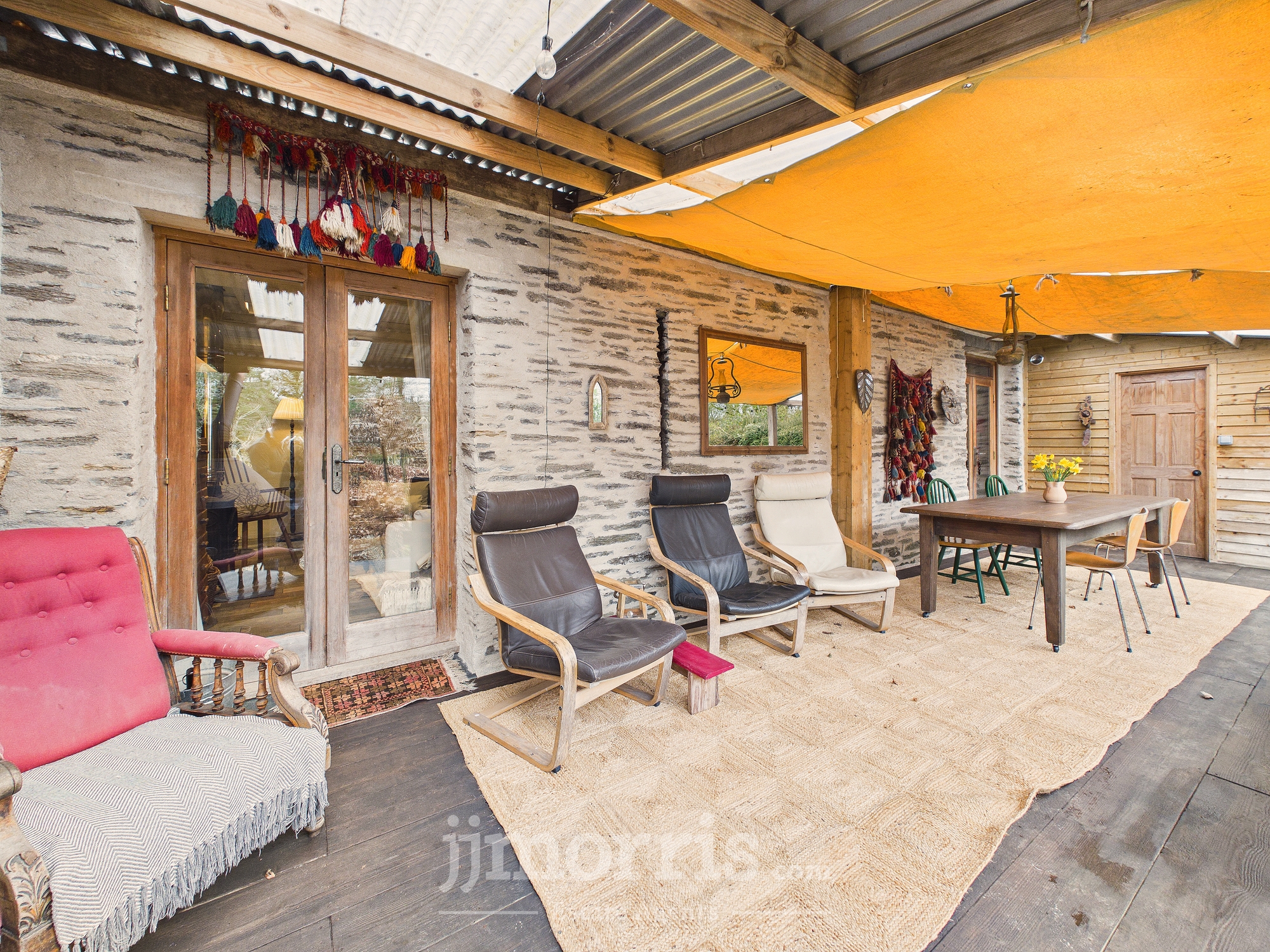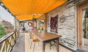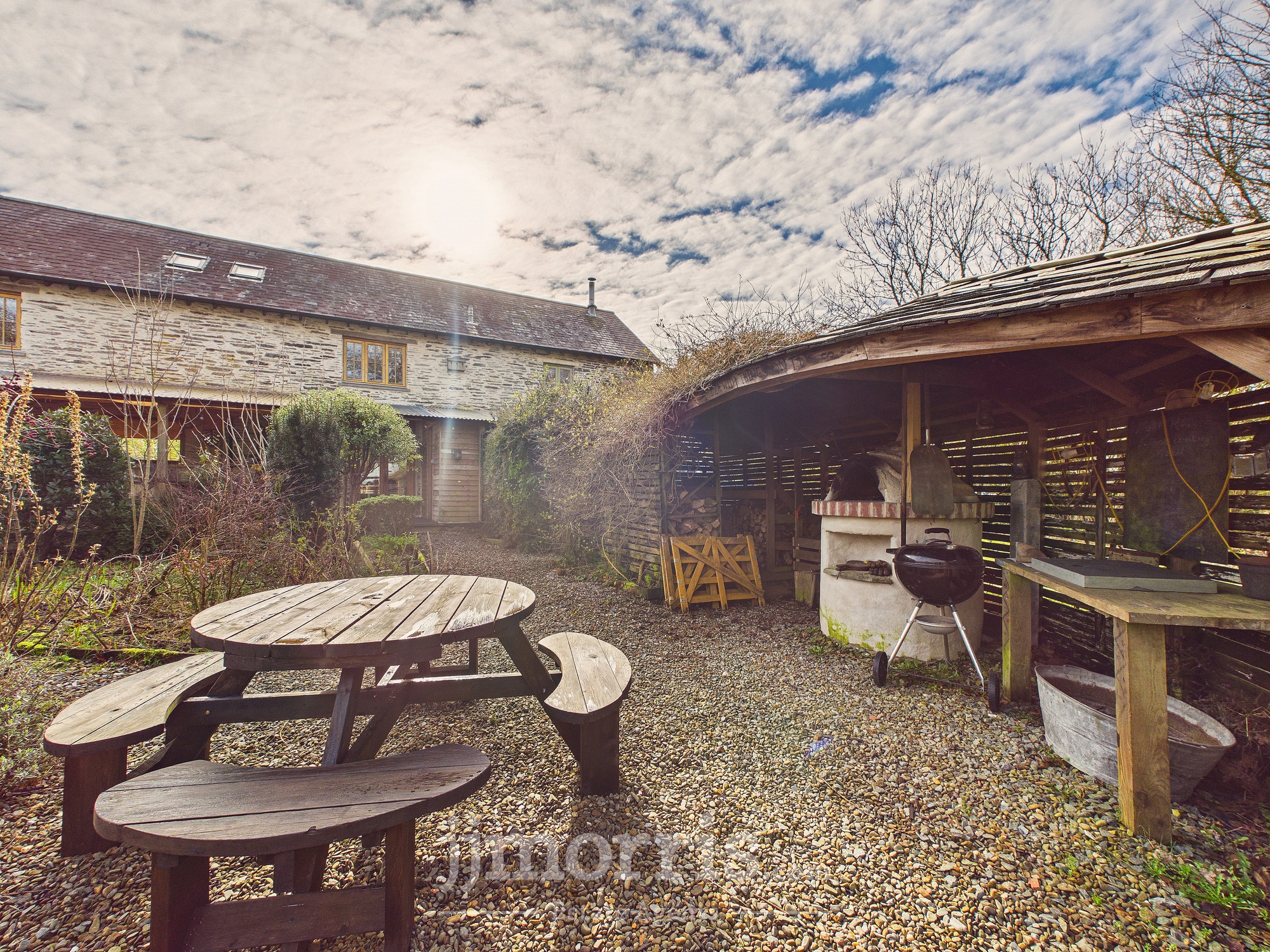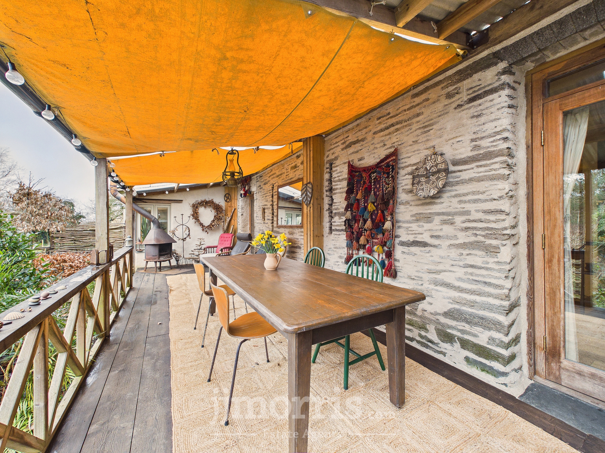 Door leading to spacious veranda with table and seating area. Leads to back garden areas with seating areas and pizza oven and wood storage shed. Veranda has w/c with wash basin, washing machine and shelving.