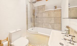 "P" shaped bath with curved screen and shower over, tiled surround, pedestal hand wash basin, heated towel rail, low flush WC. Tiled flooring and engineered oak flooring. Doors to both hall and bedroom. Velux rooflight and extractor fan. Mirror and shaver socket/light.