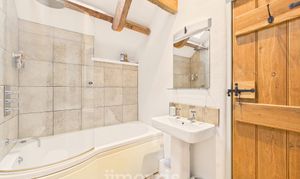Wall mounted wash basin, low flush WC, short panel bath with shower and screen over, tiled surround, recess spotlights, exposed beams, extractor fan. Frosted window to hallway.