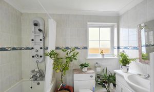 Dimensions: 2.64m x 1.63m (8'8" x 5'4" ). With ceramic tile floor, 2 uPVC double glazed windows, white suite of 'L' shaped Bath with shower attachment, Wash Hand Basin in a vanity surround and WC, fully tiled walls, tiled shelf, toilet roll holder, towel ring, electrically heated towel rail/radiator, wall mirror with 2 lights over, shaver point, multi jet shower over bath, extractor fan, coved ceiling, ceiling light and robe hooks.