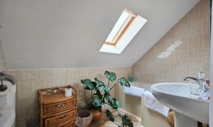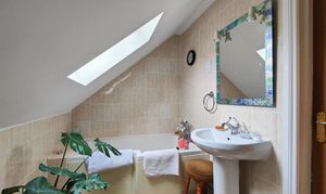 Dimensions: 2.44m x 1.78m (8'0" x 5'10" ). With fully tiled walls, white suite of 'L' shaped panelled Bath with shower attachment, Wash Hand Basin and WC, radiator, ceramic tile floor, toilet roll holder, electrically heated towel rail/radiator, wall mirror with 2 lights over, towel ring, ceiling light, extractor fan, shaver point, Velux window and robe hook.