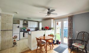 Dimensions: 5.92m x 3.86m maximum (19'5" x 12'8" maximum ). With a part ceramic tile floor and a part laminated oak floor, ceiling light, range of fitted floor and wall cupboards, uPVC double glazed French door to Rear Garden, 2 uPVC double glazed windows, part tile surround, ample power points, built in Indesit electric Single Oven/Grill, 4 ring Ceramic Cooker Hob, Cooker Hood (externally vented), plumbing for automatic washing machine, part tile surround, fridge and freezer recesses, Beko LP Gas freestanding Cooker with 4 ring Hob, Oven and Grill, cooker box, inset one and a half bowl stainless steel sink unit with mixer tap, mains smoke detector, ceiling light/fan in Dining area, ceiling light in Kitchen and door to:-