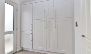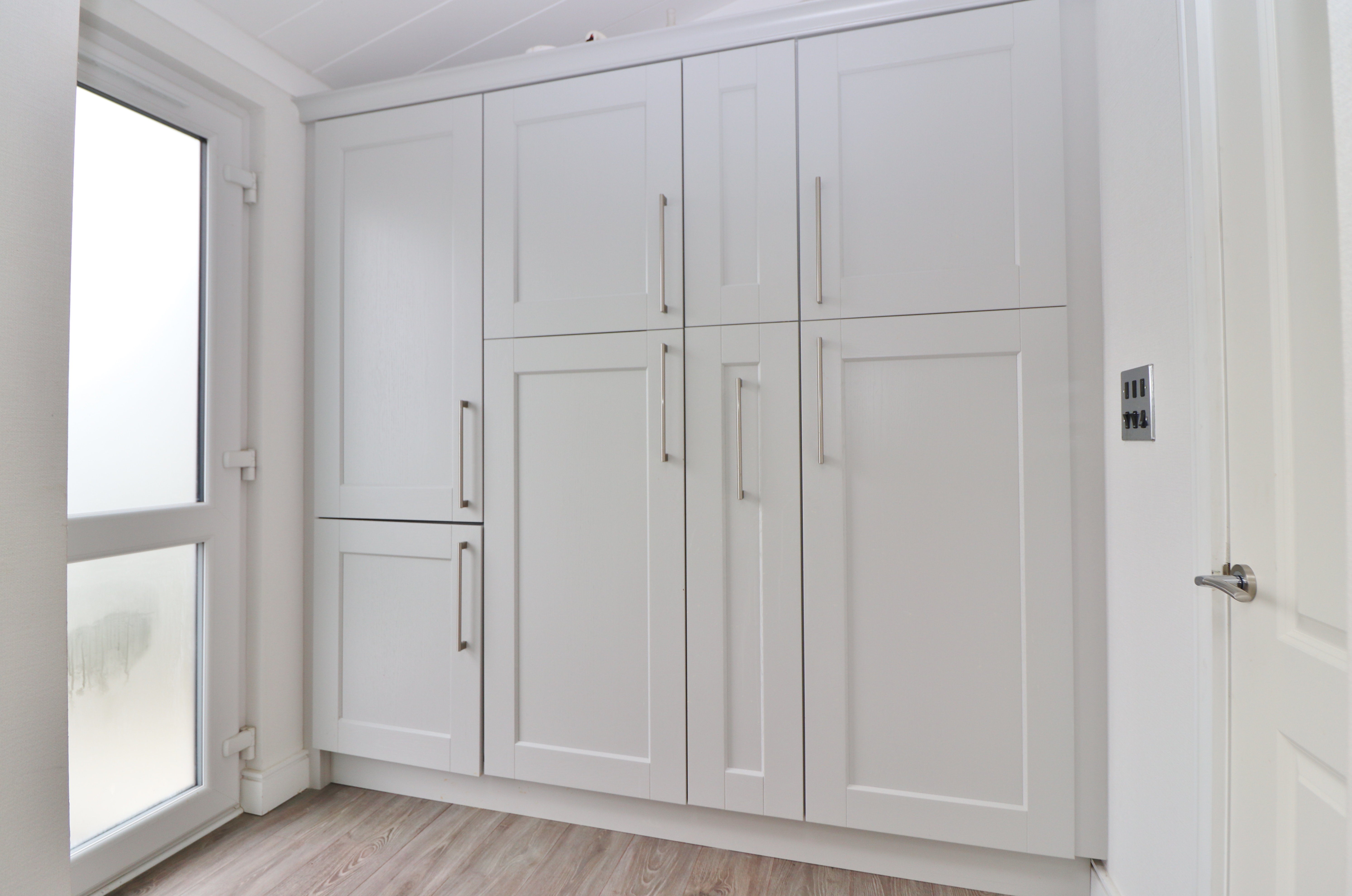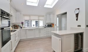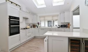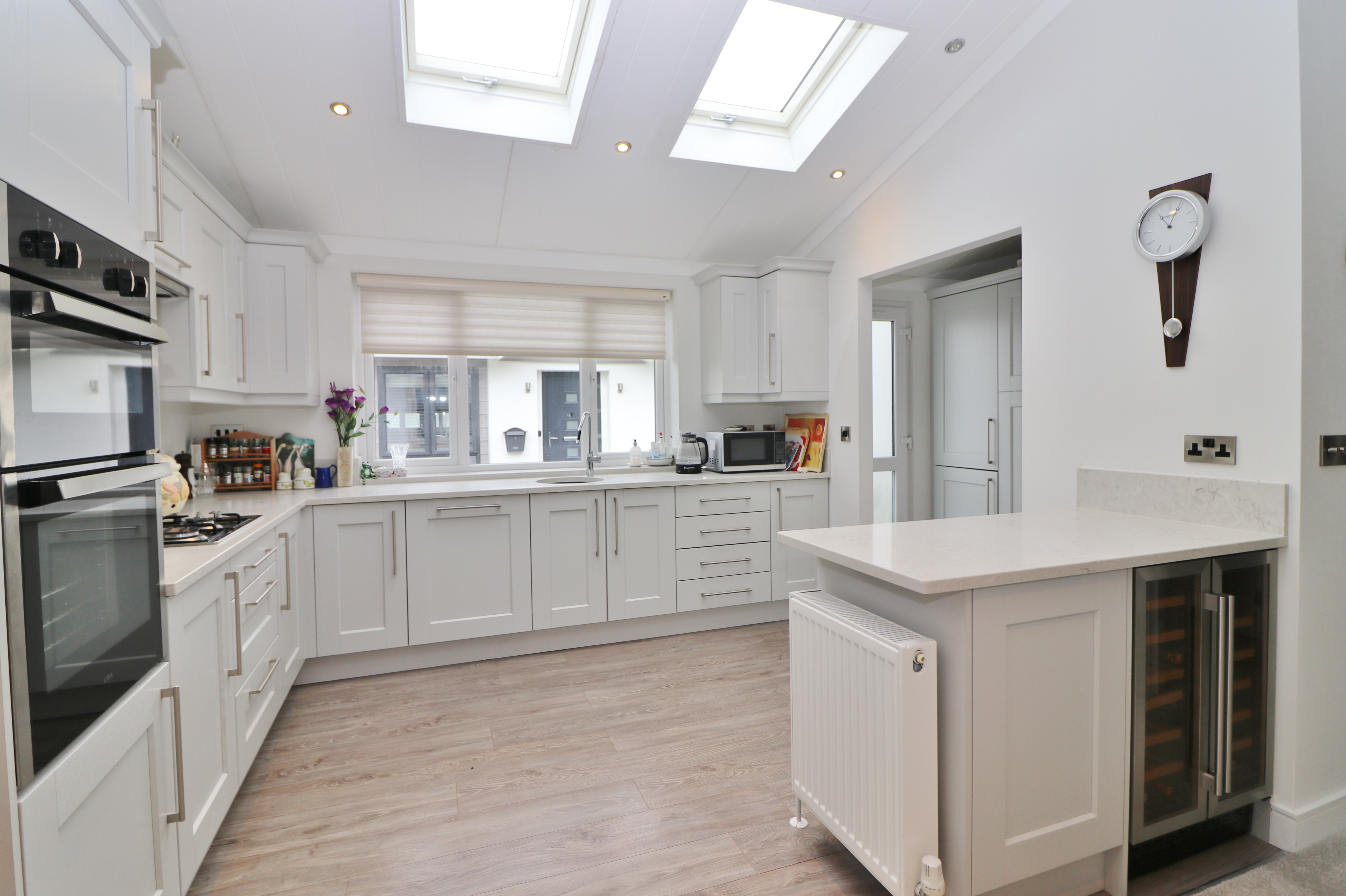 The stylish kitchen has been fitted with a range of grey, shaker style wall and base units with a built-in double oven, gas hob with extractor over, an integrated dishwasher and washing machine, as well as a wine cooler. An opening to the side leads through to a hallway which has a door to the side and offers further storage and an integrated full-height fridge and full-height freezer.