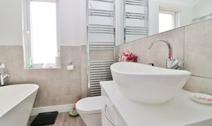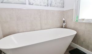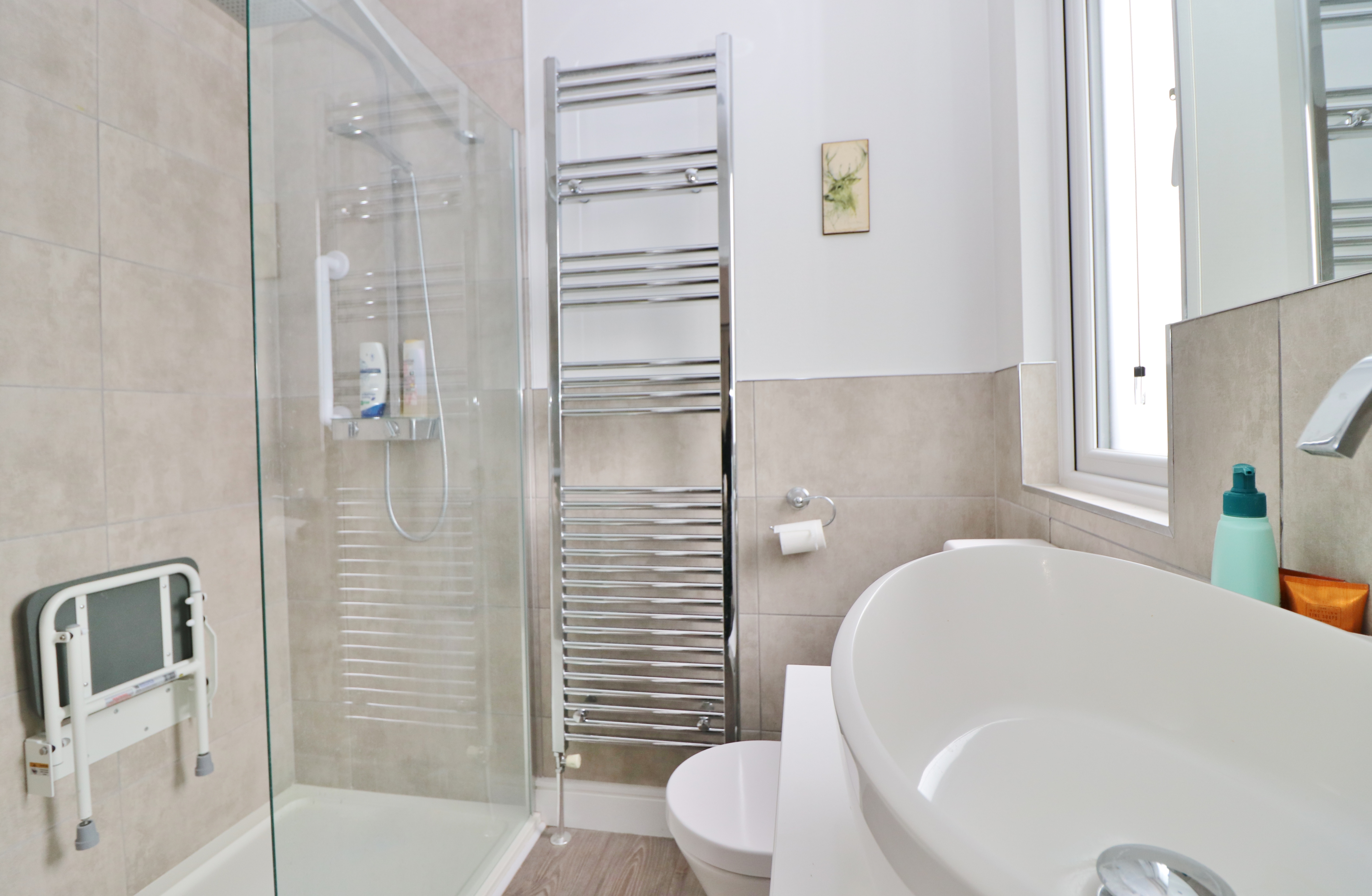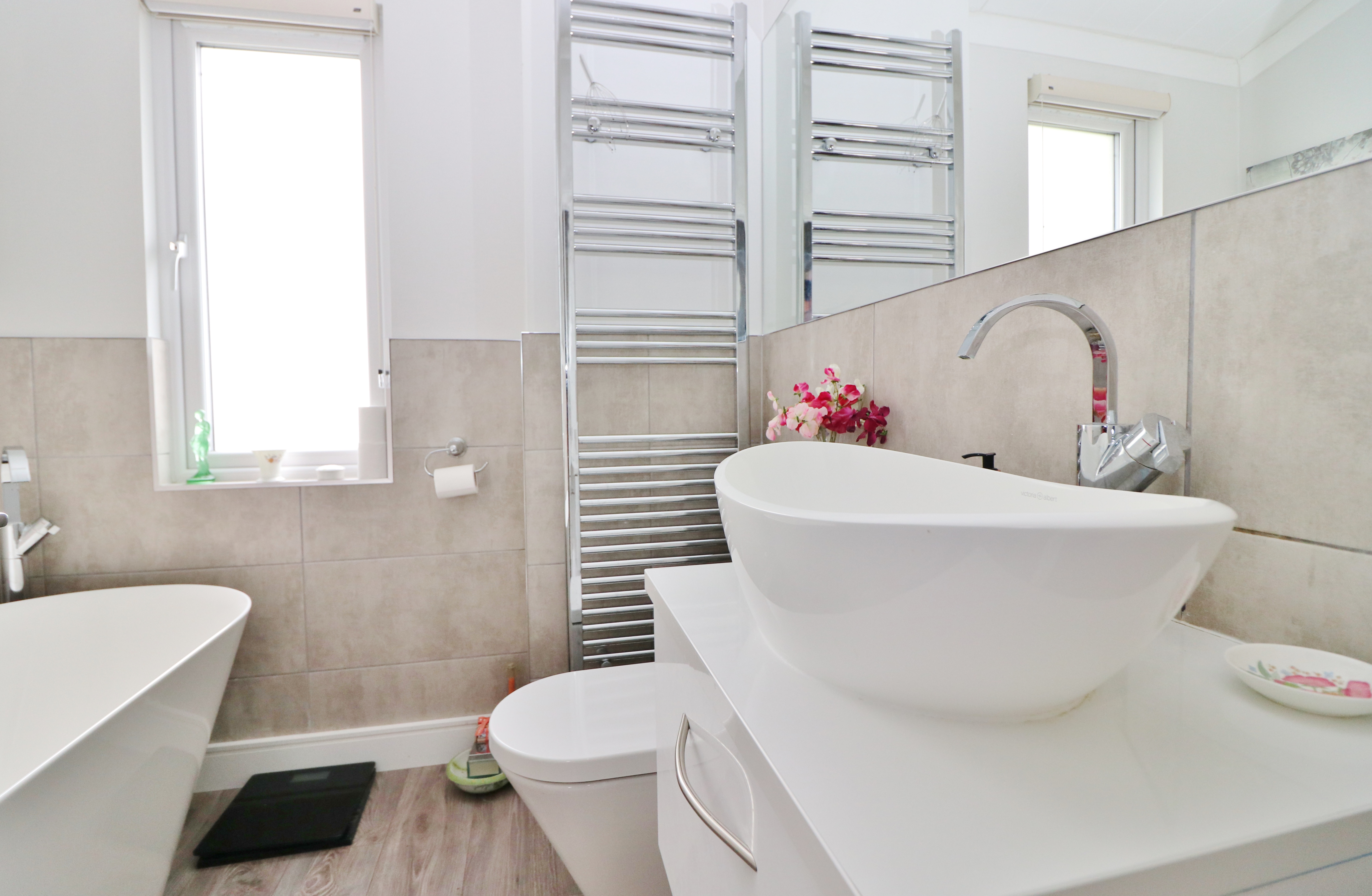 Bedroom two, which is also a double room, has a built-in wardrobe and a window to the side, whilst the adjacent bathroom has a free-standing bath, vanity wash hand basin, WC, heated towel rail and a window to the side.