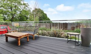 The generous lounge has a window to the side, a feature fireplace and two sets of bi-folding doors to the front leading onto the balcony which enjoys views across the River Hamble.