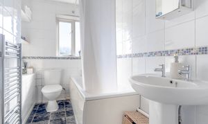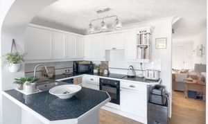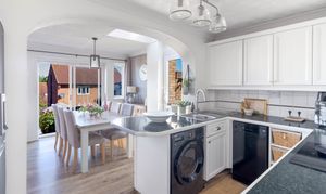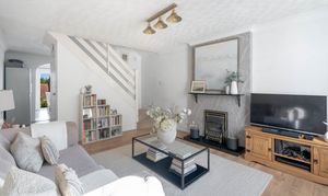 The entrance porch leads to a comfortable-sized sitting room with a large picture window overlooking a small green to the front of the property. The stairs rise to the first floor, with a built-in cupboard below. The impressive, open-plan kitchen/dining room is a wonderfully light and well-planned space, due to an extension to the rear of the property. Comprising a comprehensive range of wall and base units with space for appliances and a generous dining area allows for a dining table and chairs comfortably seating six, with French doors leading nicely out to the attractive garden. The first floor comprises two double bedrooms, the rear with a built-in wardrobe and the front bedroom also features a range of wardrobes to be included in the sale. The modern bathroom includes a bath with a shower over and tiling to the walls.