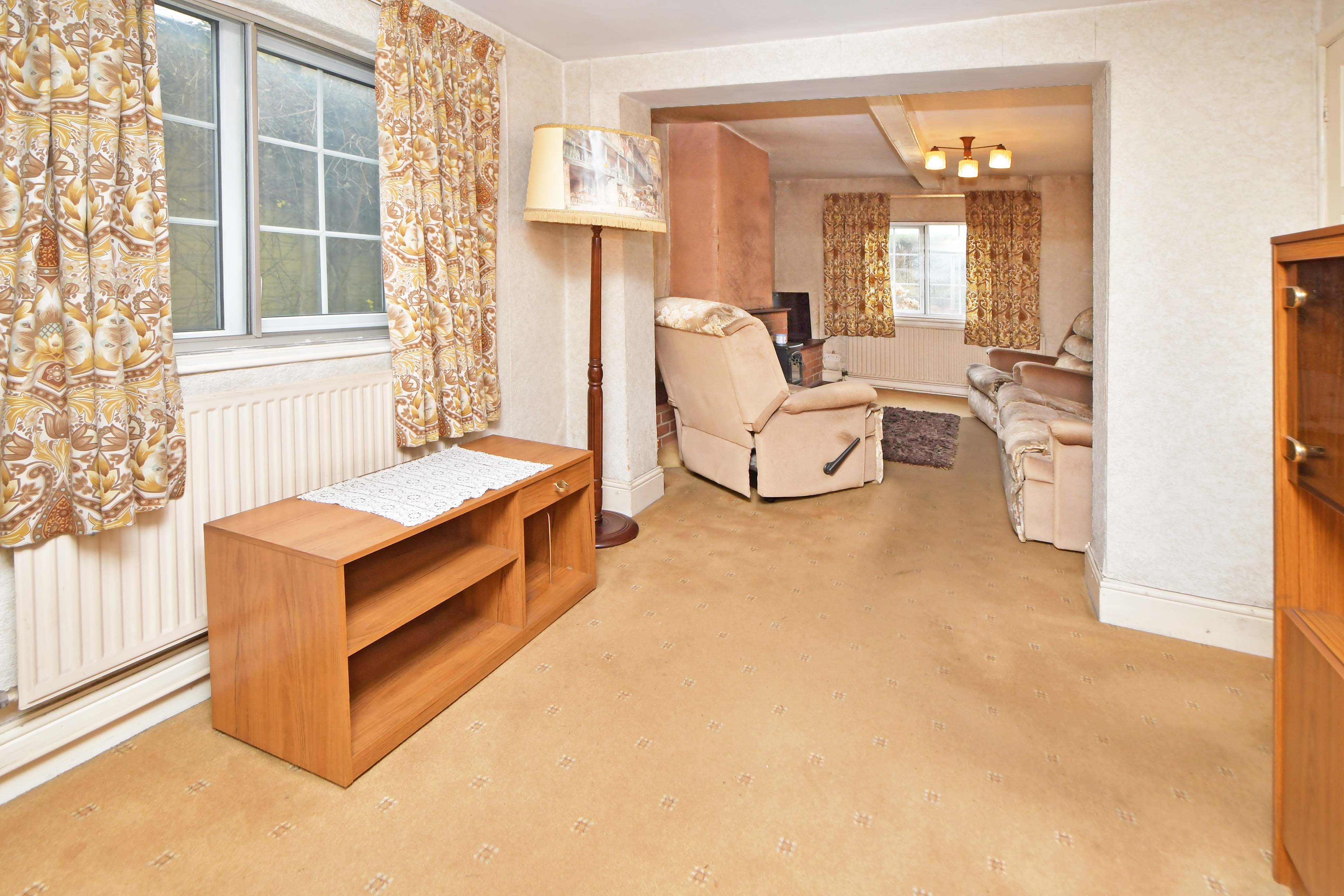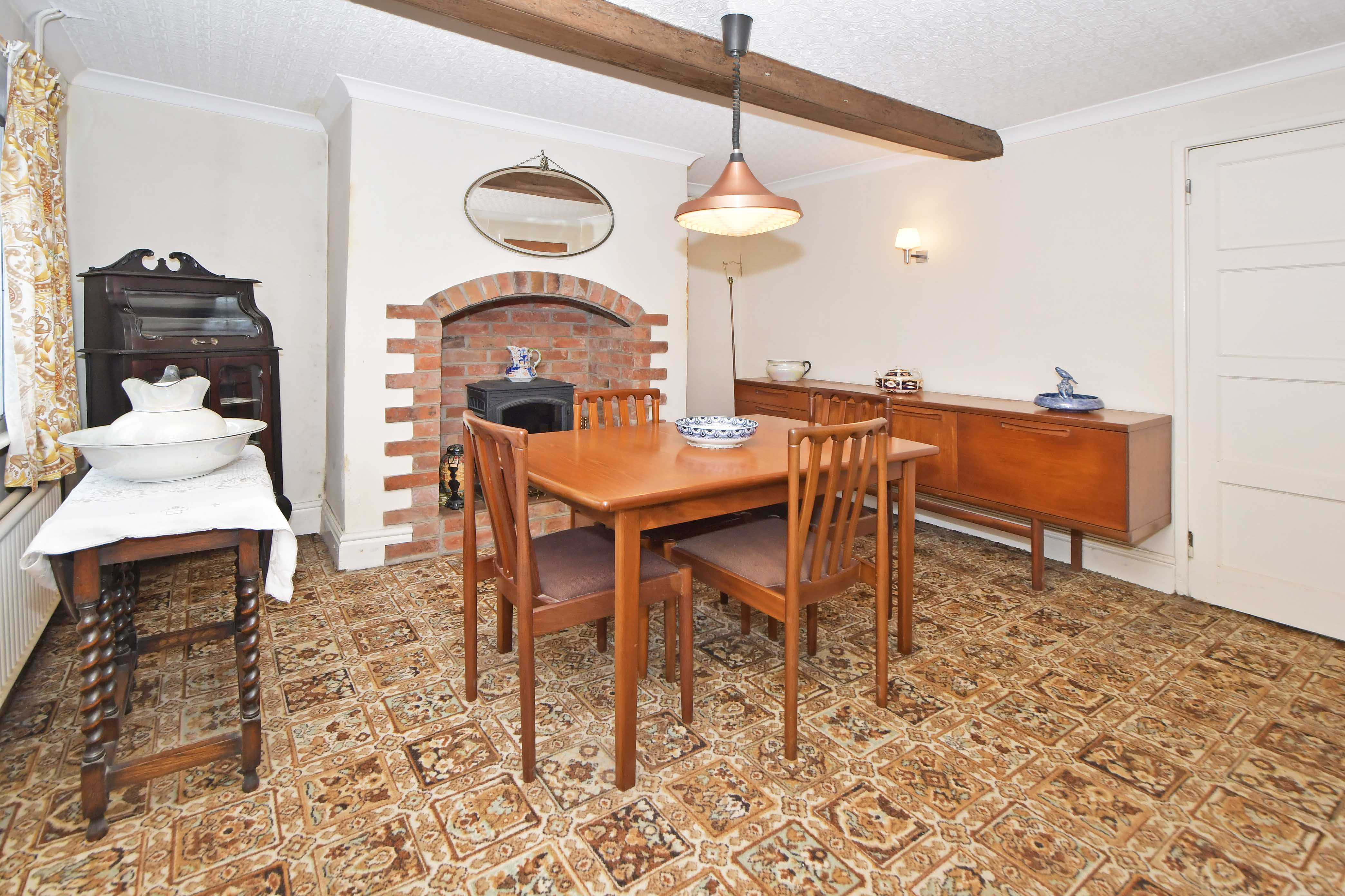 With views to the front aspect, the room has a feature fireplace, storage cupboard under the stairs and a door leading to the kitchen at the rear.