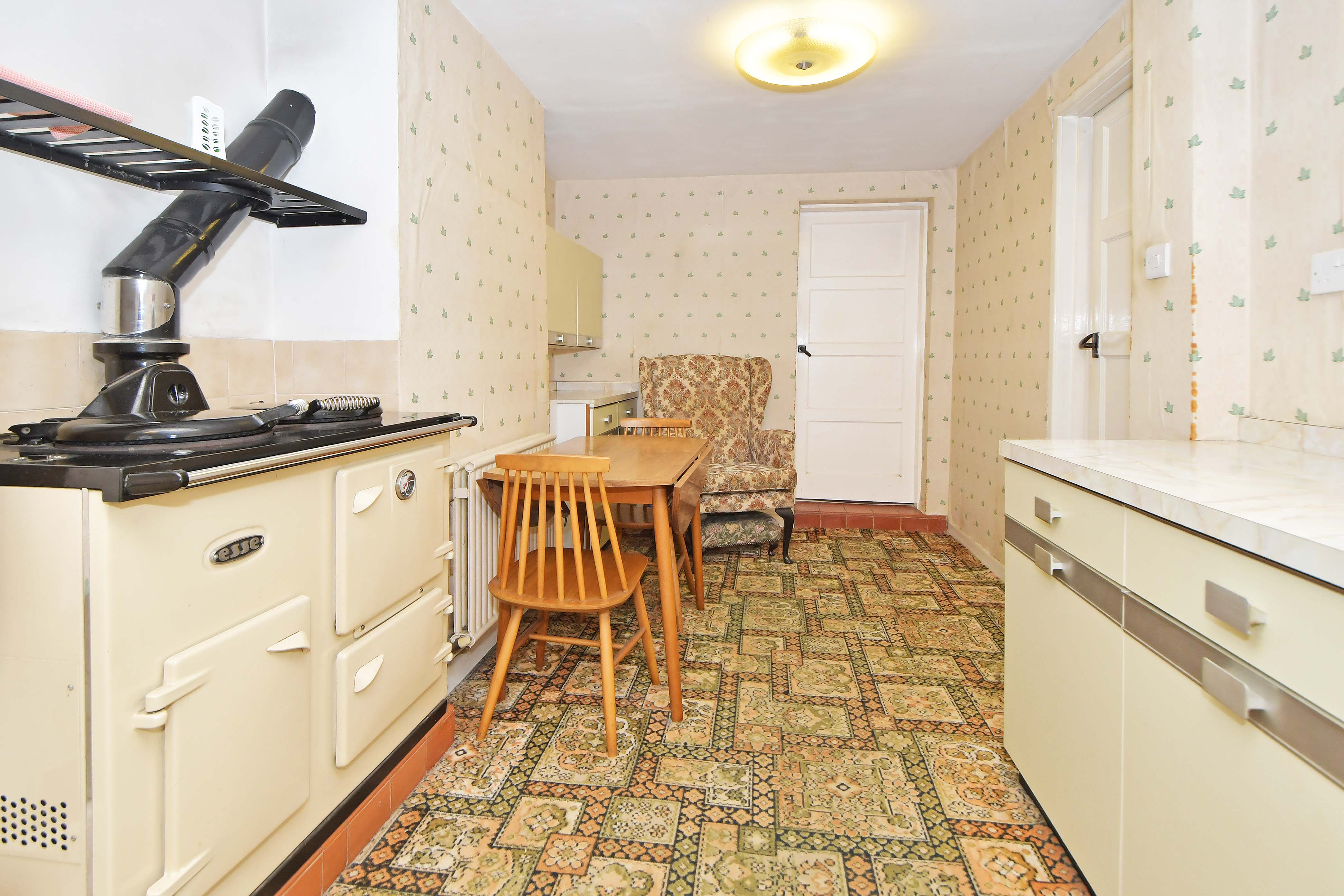 The kitchen has an oil fired Esse stove and a range of base units with a worksurface over. There are windows to the front and side aspects.