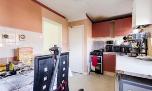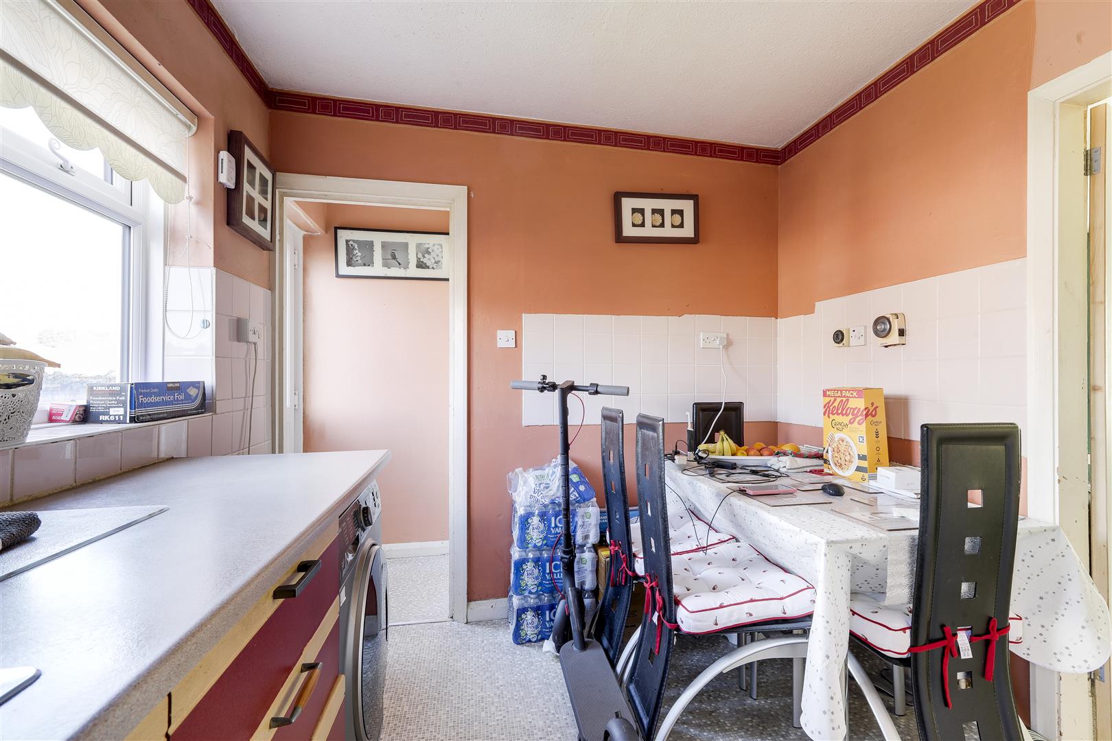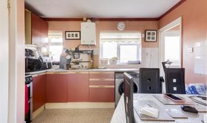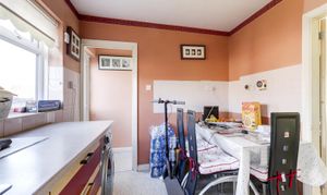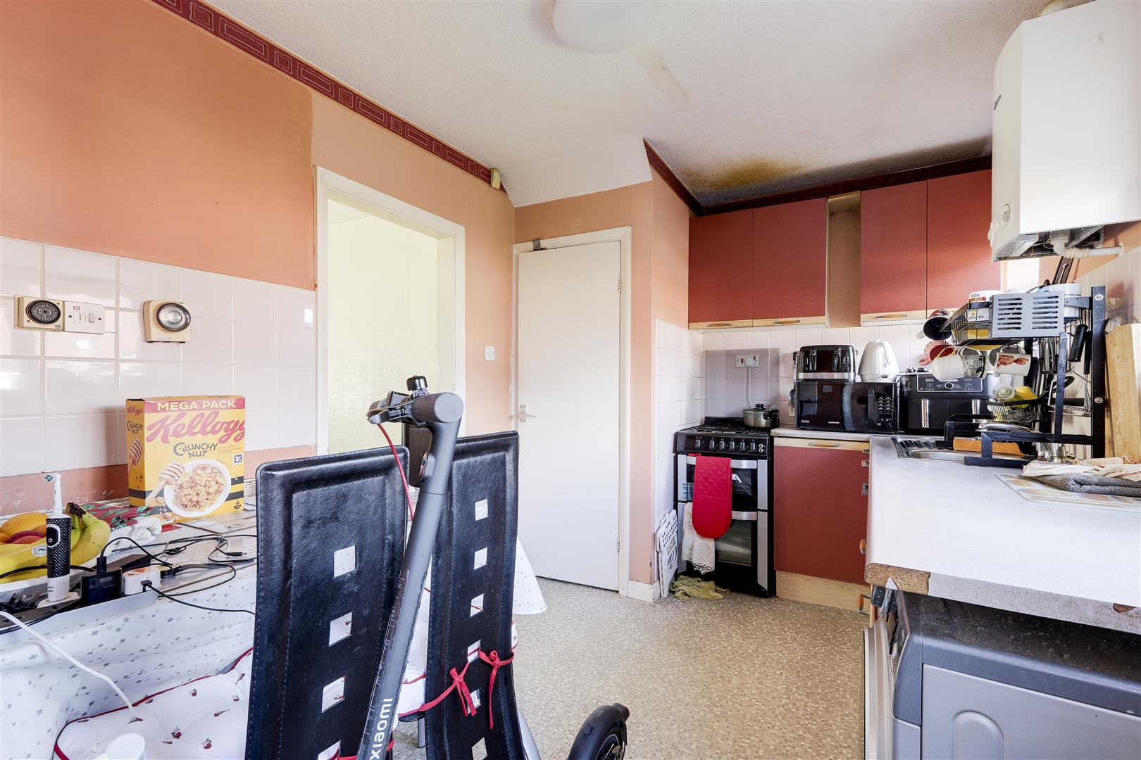 Dimensions: 3.53 x 2.50 (11'6" x 8'2"). The kitchen has a range of fitted base and wall units with rolled-edge worktops, a stainless steel sink with a drainer and a mixer tap, space for a cooker, washing machine, a wall-mounted boiler, partially tiled walls, an in-built storage cupboard, vinyl flooring and a UPVC double-glazed obscure window to the rear elevation.