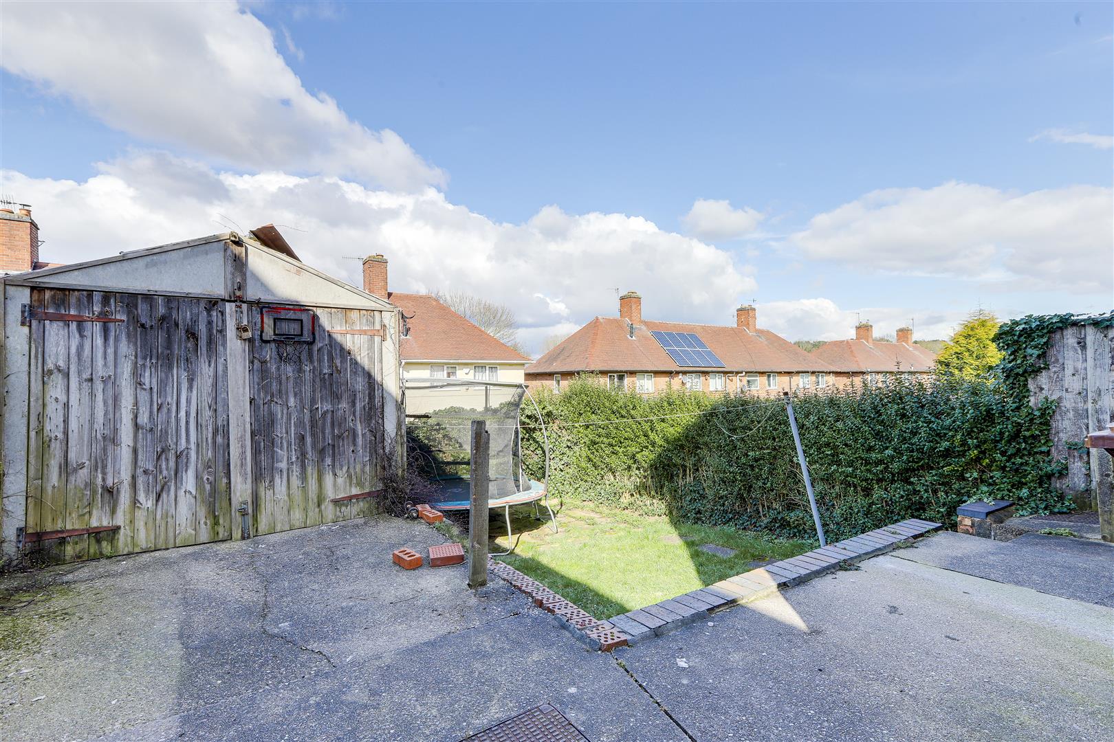 to the rear of the property is an enclosed garden with a concrete patio area, steps leading down the lawn, fence panelling and hedge border boundaries.