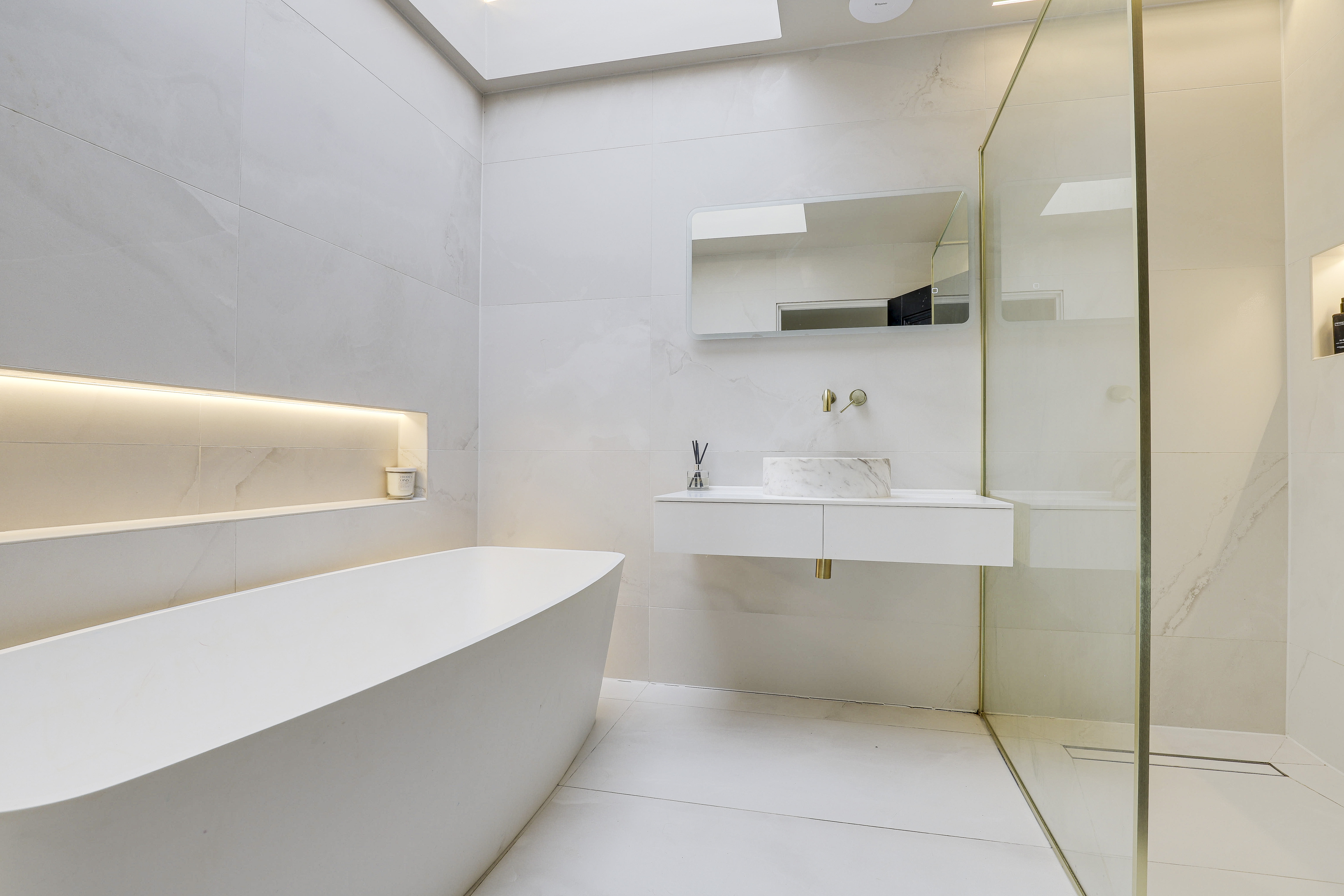 The bathroom is fitted with a concealed dual flush WC and a marble countertop wash basin with wall mounted taps. It features a Bain Ultra Opus freestanding thermomasseur bath with a floor standing mixer tap and handheld shower, alongside a walk in double shower enclosure with an overhead rainfall shower and wall mounted fixtures. The space is enhanced by recessed display alcoves, LED strip lighting and floor to ceiling white onyx tiles, with a skylight window finished with LED lighting trim.