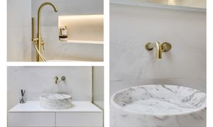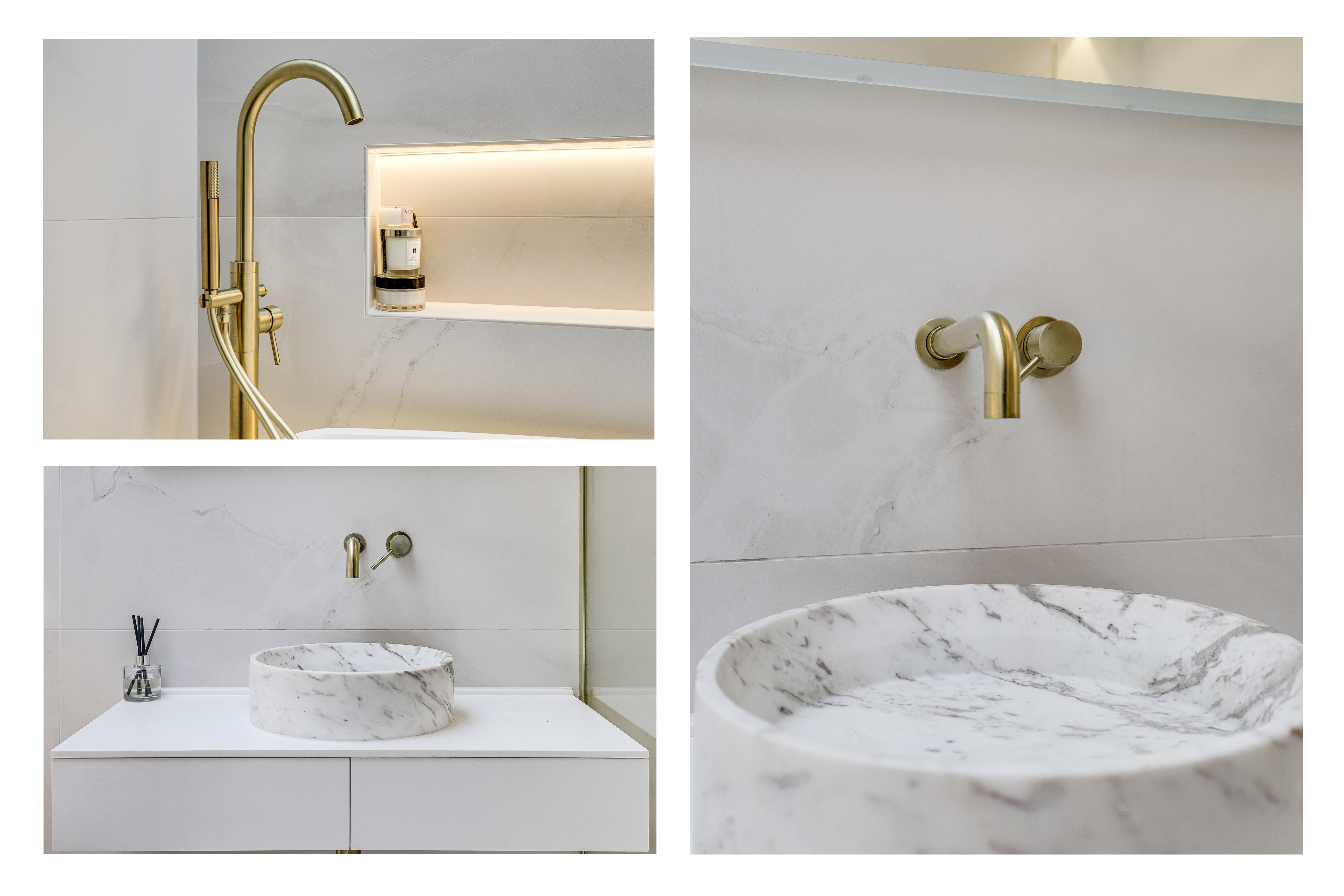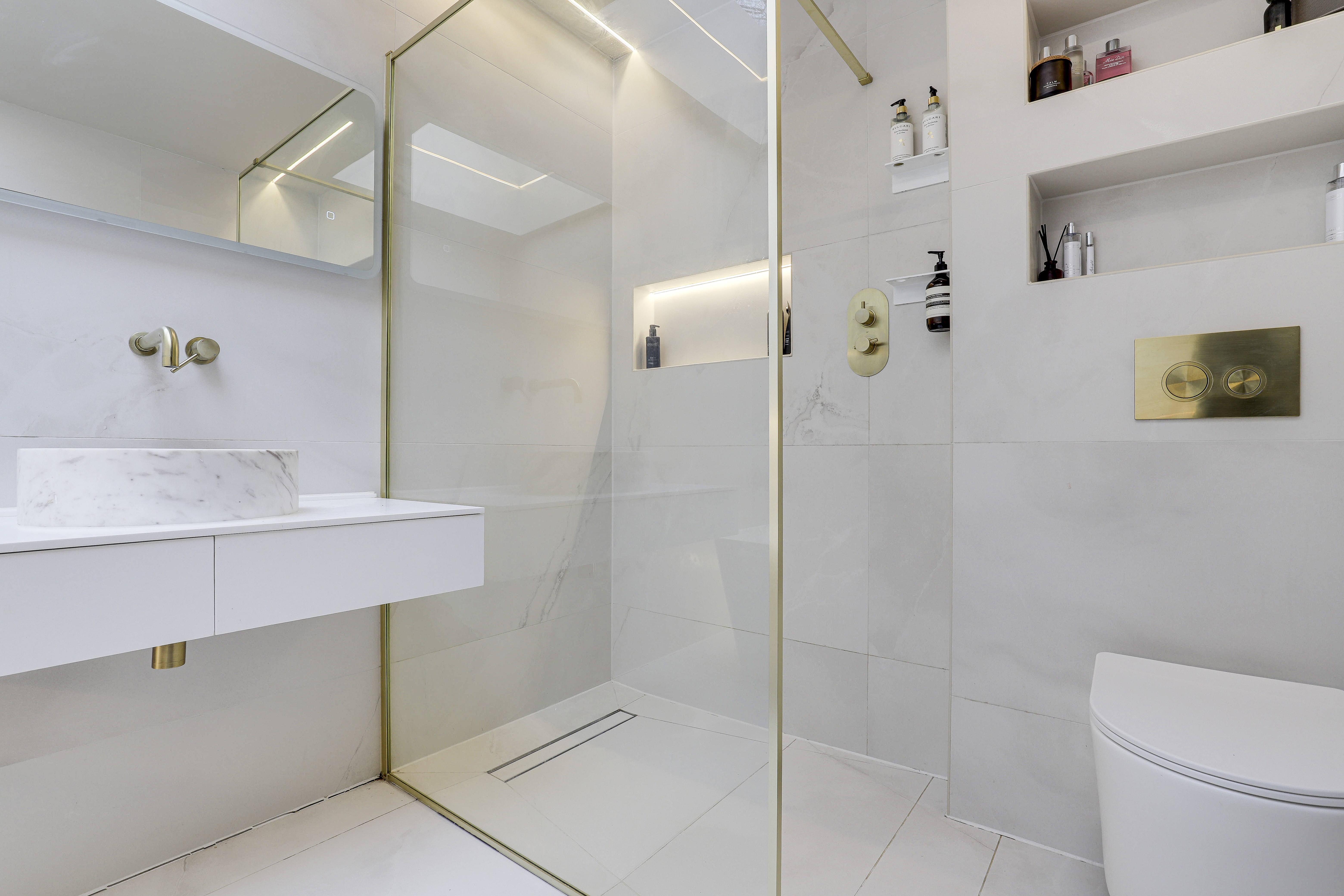 This space is fitted with a concealed dual flush WC and a marble countertop wash basin with wall mounted taps. It continues the herringbone flooring with underfloor heating and is finished with recessed spotlights, with direct access into the boiler room.
