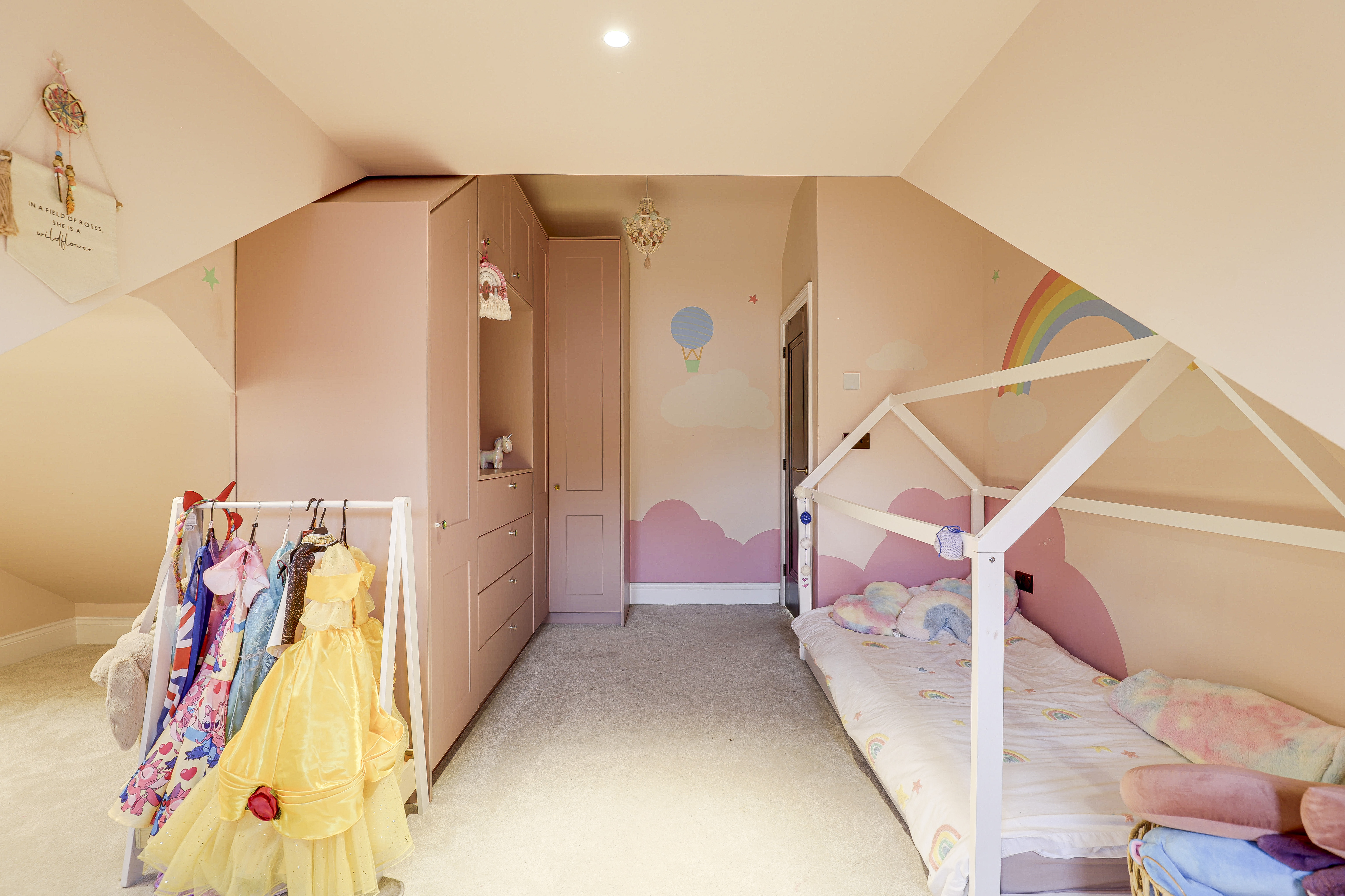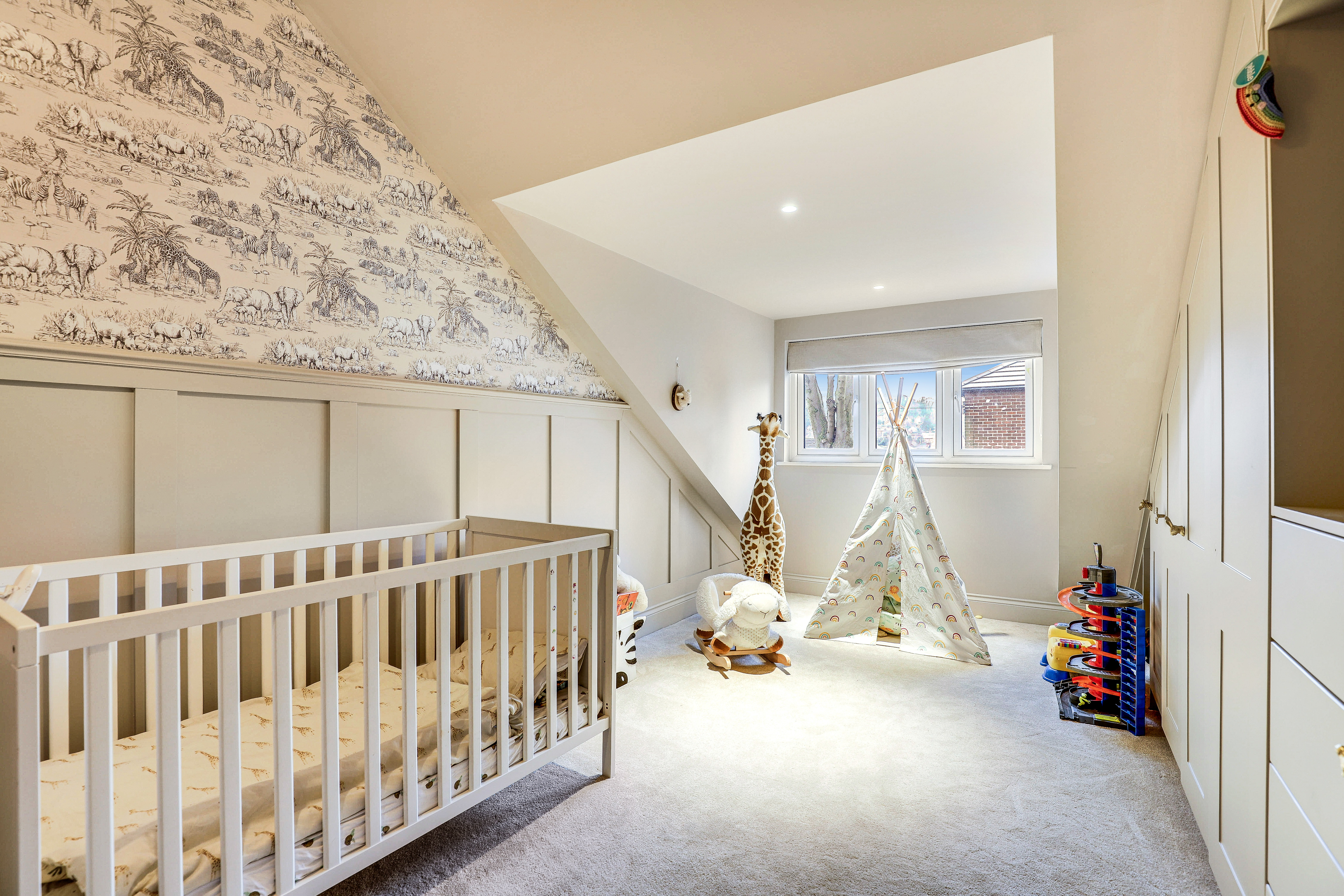 The third bedroom features carpeted flooring with underfloor heating, panelled feature walls and wall to wall bespoke fitted wardrobes with a chest of drawers and overhead storage cupboards. It is finished with recessed spotlights and a UPVC double glazed window to the side elevation.