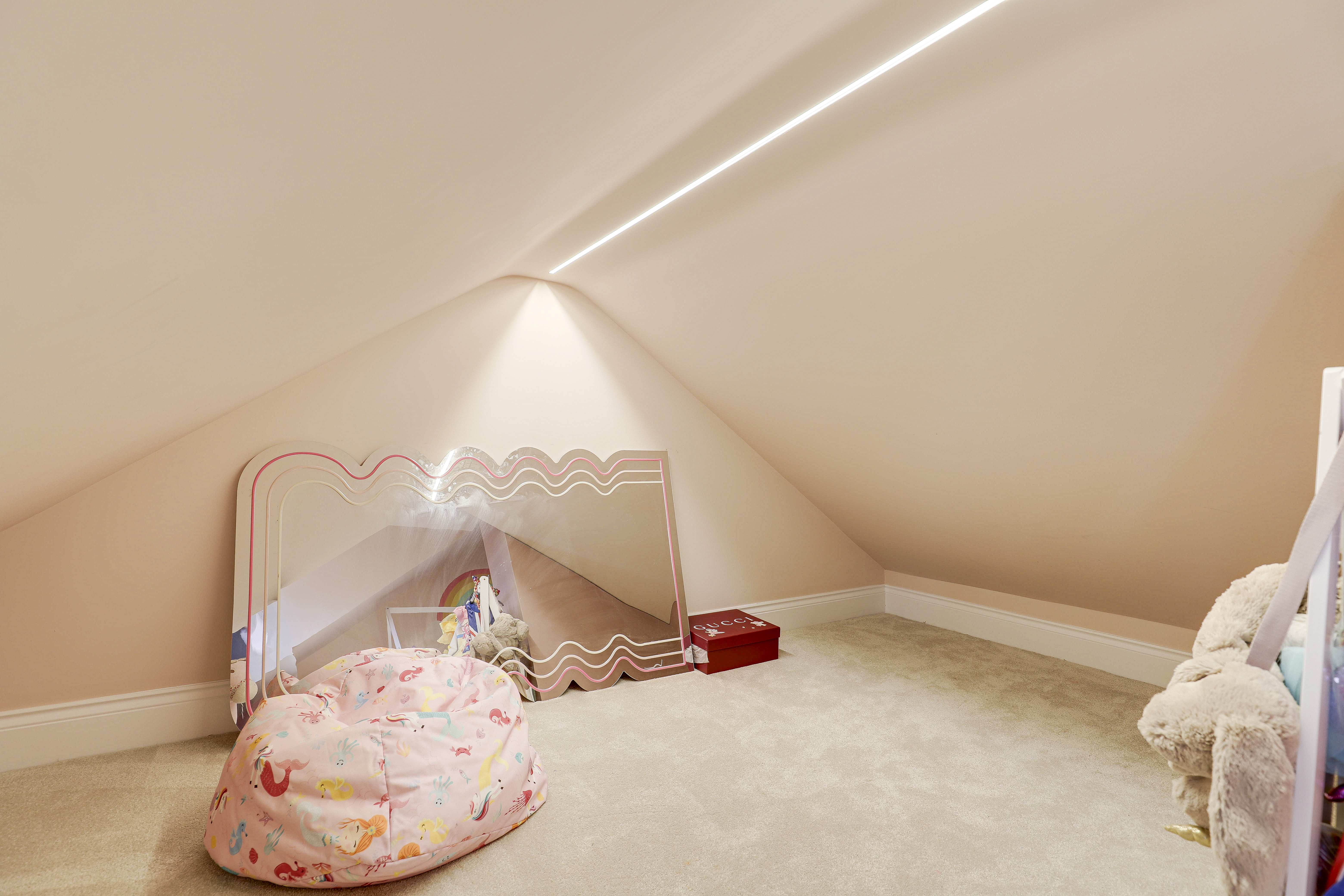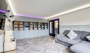 The snug features herringbone flooring with underfloor heating, panelled feature walls and a double tray ceiling with colour changing LED lighting. There is a TV point and bespoke wall to wall fitted storage cupboards and shelving.