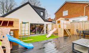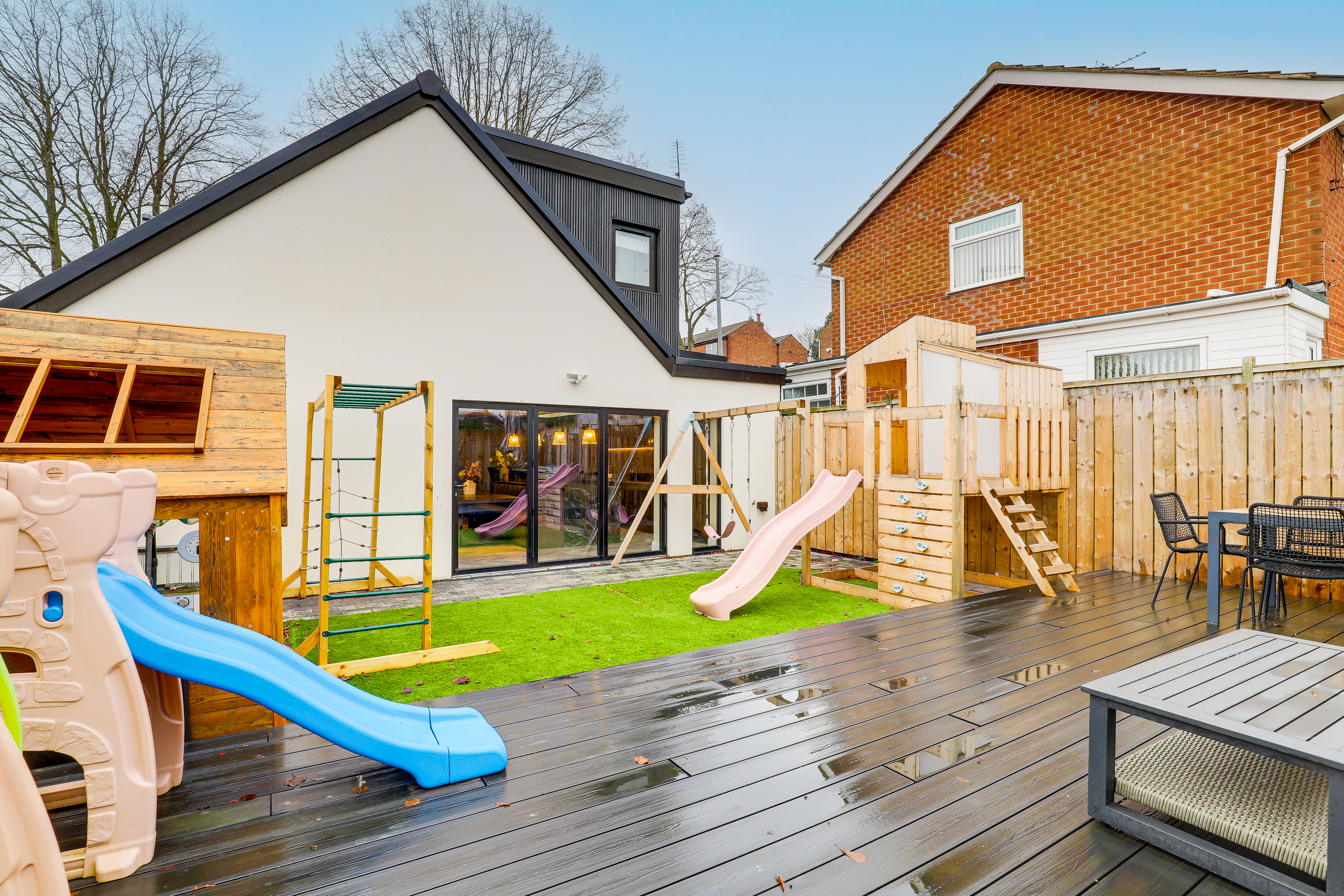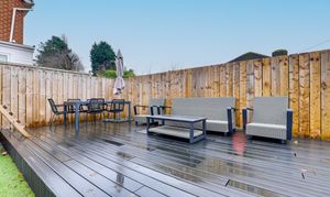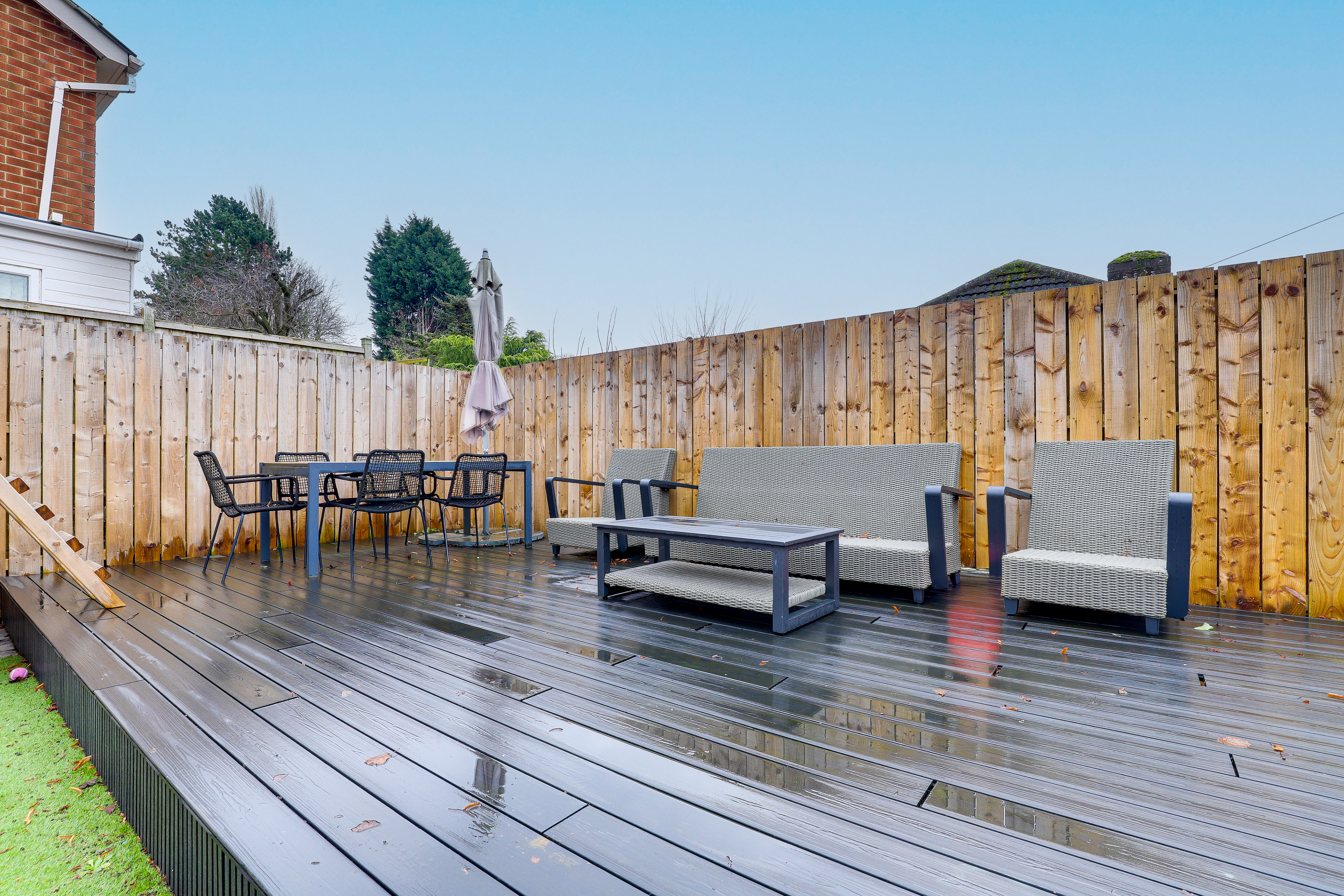To the side is a private enclosed garden featuring an artificial lawn and a raised composite decked area. The space benefits from external power sockets, outdoor lighting and fence panelled boundaries.