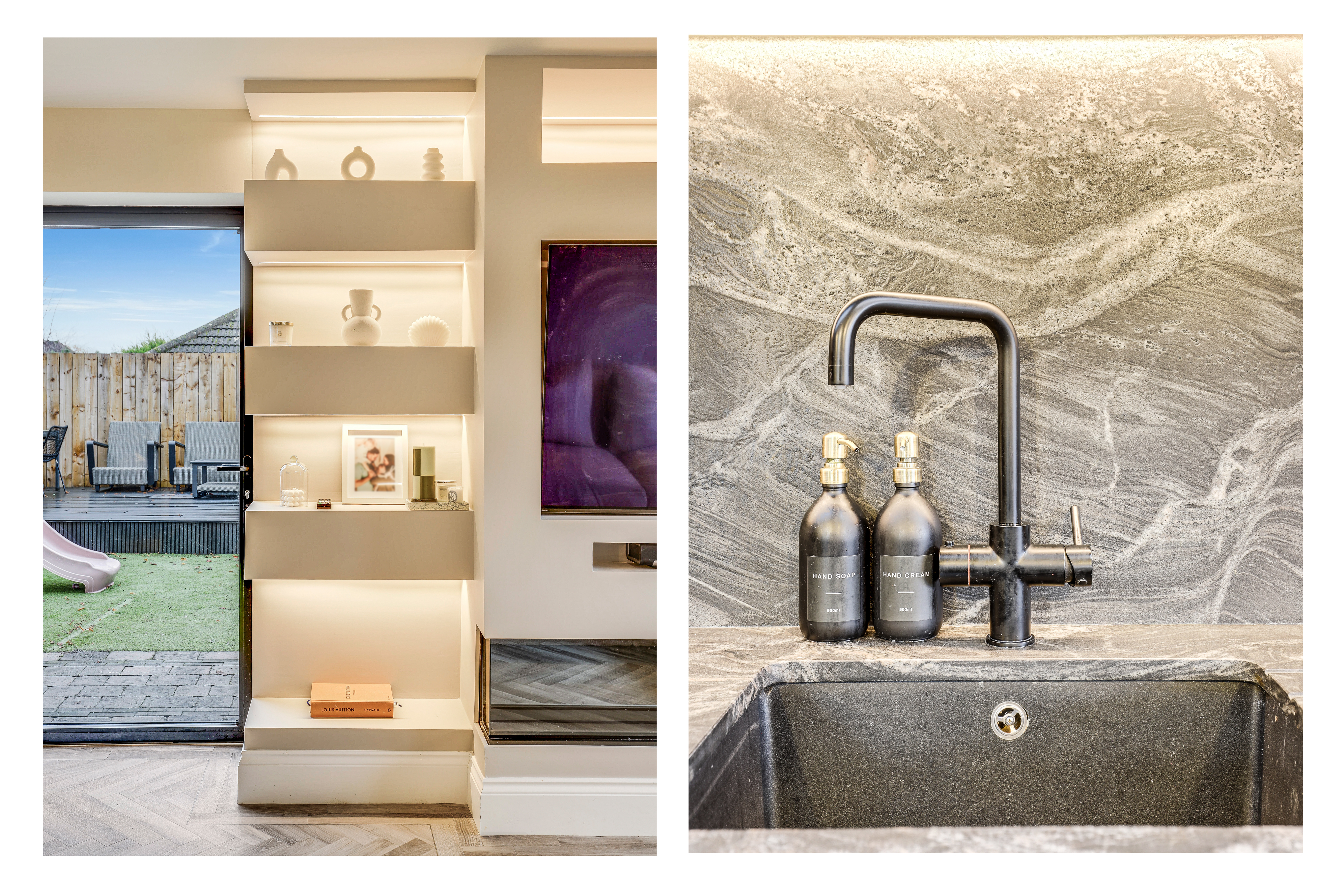 The open plan kitchen, dining and living area forms the heart of the home, designed for modern family living and entertaining. It features herringbone flooring with underfloor heating, sky lanterns and bi-folding doors opening onto the garden. The bespoke handleless kitchen offers granite worktops, display cabinets and an undermount sink with an instant hot water tap, alongside integrated appliances including two Neff ovens, a Neff microwave, Neff coffee machine, wine fridge and an induction hob with a downward extractor, plus a separate fridge and freezer. A built in seating area with a wireless charging point is incorporated into the island. The space is finished with dimmable recessed spotlights, LED lighting, a media wall with TV point and electric fireplace, a UPVC double glazed front window and a full height aluminium side window.