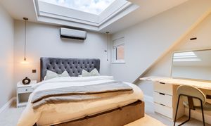 The main bedroom features carpeted flooring with underfloor heating and a wall mounted air conditioning unit. There are pendant light points either side of the bed, dimmable recessed spotlights and a skylight window with a retractable blind. The room benefits from a range of fitted shaker style wardrobes with a chest of drawers and dressing table, a TV point and a UPVC double glazed window to the side elevation.