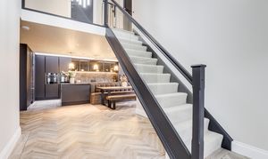 The entrance hall features herringbone flooring with underfloor heating, a carpeted staircase with a dark timber balustrade and glass panels, and a built in cloak cupboard. There are UPVC double glazed obscure windows to the front elevation and a composite door providing access into the accommodation.