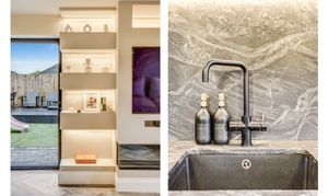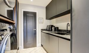 The utility room is fitted with handleless base and wall units with granite worktops and an undermount sink with a swan neck mixer tap. There is space and plumbing for a washing machine and separate tumble dryer. The room continues the herringbone flooring with underfloor heating and is finished with recessed spotlights.