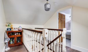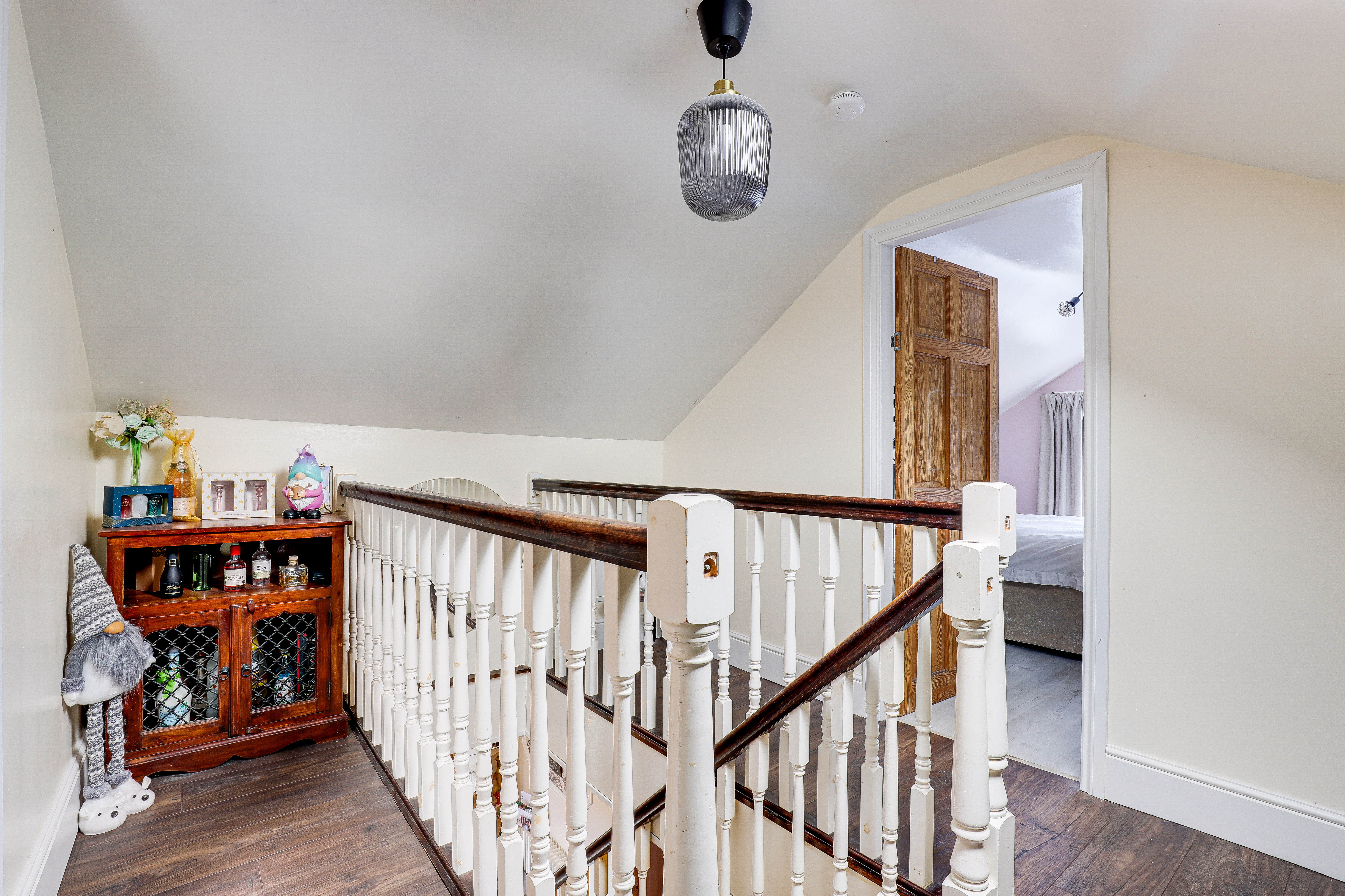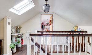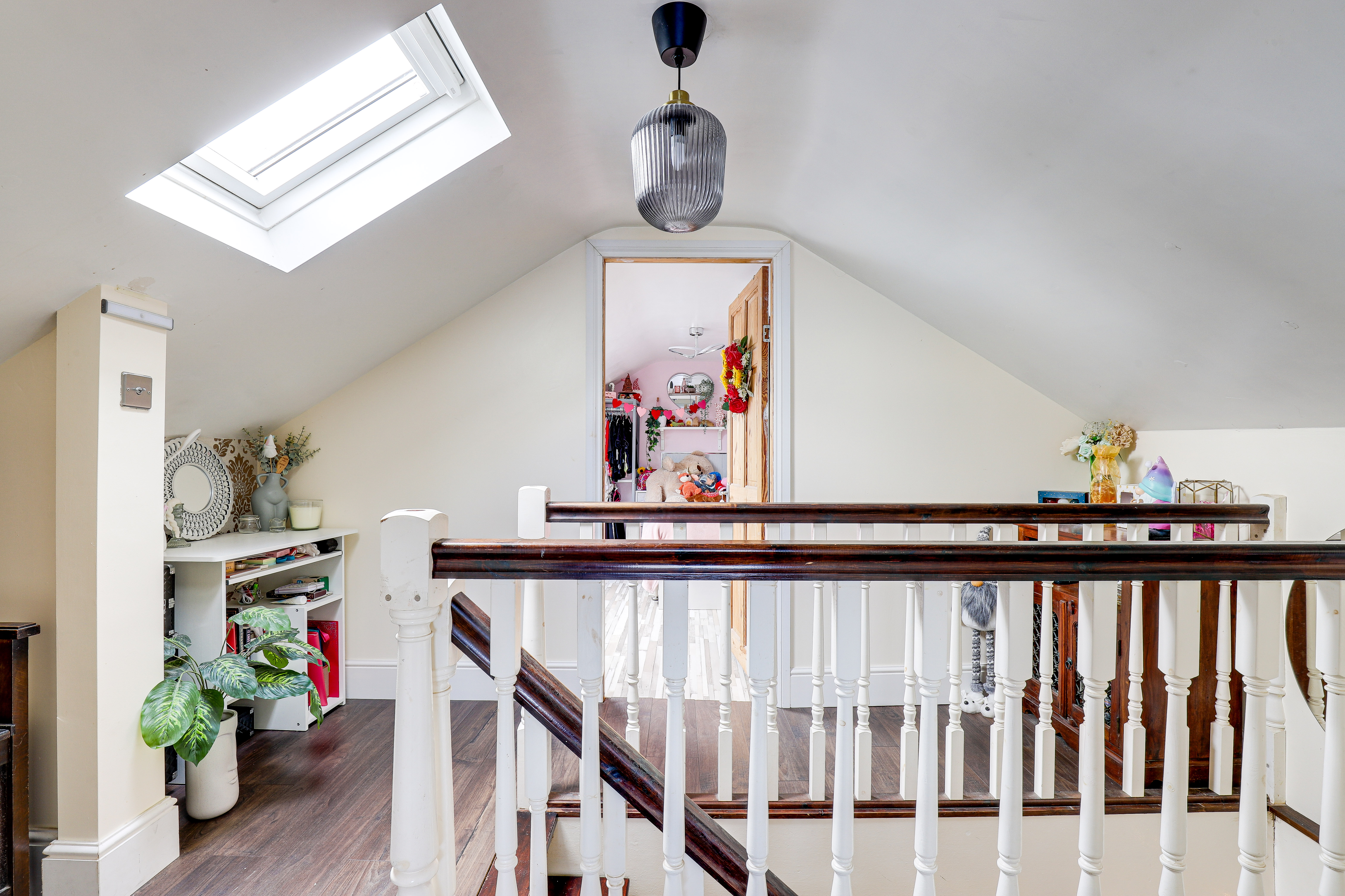 The landing has a Velux window, wood-effect flooring, and access to two bedrooms.