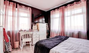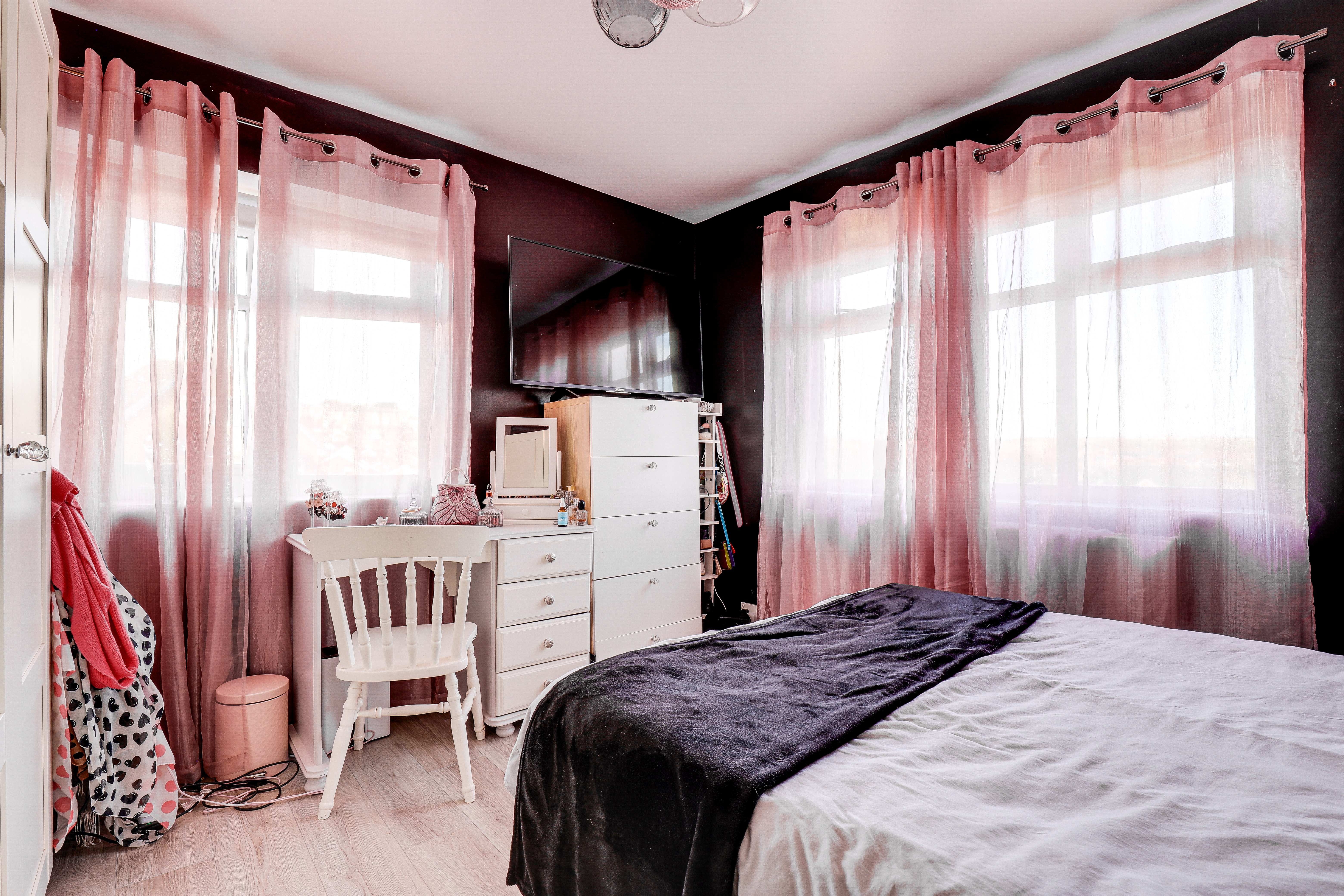 The main bedroom has two UPVC double glazed windows to the front and side elevation, a radiator, and laminate flooring.