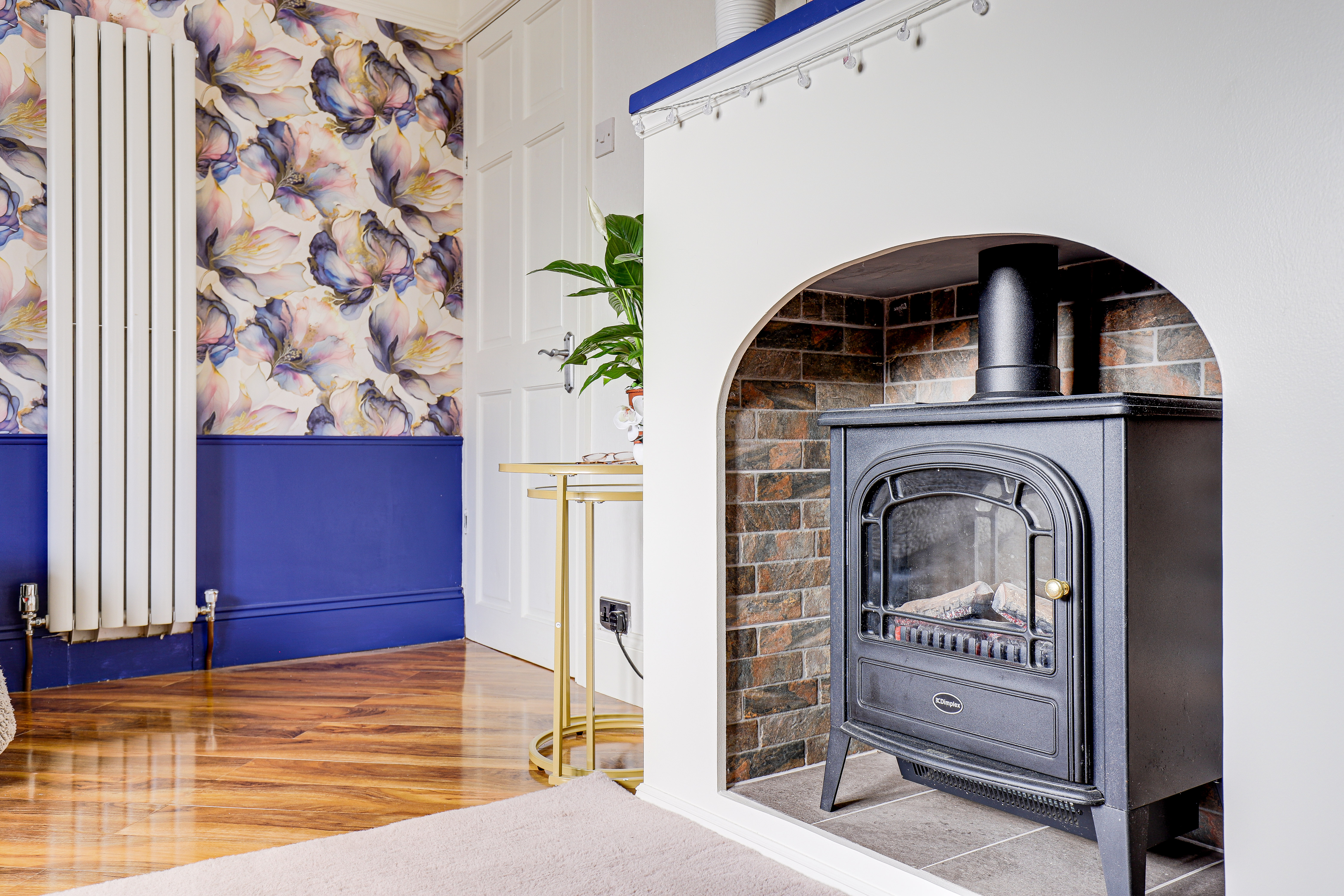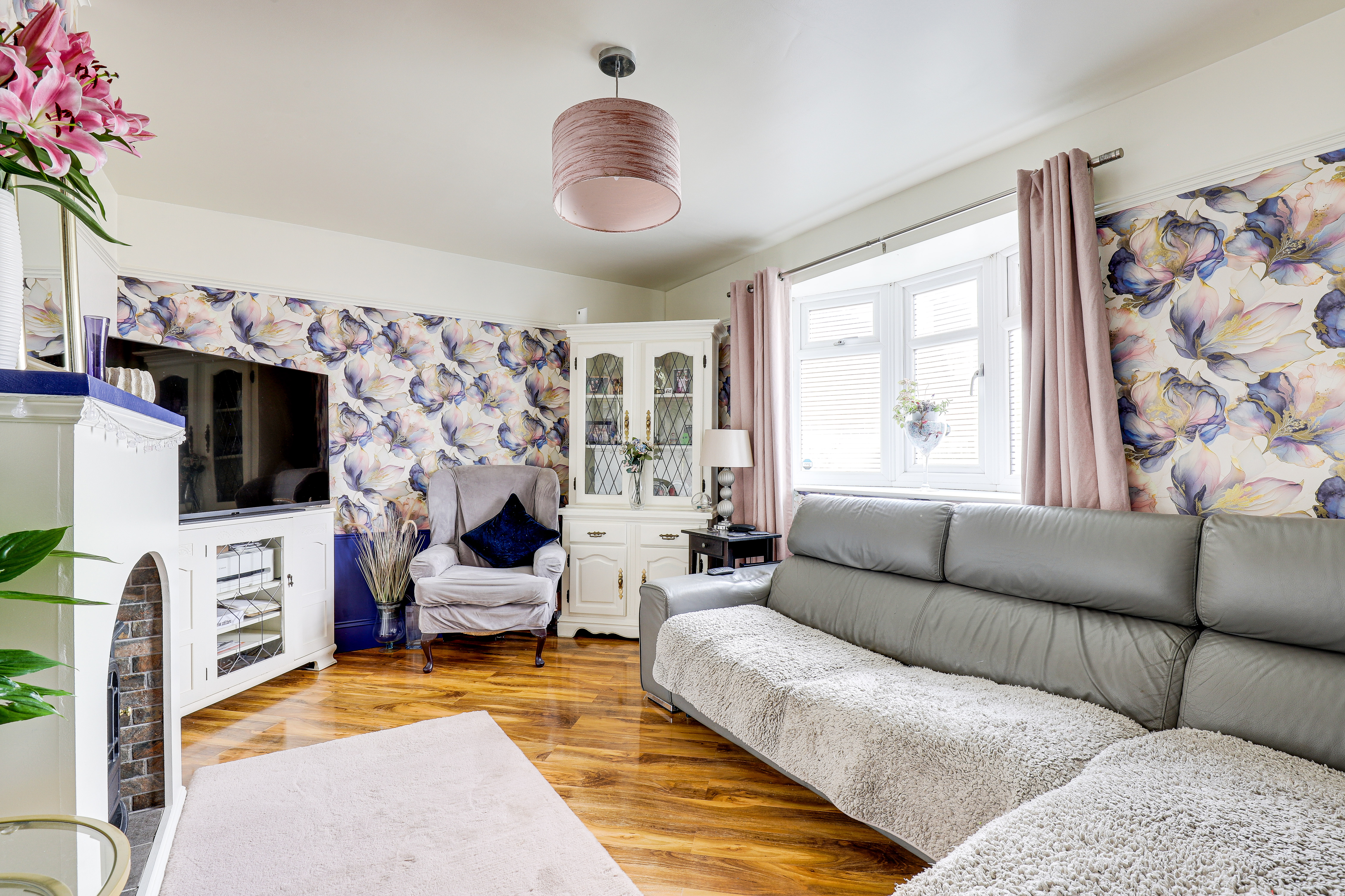 The living room has laminate flooring, a recessed feature fireplace with an electric fire and tiled hearth, a TV point, a vertical radiator a picture rail, and a UPVC double glazed bow window to the front elevation.