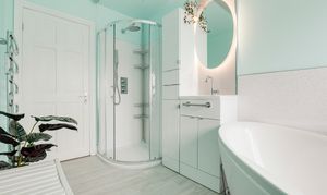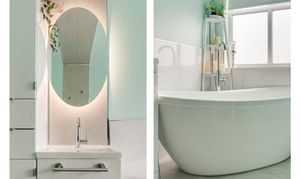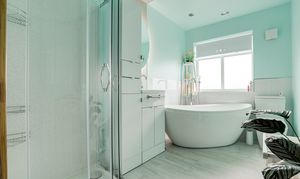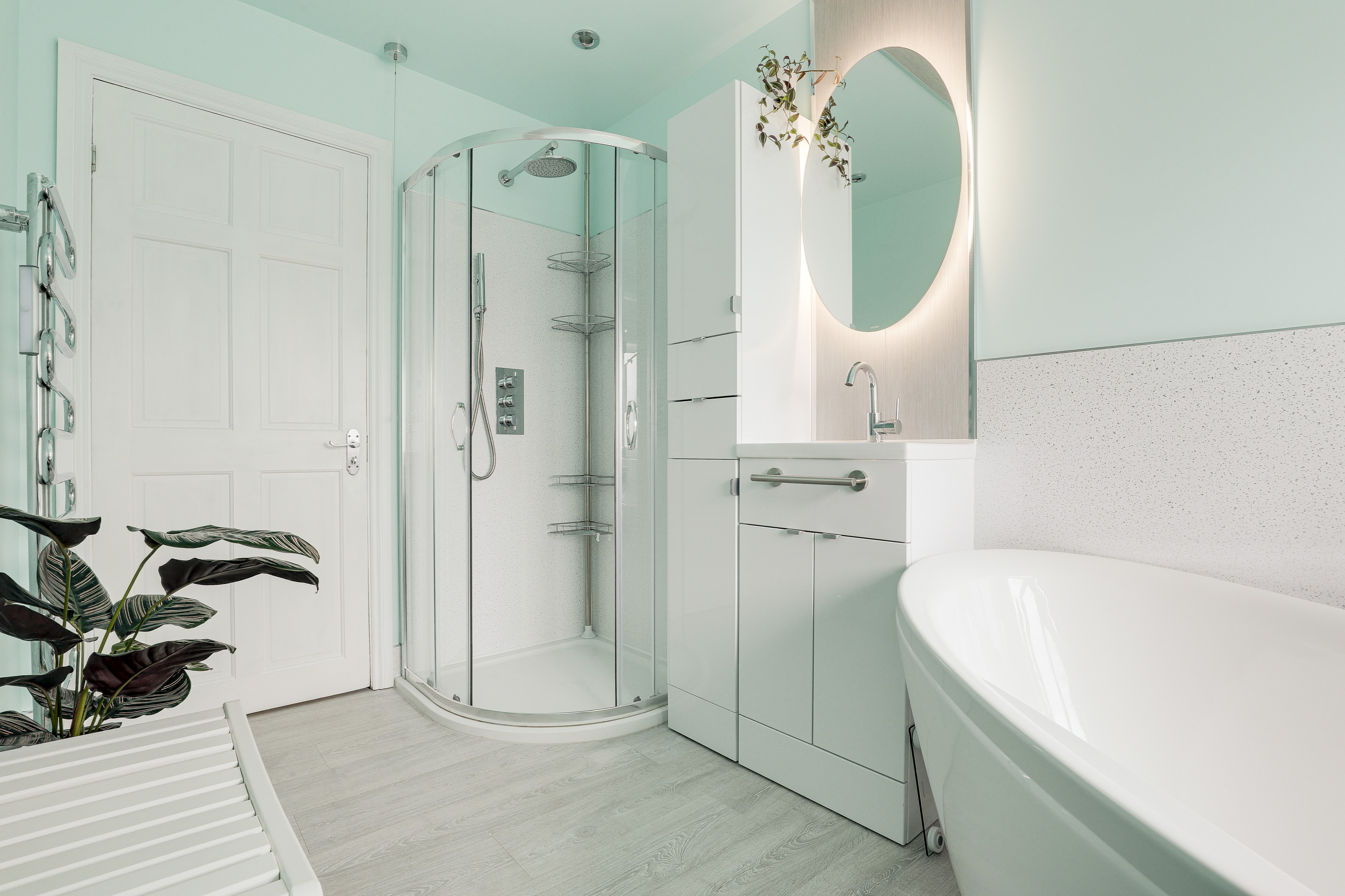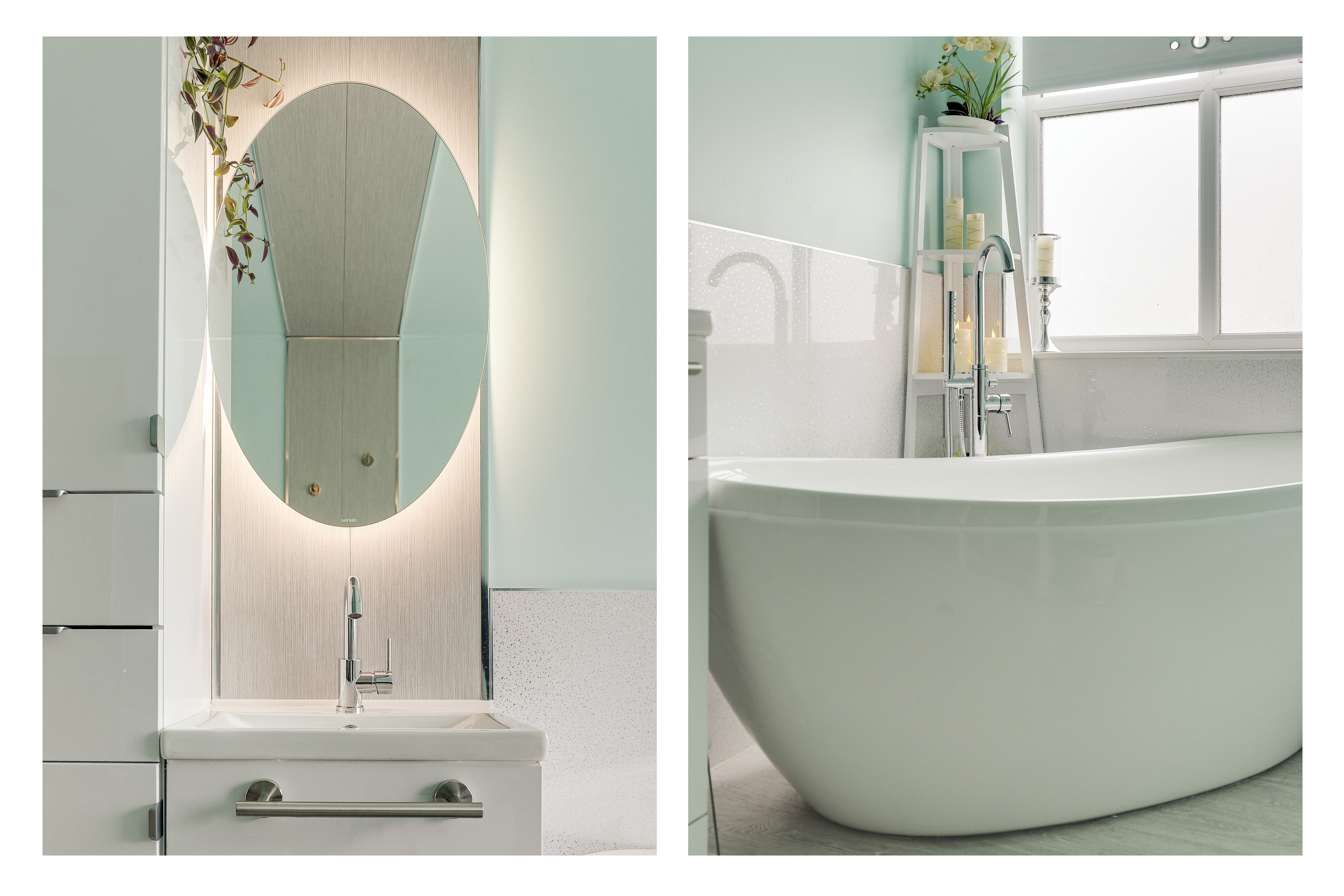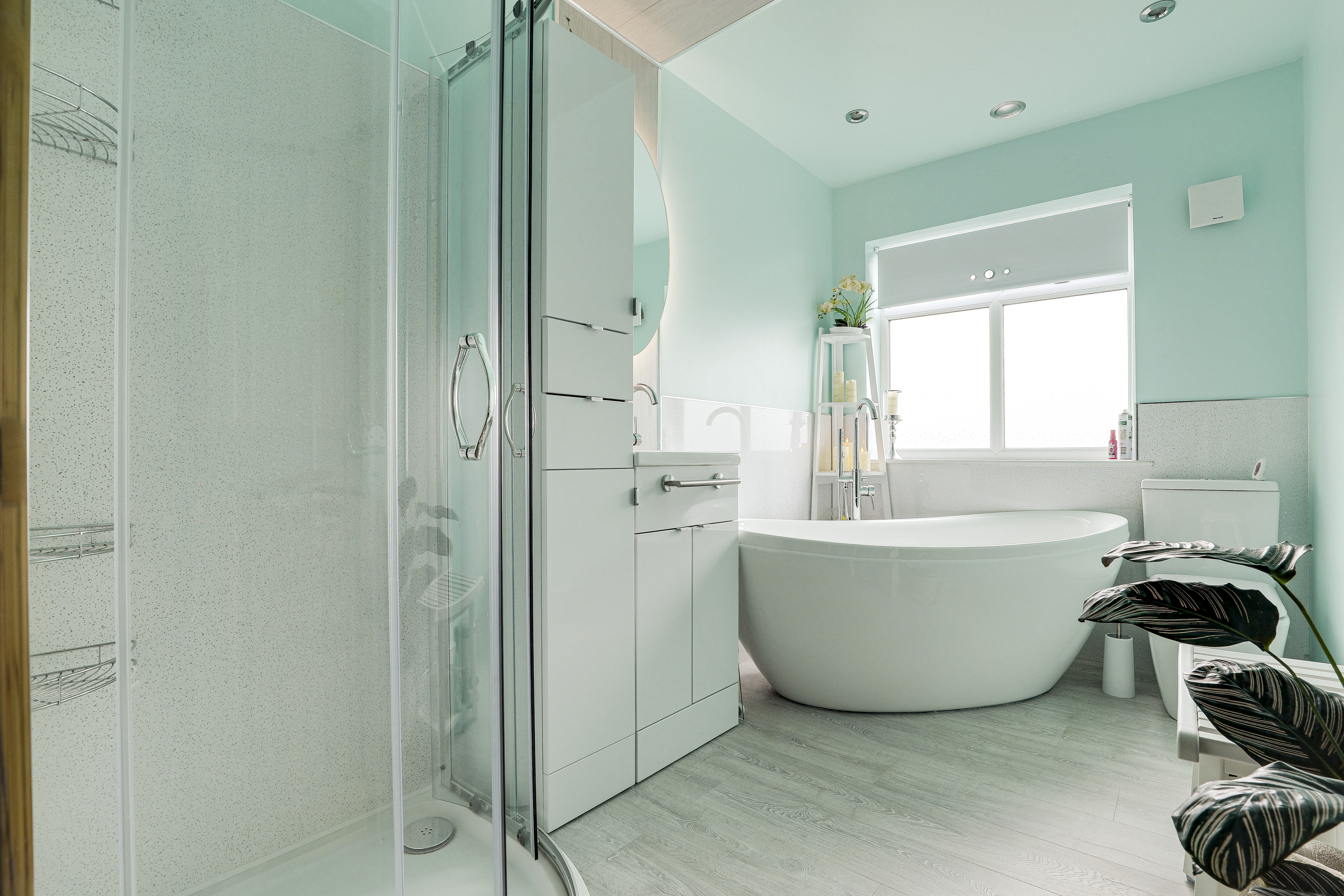 The bathroom has a UPVC double glazed window to the side elevation, a low level flush W/C, a vanity-style wash basin with a light-up mirror above, a freestanding bath with a floor-mounted swan neck mixer tap with handheld shower, a shower enclosure with a wall-mounted handheld and rainfall shower head, a chrome heated towel radiator, recessed spotlights, modern panelling in the shower enclosure, half-height panelling around the free-standing bath and behind the W/C with contrasting panelling behind the basin also up and over the ceiling and walls, and wood-effect flooring.