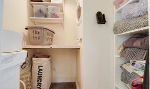 The utility room has laminate flooring, a worktop, floor to ceiling storage unit, space and plumbing for a washer dryer.