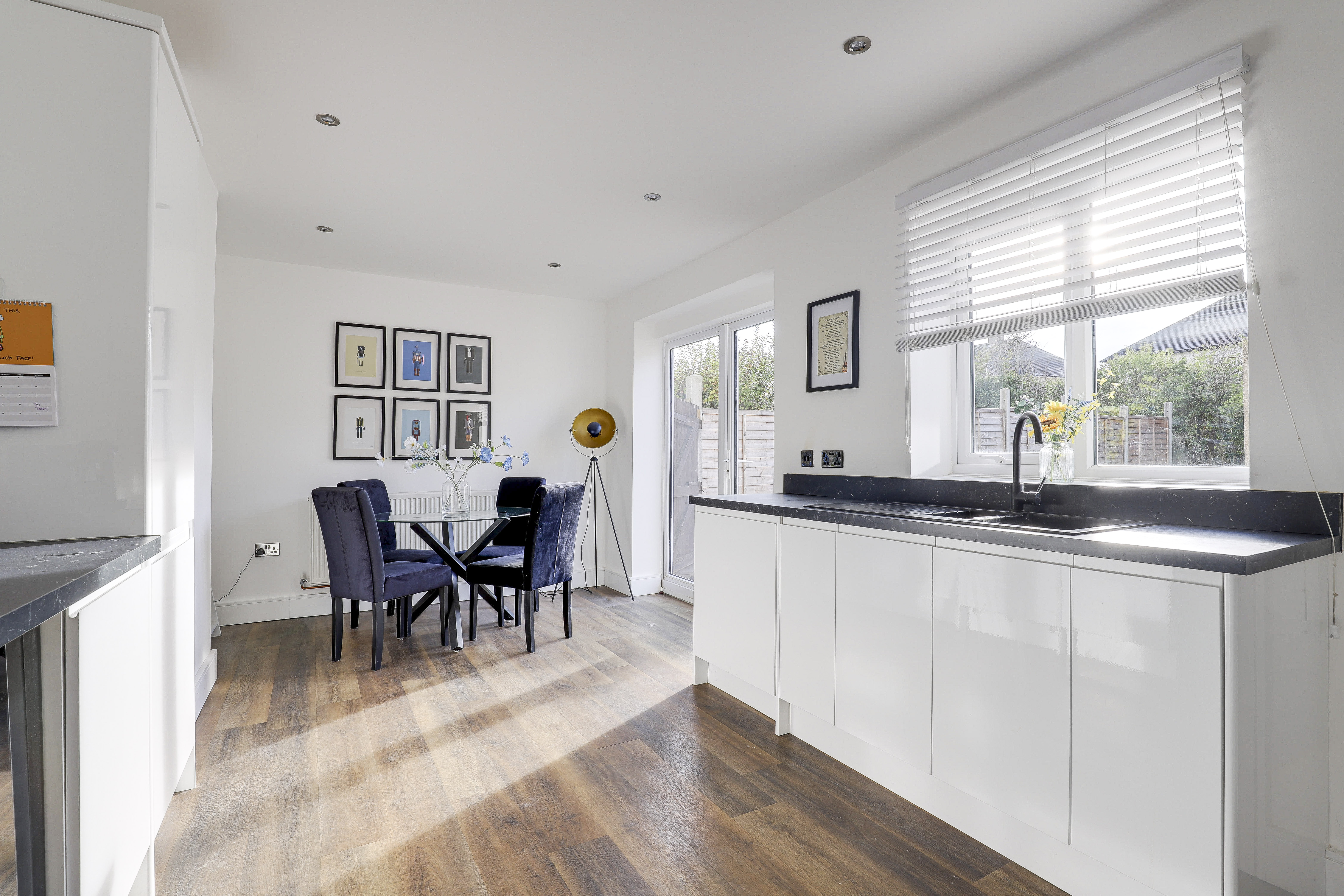 The kitchen/diner has a range of fitted base and wall units with worktops, a composite sink with a mixer tap and drainer, an integrated double oven, ceramic hob and extractor fan, an integrated wine fridge, an integrated fridge freezer, space for a dining table, recessed spotlights, wood-effect flooring, a UPVC double glazed window to the rear elevation, and a UPVC door opening to the rear garden.