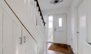 The entrance hall has a full-height UPVC double glazed obscure window to the front elevation, a radiator, wood-effect flooring, carpeted flooring, an under-stairs cupboard, and a door providing access into the accommodation.