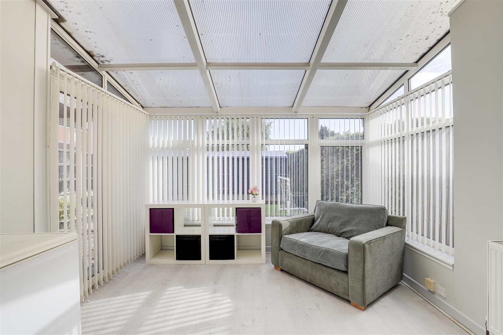 Dimensions: 3.33m x 2.99m (10'11" x 9'9"). The conservatory has wood-effect flooring, a radiator, a polycarbonate roof, UPVC double-glazed windows to the side and rear elevations, and sliding patio doors leading out to the rear garden.